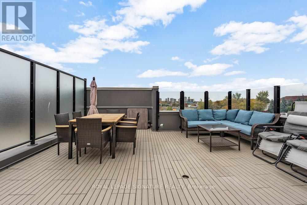 Discover refined contemporary living in a stylish, impeccably managed boutique residence tucked within the highly sought-after Topham neighbourhood-one of East York's most connected, vibrant, and community-minded enclaves! This bright and spacious 2 bed, 3-bath upper unit townhome has been thoughtfully designed with today's modern lifestyle in mind, offering a seamless blend of comfort, functionality & flair. Ideal for young professionals, creatives, or first-time buyers, it's a place that perfectly balances energy & ease. Step inside and you'll be greeted by an open-concept living/dining space w/ a walk-out to a private balcony, where expansive west-facing windows frame breathtaking sunset views and create the perfect setting to entertain. The sleek, modern kitchen features quartz countertops, a center island w/ seating, stainless steel appliances, and refined finishes that marry simplicity w/ sophistication. The primary bedroom offers a peaceful retreat with a spa-inspired 3-piece ensuite complete with a glass-enclosed shower, porcelain tiles and large vanity with quartz countertop, his/hers closets and a walk-out to a private balcony. Also on the 2nd level is a generously sized second bedroom, a beautifully appointed 4-piece family bath featuring a large vanity w/quartz countertop and soaker tub and convenient in-suite laundry facilities that bring an extra touch of ease to everyday living. The third level reveals a charming office nook, an ideal retreat for working from home. From here, step out to an expansive private terrace adorned with sleek composite flooring, elegant glass panels, and privacy fencing that creates a serene outdoor sanctuary. Complete with a gas hookup for effortless barbecuing, this impressive open-air haven is perfectly suited for intimate evenings under the stars or lively gatherings with family and friends. TTC at your doorstep, min to Hwy 404 & 401, upcoming Eglinton LRT, Eglinton Square, Shops at Don Mills, parks, schools & much more! (id:4555)