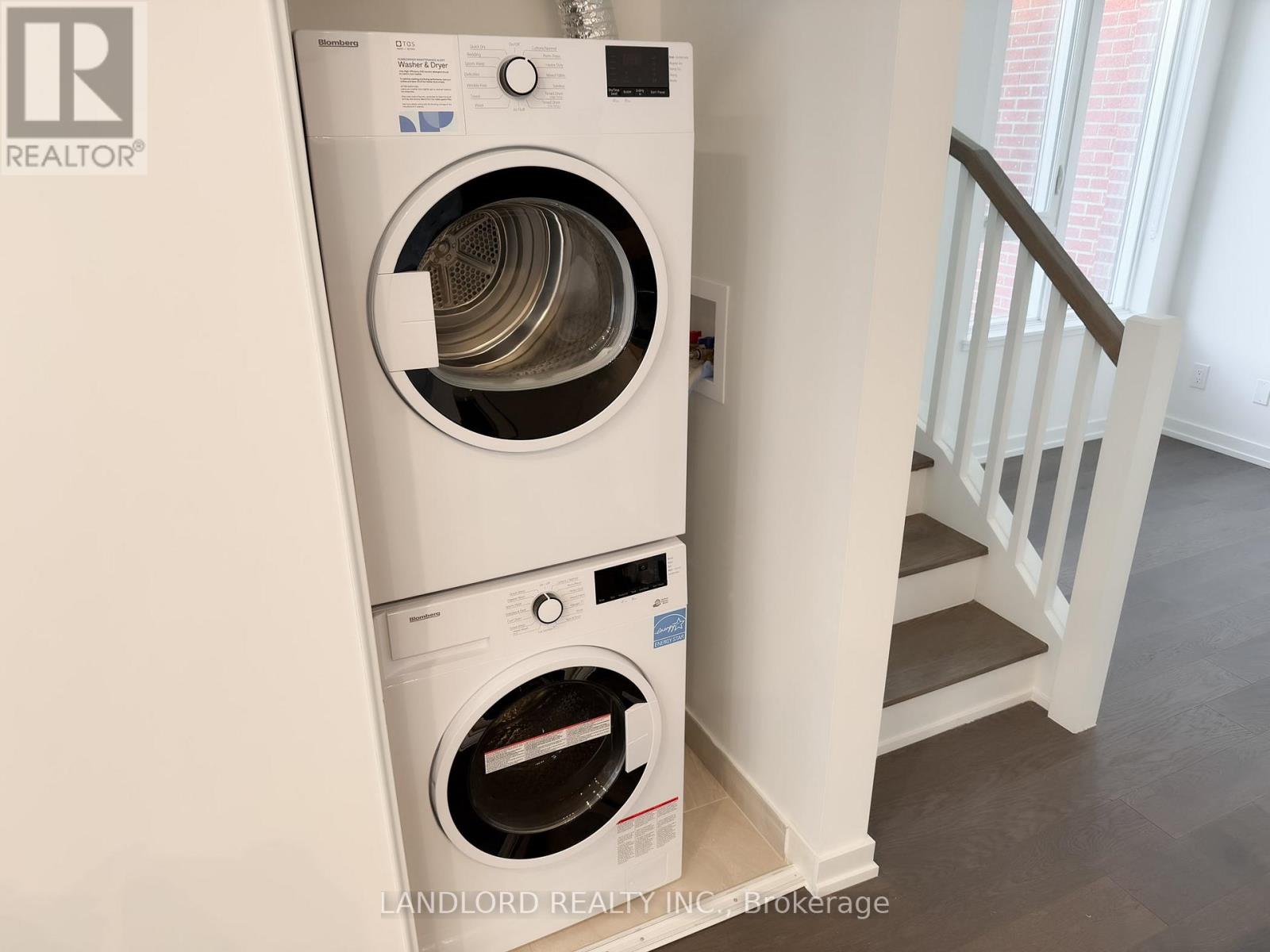 Vacant move in ready 1227 sqft unfurnished professionally managed corner two-level stacked townhouse 3-bedroom 3-bathroom plus den, part of The Keeley: A new development overlooking the lake of Downsview Park and walking distance to Downsview train & subway stations (little as ~20 minutes to downtown)! Parking and locker included. Layout is two levels, up to 9' ceiling heights, first floor consisting of open plan kitchen/living area (walking out to the building courtyard and exclusive-use semi-enclosed south facing patio) with den at base of stairs with large under-stair storage and laundry machines, and 3pc bathroom. Second floor consisting of primary bedroom (with 4pc bath, views overlooking courtyard, walk in closet), second bedroom (with built-in closet and 3pc bath), third bedroom, and third bedroom (with built in closet). Floor plans in listing images and attached to listing. Features and finishes include: engineered wood flooring throughout, stone countertops, stone backsplash, Whirlpool stainless steel appliances, Blomberg laundry machines, two-tone kitchen cabinets, tiled tub & shower stalls, pot lights, and more! || Appliances: Fridge, electric range, range microwave, dishwasher, washer, dryer. All existing window coverings. All existing light fixtures. || Building Amenities: Refer to listing images to see all! || Utilities: Metering of utilities by Carma. (id:4555)