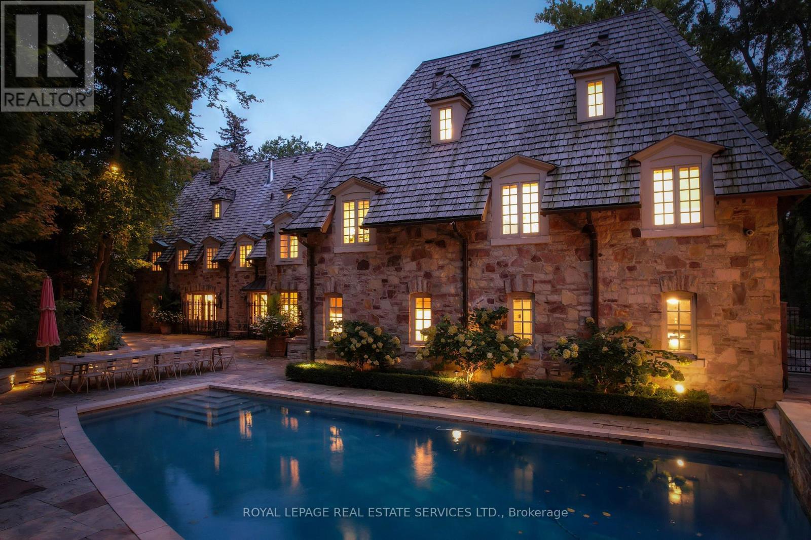 As one of Toronto's original landmark estates, the 'Rosewood Estate' sets the bar for uncompromising luxury in the city. Tucked discreetly at the end of a quiet cul-de-sac, the residence rests on a sprawling 1.12 acre private ravine lot. Reimagined in 2019 by acclaimed architect Lorne Rose, with interiors by Dvira Interiors, and built to exacting standards by JTF Custom Homes, the home is a masterclass in vision, craftsmanship, and enduring design. The approach is cinematic: a stone and wrought iron fence opens to manicured gardens, mature maple trees, and imported European planters that frame the limestone façade and cedar roofline. A heated drive and walkways lead to grounds designed for both grandeur and privacy, where an elegant saltwater pool, cabana, outdoor kitchen, fireplace, and a full sports court are seamlessly woven into the landscape. The gardens dissolve into a lush ravine backdrop, offering rare tranquility within the city. Inside, nearly 12,000 square feet of living space unfolds with quiet confidence. Timeless custom crown moulding and wainscoting, hand-carved marble fireplace mantels, and imported European wallpaper and hardware create a layered, textural narrative throughout. Built-in cabinetry and vanities by Falcon Kitchens anchor the principal rooms, while marble counters, bespoke lighting, custom drapery, and automated blinds reflect meticulous attention to detail. The chef's kitchen is equipped with a suite of luxury appliances, including a La Cornue range, and flows effortlessly into both formal living spaces designed for modern family life. The upper levels offer five serene bedrooms, including a primary retreat with soaring vaulted ceilings, dual bespoke dressing rooms, and a lavish marble-clad ensuite. The lower level rivals a private club, complete with a state-of-the-art theatre, glass-enclosed gym, recreation spaces, a nanny suite, and a large laundry room. Rosewood Estate is not merely a residence, it is a legacy property. (id:4555)