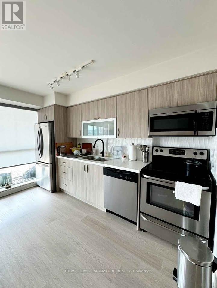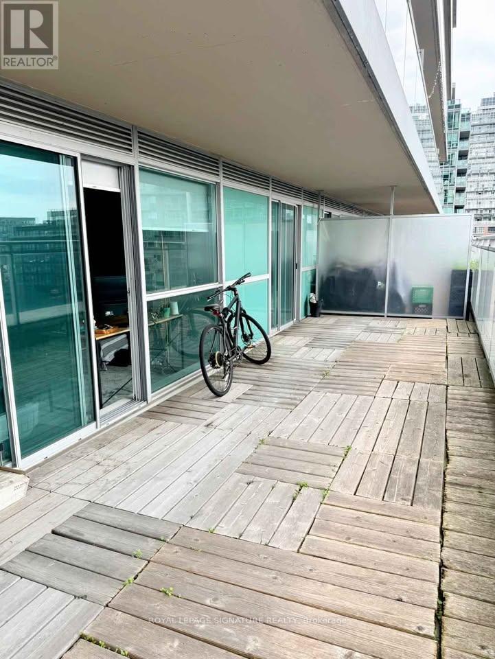 A stylish and sun-filled South West facing residence in the heart of Liberty Village offering the perfect balance of comfort, functionality, and vibrant urban living.This beautifully 1-bedroom plus den suite features 603 sq.ft of thoughtfully designed interior space, complemented by an impressive terrace of approximately 300 sq.ft. with stunning west-facing views capturing sunsets, neighbourhood energy, and glimpses toward the lake. Floor-to-ceiling windows flood the home with natural light, while new vinyl flooring, sleek pot lights, and an updated bathroom vanity create a clean, modern aesthetic throughout.The open-concept kitchen and living area form the heart of the home - ideal for both everyday living and entertaining. The kitchen is equipped with stainless steel appliances and an oversized movable island with a breakfast bar for added flexibility. The seamless flow into the dining and living space creates a welcoming great room perfect for hosting or unwinding.The spacious bedroom offers generous closet space and direct walk-out access to the terrace, creating a peaceful indoor-outdoor retreat. The separate den provides a versatile space ideal for a home office, nursery, reading nook, or creative studio.Partially furnished and move-in ready, the suite includes: an entrance mirror, a dining table, a floor lamp in the living room, an IKEA bookshelf in the den, and a bedframe in the bedroom.Ensuite laundry with shelving is included for added convenience.24-hour security and concierge, indoor pool, hot tub, fully equipped gym, yoga studio, billiards lounge, games room, cyber lounge, private theatre, party room, BBQ area, guest suites, and visitor parking - all within a professionally managed building.Located steps from grocery stores, fitness studios, TTC, GO Station, waterfront trails, Exhibition Place, and more. (id:4555)