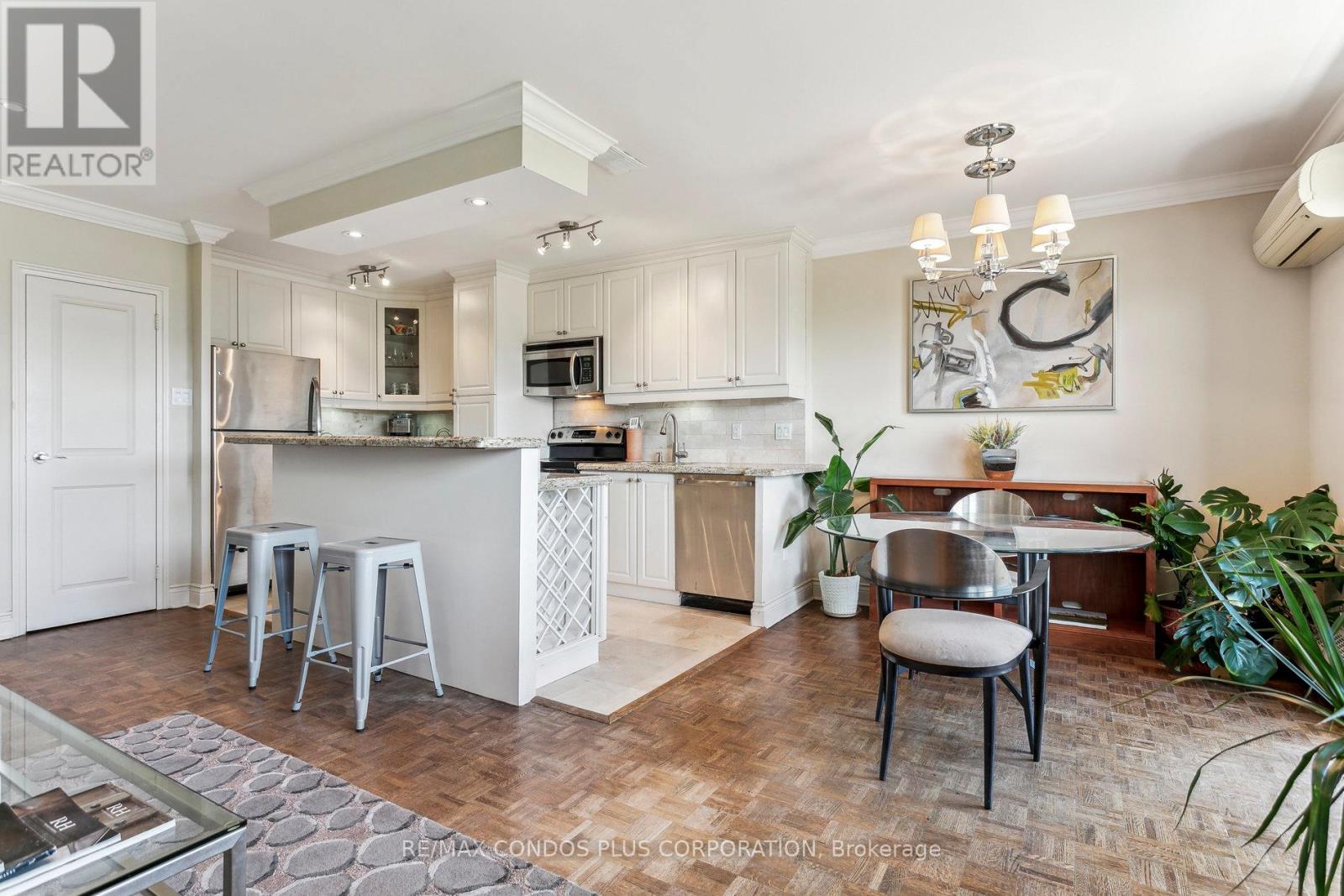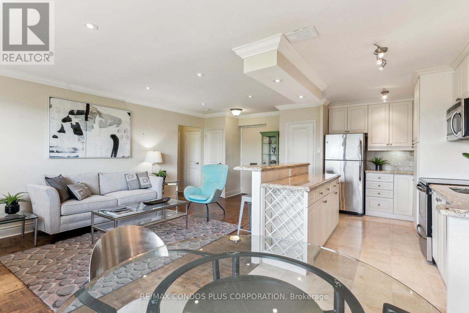 Value-Space-Location! Top Floor, 735 Sq. Ft. 1 Bdrm. SAVE W/$628.69 All inclusive monthly maint. & Taxes ,Not a Co-op - Dining Room W/Sliding door W/O to Private 142 Sq Ft Balcony-only 3 one BR units have this size Balcony. Superb bright S/W Panoramic View on Quiet North York residential Street W/Multi million dollar Townhomes. This full Reno Total Custom Upgraded unit W/continuing updates to present HAS Large thermal windows-smooth ceilings-crown moldings-7in. baseboards. 2 Panel doors-Recessed lighting & tracks-Updated Electrical W/Extra Decora wall outlets & Dimmer Switches- High end finishes. 13 Ft Granite Counters. Kit w/4 SS Appliances-12 drawers-abundant storage upper Cabinets - spacious Base cabinets -Chrome Lazy Susan-Slat wood Wine rack. Large Breakfast bar, Travertine stone Backsplash & Flooring. Ready for Gourmet cooking & Sumptuous entertaining--before strolling to the private 31.8 ft Balcony Painted, Furnished & Updated W/Protective netting April 2025 to enjoy a beautiful evening view. Short walk to LRT. Bermondsey & Victoria Park NEW stops, Minutes to ALL amenities in multiple Plazas Plus Bus to Downtown. East parking lot entrance has wheelchair accessibility, easy access to lockers, furniture moving and in and out & deliveries. Note low ALL inclusive means Heat, Hydro, Water, A/C, Parking, Locker & Property Taxes. Do not miss out on this markets amazing opportunity. NOT A CO OP. NO SHARES. NO BOARD APPROVAL Motivated Seller (id:4555)