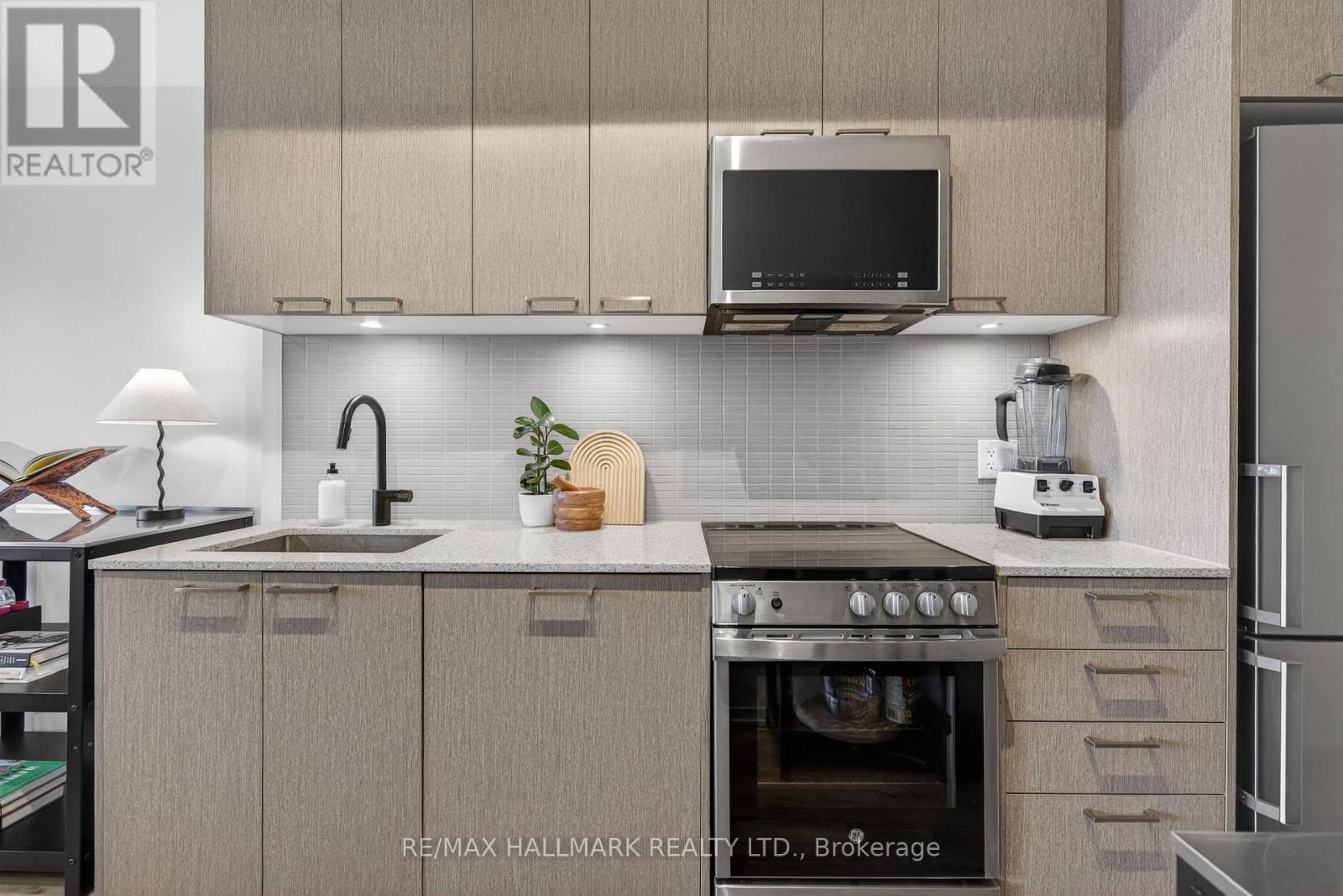 Welcome to elevated urban living in a connected and growing west-end community. This beautifully designed one bedroom plus oversized den suite offers 665 square feet of highly functional space, ideal for professionals, first-time buyers, or downsizers seeking comfort and convenience. The open-concept layout flows seamlessly from the modern kitchen into a bright living and dining area, creating an inviting space to relax or entertain. Floor-to-ceiling windows fill the suite with natural light, while the private balcony overlooks a quiet residential neighbourhood that becomes a lush canopy of mature trees in the summer months, offering a rare sense of calm in the city. The spacious primary bedroom provides a peaceful retreat, and the generous den is large enough to function as a dedicated home office, guest space, or flexible bonus room. A well-appointed four-piece bath completes the interior. Residents enjoy an impressive collection of building amenities including a fully equipped fitness centre, stylish party room, co-working lounge, outdoor terrace with BBQ area, and thoughtfully designed common spaces that make working from home or hosting friends effortless. High-speed internet is included in the maintenance fees. Unmatched connectivity puts the city at your doorstep with easy access to the GO Train, UP Express, and the future Old Weston SmartTrack line, along with nearby streetcar routes and major commuter corridors. Whether heading downtown, to Pearson Airport, or across the GTA, getting where you need to go is simple. A smart investment in both lifestyle and location. *High-speed internet is included in the maintenance fees, ideal for remote work or streaming.* (id:4555)