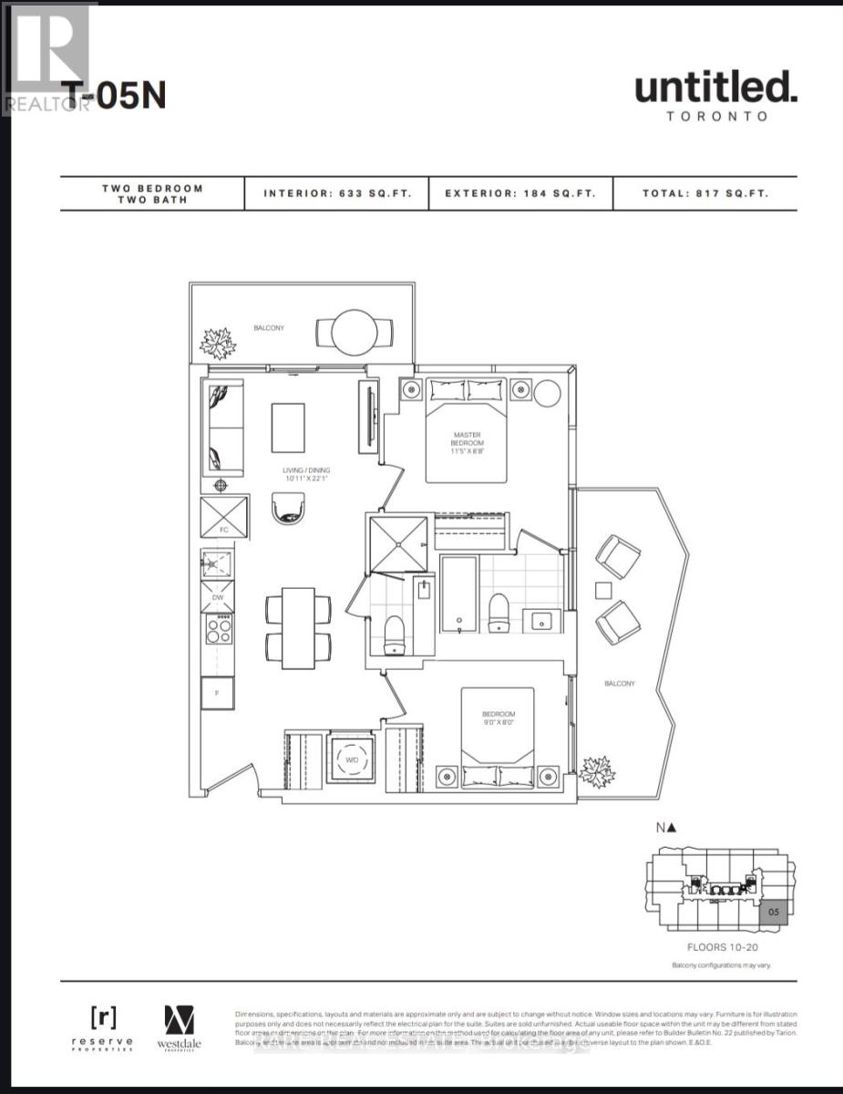 *Pictures are Virtually Staged* Total 817 Sq Ft (633 Sq Ft Interior and 184 Sq Ft for Balconies). Welcome to Untitled Condos, a distinctive residence designed in collaboration with Pharrell Williams. Inspired by Japanese Zen principles, this thoughtfully designed suite blends timeless architecture with calming natural elements. Featuring a bright and functional split-bedroom layout, the unit offers floor-to-ceiling windows and two private balconies that enhance natural light and outdoor living.The open-concept living and dining area flows seamlessly into a contemporary kitchen with integrated appliances and modern finishes. The spacious primary bedroom includes a private ensuite and its own balcony. Residents enjoy access to exceptional amenities including an indoor/outdoor pool, jacuzzi, sauna, fitness centre, yoga studio, and basketball court.Ideally located steps to the Toronto Subway Line 1, the Eglinton Crosstown LRT, top-rated schools, restaurants, cafés, shops, and parks. *Parking and Locker is included in the price* (id:4555)