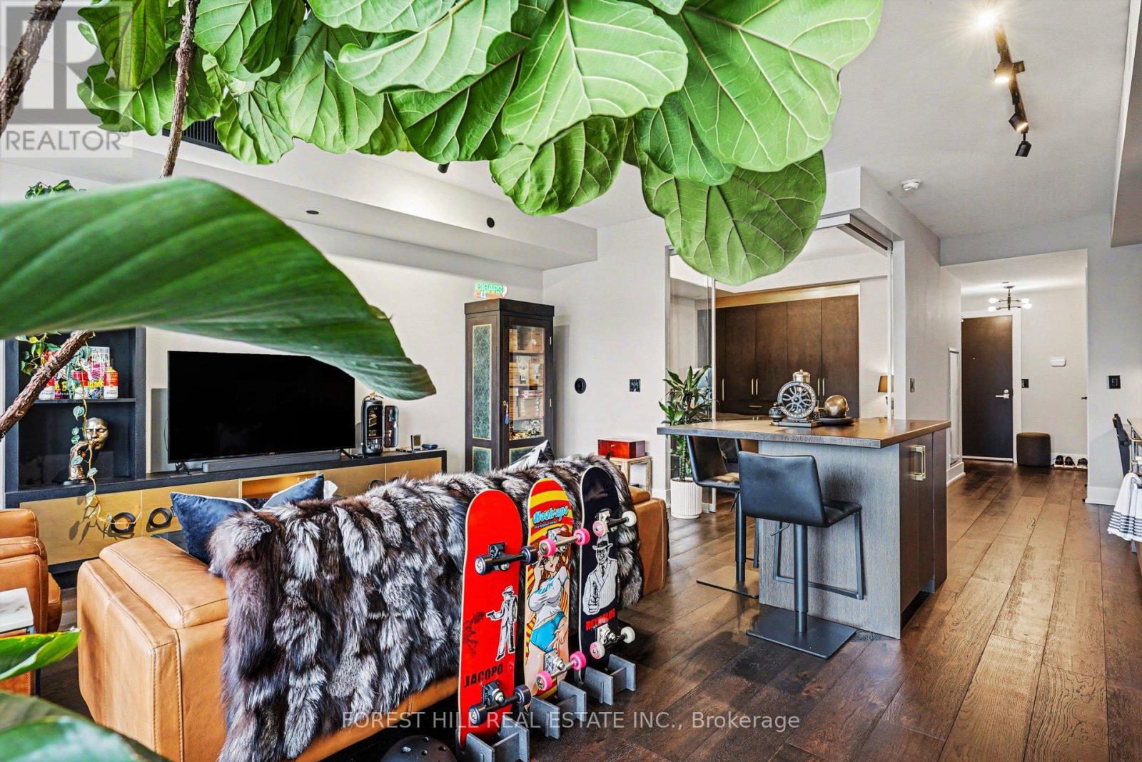 Bright and modern 1- bedroom & Den condo in one of Toronto's most desirable neighborhoods. Elegant hardwood floors flow throughout the open -concept living and dining area, enhance by floor-to-celling widows that fill the space with natural light and frame city view. The modern kitchen features stainless steel appliances and ample cabinet, perfect for cooking or entertaining. The versatile den can serve as a home office or creative space. Step out to your into your private balcony to enjoy fresh air and city vibe, includes one private underground parkin spot for added convenience. located steps from transit, shops, restaurant, and cultural amenities, this unit combines style, functionality, and the perfect balance of city living and personal comfort. Ready to move in and enjoy!Additional touches included in: select furniture and build -ins such as the TV console, office desk, Livingroom crouches, and coffee table, bedroom bed, mattress, and two night tables are included. The Fiddle leaf fig tree may remain to enhance. Its optional to remain and it will be decided between Landlord and Tennant. (id:4555)
