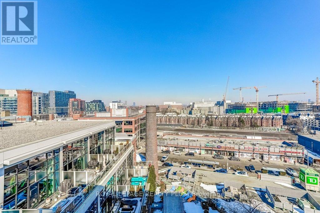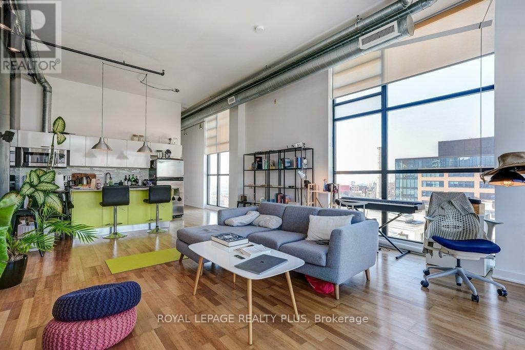 Rarely offered penthouse corner loft at the iconic Toy Factory Lofts. This northwest-facing showpiece delivers lake and skyline views from an expansive 270-degree balcony - a true standout in today's condo market.Soaring 12' ceilings and dramatic floor-to-ceiling windows flood the space with natural light, highlighting the authentic character and scale that only a true hard loft can offer. The airy, open-concept layout is ideal for both entertaining and elevated everyday living.The designer Scavolini kitchen makes a bold statement with a marble island, sleek high-gloss cabinetry, and refined finishes that blend modern sophistication with industrial edge. Custom blinds and striking Sun Project architectural shades add both style and comfort.The spacious bathroom features a limestone vanity, oversized mirror, and built-in shelving, creating a clean, spa-inspired retreat.Includes 1 underground parking space - a rare and valuable convenience in Liberty Village. Located in one of Toronto's most sought-after boutique loft conversions, steps to top restaurants, cafés, fitness studios, parks, transit, and the waterfront.Penthouse. Corner exposure. Iconic building. Parking included. Exceptional views. Opportunities like this are limited - secure your place in one of the city's most desirable loft communities. (id:4555)