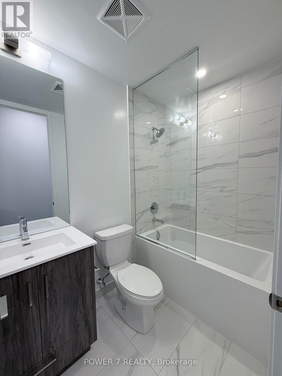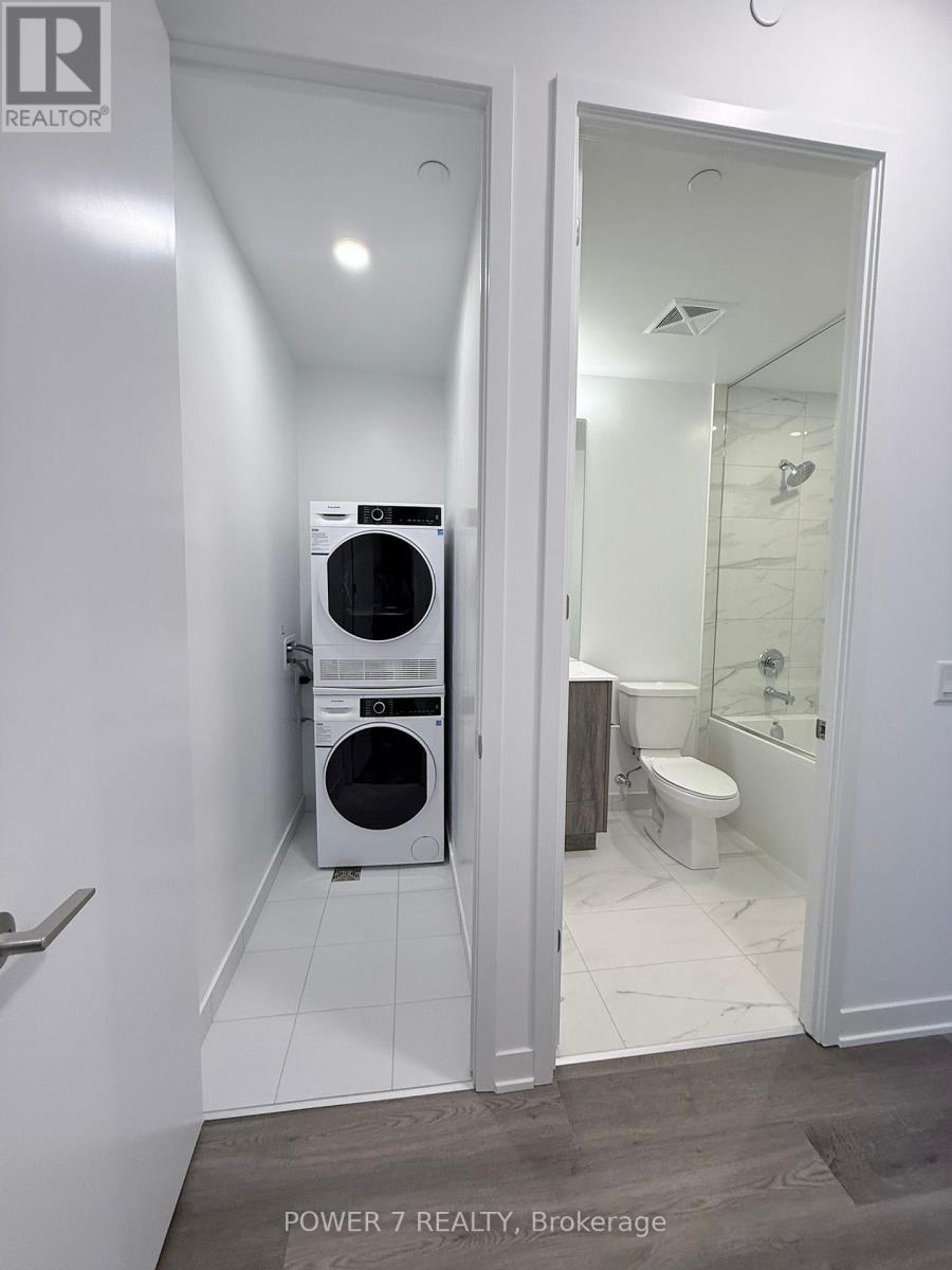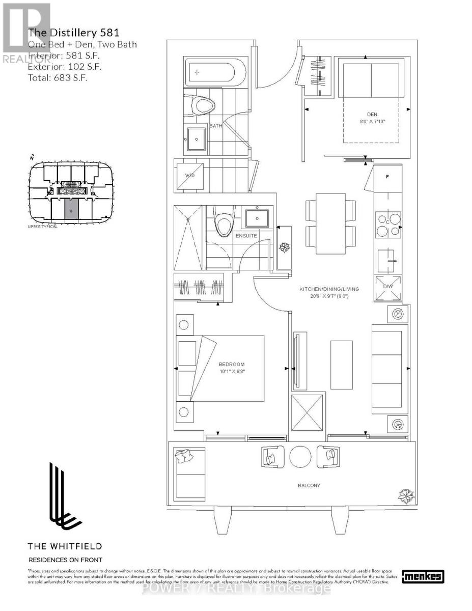 One-of-a-kind 1+den, 2-bath suite at The Whitfield by Menkes, offering contemporary finishes, smart layout and a private balcony in the heart of downtown's St. Lawrence neighborhood. Welcome to 180 Front St E #2308 at The Whitfield Residences on Front, a striking 45-storey landmark by Menkes and Core Development, perfectly positioned at Front & Sherborne with effortless access to the Financial District, Union Station, the Esplanade, St. Lawrence Market, Distillery District, Scotiabank Arena and the waterfront. This well-designed "Distillery 581" floor plan offers approximately 581 sq.ft. of interior living space plus a generous 102 sq.ft. balcony (total 683 sq.ft.), featuring an open-concept kitchen/dining/living area, separate bedroom with closet, two full bathrooms and a highly functional den that works beautifully as a home office or guest space. The sleek linear kitchen showcases custom two-tone cabinetry, quartz counters, porcelain slab backsplash, integrated brand-name appliances and an Energy Star stacked washer/dryer, all framed by floor-to-ceiling, energy-efficient windows that flood the suite with natural light. (id:4555)