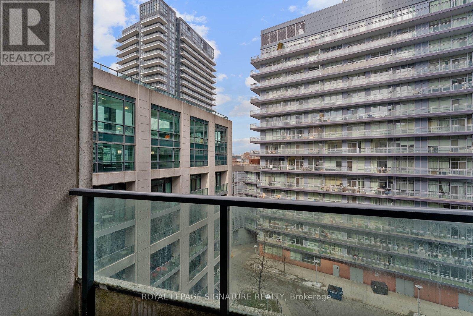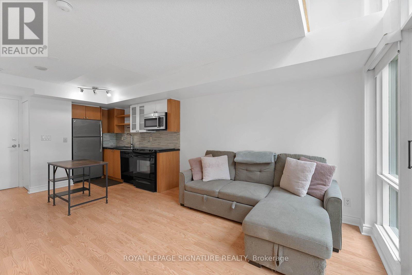 Turn-key and freshly painted, this bright two-storey suite offers a functional layout and exceptional natural light. The kitchen is generously sized and overlooking the living room, creating an open and connected main living space . The living room features a walk-out to the balcony and dramatic two-storey, floor-to-ceiling windows that fill the suite with natural light. A convenient 2-piece powder room completes the main level. Upstairs, the spacious bedroom includes in-suite laundry and a private ensuite bath, offering a comfortable and practical retreat. Ideally located close to everyday amenities, with Loblaws across the street and the Fleet streetcar at your doorstep. Enjoy being minutes from the waterfront and green space at Coronation Park. Parking and locker included. (id:4555)