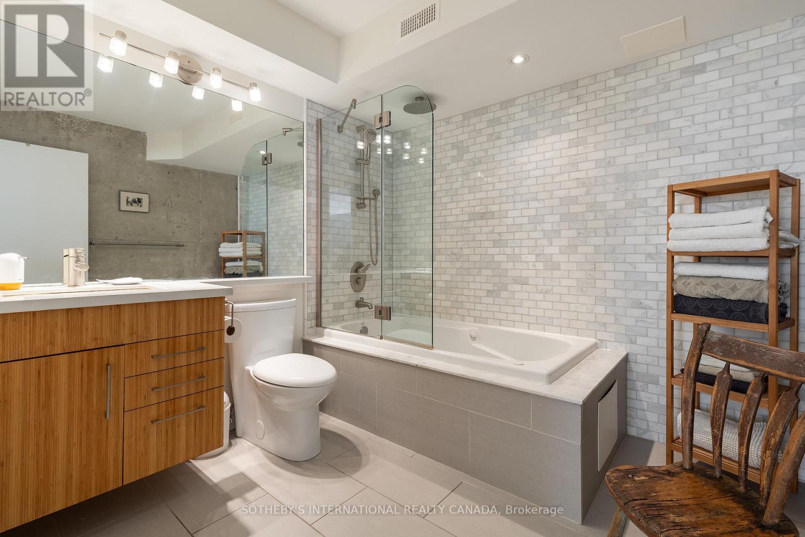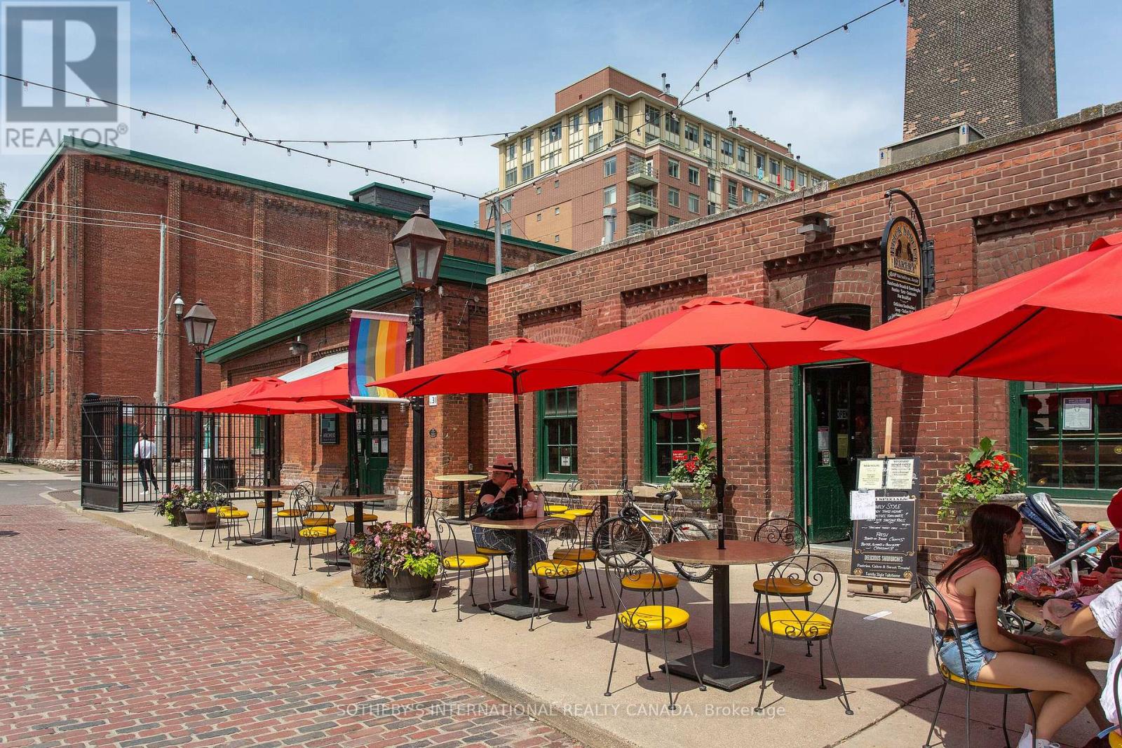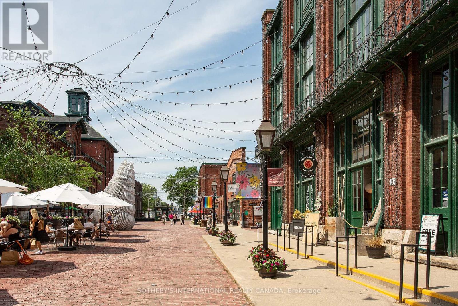 Offering a composed expression of city living with the historic Distillery District, this fully furnished two bedroom, two bathroom suite is thoughtfully arranged as a turnkey short term residence, designed for ease, comfort and flexibility. Hardwood floors and integrated millwork create a cohesive interior, while the updated kitchen anchors the living space with a centre island, bamboo cabinetry, stainless steel appliances, and generous preparation space. Natural light moves easily through the combined living and dining areas, framed by floor to ceiling south facing windows and a walkout to a large private balcony. The suite's split bedroom plan provides both privacy and adaptability. The primary bedroom features a walk in closet, a well proportioned ensuite bathroom, and a quiet south facing outlook. The second bedroom offers versatility as a guest room, office, or extended living space, also benefiting from southern exposure. Warm materials, refined finishes, and an intuitive layout establish a calm contemporary atmosphere. Offered fully furnished and configured for short term occupancy, the suite is ideally suited for executives, relocations, and professionals seeking a refined, turnkey residence in the city. Positioned within one of Toronto's most distinctive neighbourhoods, the Distillery District's cobblestone streets, galleries, cafés, and restaurants unfold just outside the door. Convenient access to the Financial District, St Lawrence Market, King East, transit, and major routes further enhances its ease of living. Parking and a bicycle are included. (id:4555)
