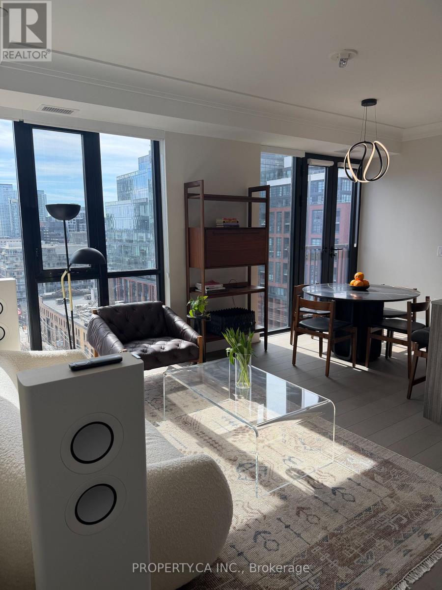 Experience refined urban luxury living at 123 Portland, a Parisian-inspired boutique residence by Mintos in the heart of the King West Fashion District. This exquisitely furnished 3-bedroom, 2-bathroom corner suite showcases 9-foot ceilings, wide-plank hardwood flooring, custom lighting, and thoughtfully curated designer finishes throughout. The chef-inspired kitchen is anchored by an oversized island and integrated Miele appliances, seamlessly flowing into a bright open-concept living and dining space with captivating city views from three separate Juliette balconies. The primary suite offers three custom built-in closets and a private 3-piece ensuite, creating a serene and functional retreat. Enjoy smart home technology with digital entry and thermostat control, just steps from the premier dining, shopping, and vibrant nightlife along King Street West. (id:4555)