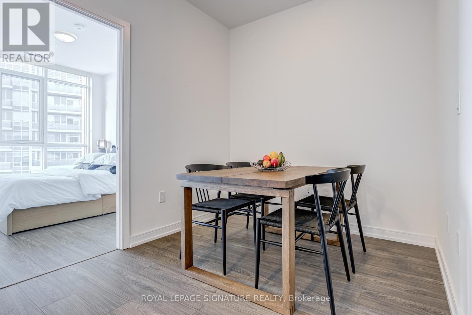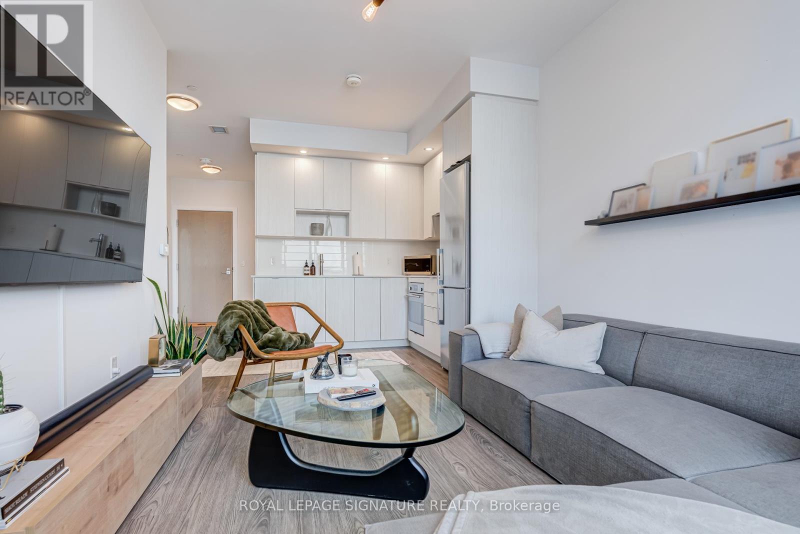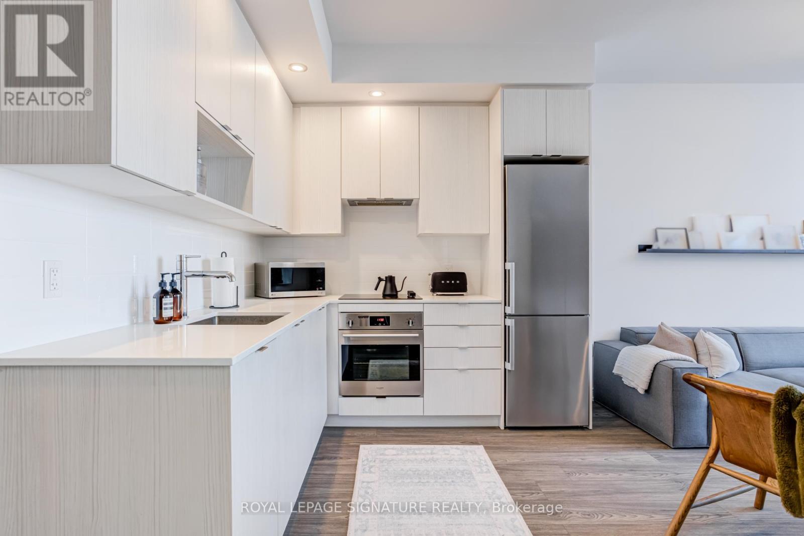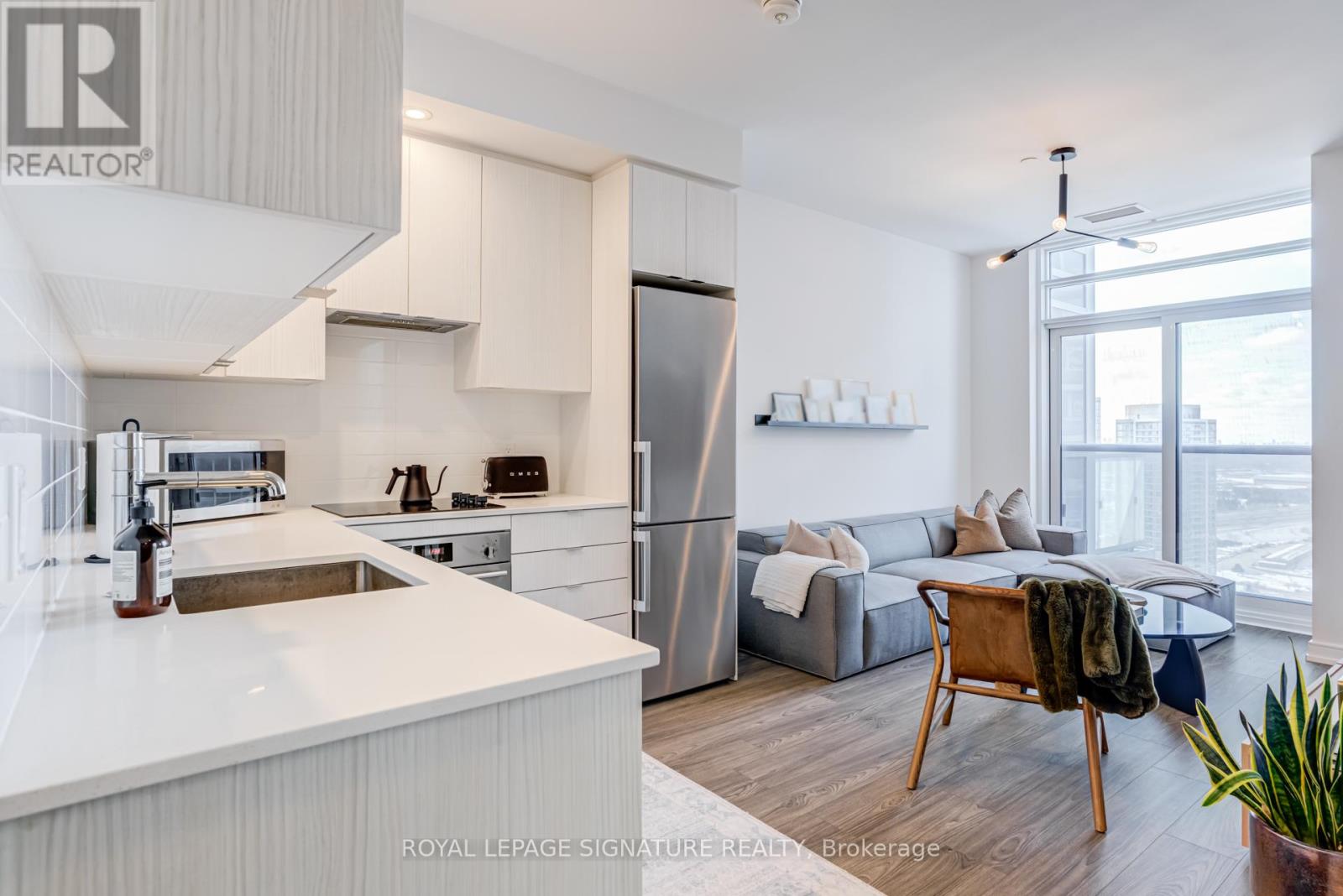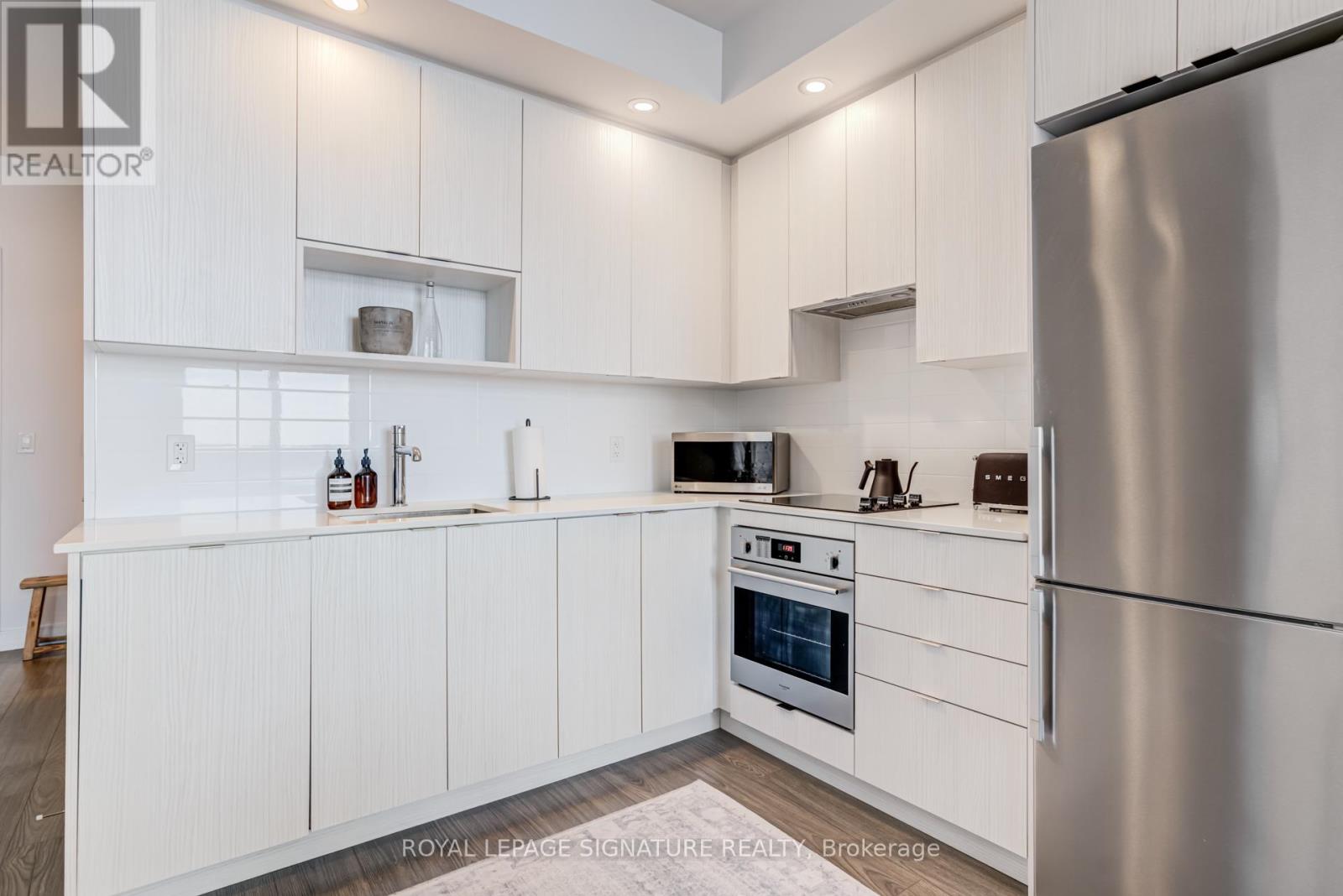 Bright penthouse unit with 9 ft ceilings and a smart, open-concept layout. Floor-to-ceiling windows bring in tons of natural light and open to a Juliette balcony for fresh air and city views. Modern kitchen with integrated appliances and quartz countertops, comfortable bedroom, and a sleek bathroom. Includes a prime parking spot with a column on one side and no adjacent vehicle on the other, offering extra space and easy access. Well-managed building with great amenities, steps to TTC, parks, shopping, and quick access to the 401. Effortless, low-maintenance living in a prime location. (id:4555)