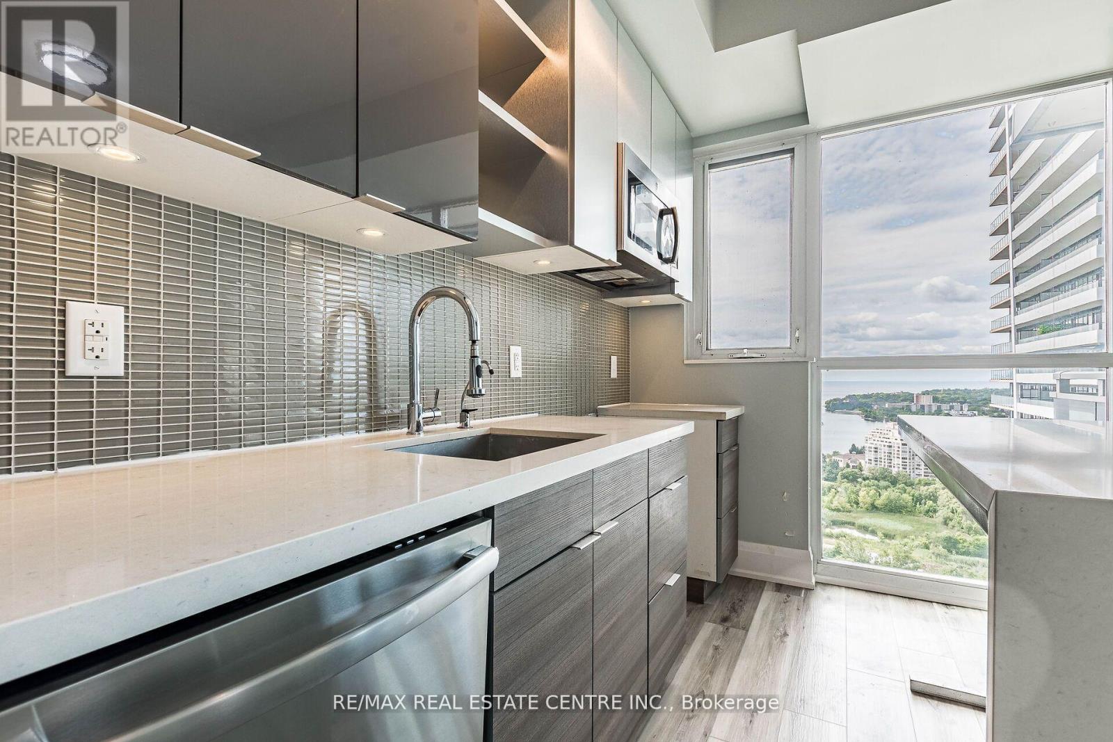 LUXURY UPSCALE EXECUTIVE WATER FRONT CONDO., LOWEST PRICED TWO BEDROOMS IN THE BUILDING.HIGH 26TH FLOOR OFFERS SOUTH WEST VIEW OF THE WATER AND MARINA. TWO GOOD SIZED BEDROOMS, TWO FULL BATHS, OPEN BALCONY, ENSUITE LAUNDRY, KITCHEN ISLAND, BUILT-IN APPLIANCES, NEW VINYL FLOORING IN THE ENTIRE UNIT, FRESHLY PAINTED. HIGH 9 FT. CEILING. ONE PARKING AND ONE LOCKER INCLUDED. 24 HOURS LIVE GUARDS. (id:4555)