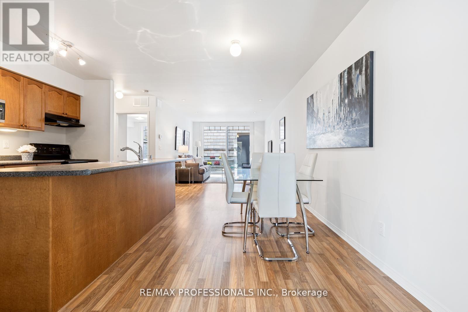 Welcome to the Lofts on 29th, a boutique 40 unit townhouse complex in the heart of Long Branch offering a rare ground floor suite with versatile live/work potential. This spacious 2 bedroom 1 bath home features a flexible front room that can serve as an office, studio or professional space with direct street access OR the seller is willing to enclose the space to provide a true second bedroom if preferred. The open concept kitchen features a large centre island, double sink and breakfast bar flowing seamlessly into the dining and living areas with laminate floors, pot lights and flat finished ceilings. A walkout leads to a private patio with exclusive direct entry into the underground parking garage and bike storage - a unique & convenient feature enjoyed by only a handful of units! Upgrades include California shutters and recently replaced windows and sliding doors. The primary bedroom is generous in size and the unit also includes ensuite laundry. Perfectly located in a vibrant and fast developing neighbourhood with TTC at your doorstep and close to Long Branch GO station, parks, the lake, restaurants, schools and easy access to highways, this home offers the ideal blend of convenience, lifestyle and value in one of Toronto's most desirable lakeside communities. ** Seller is willing to enclose the front room to a 2nd bedroom upon request** (id:4555)