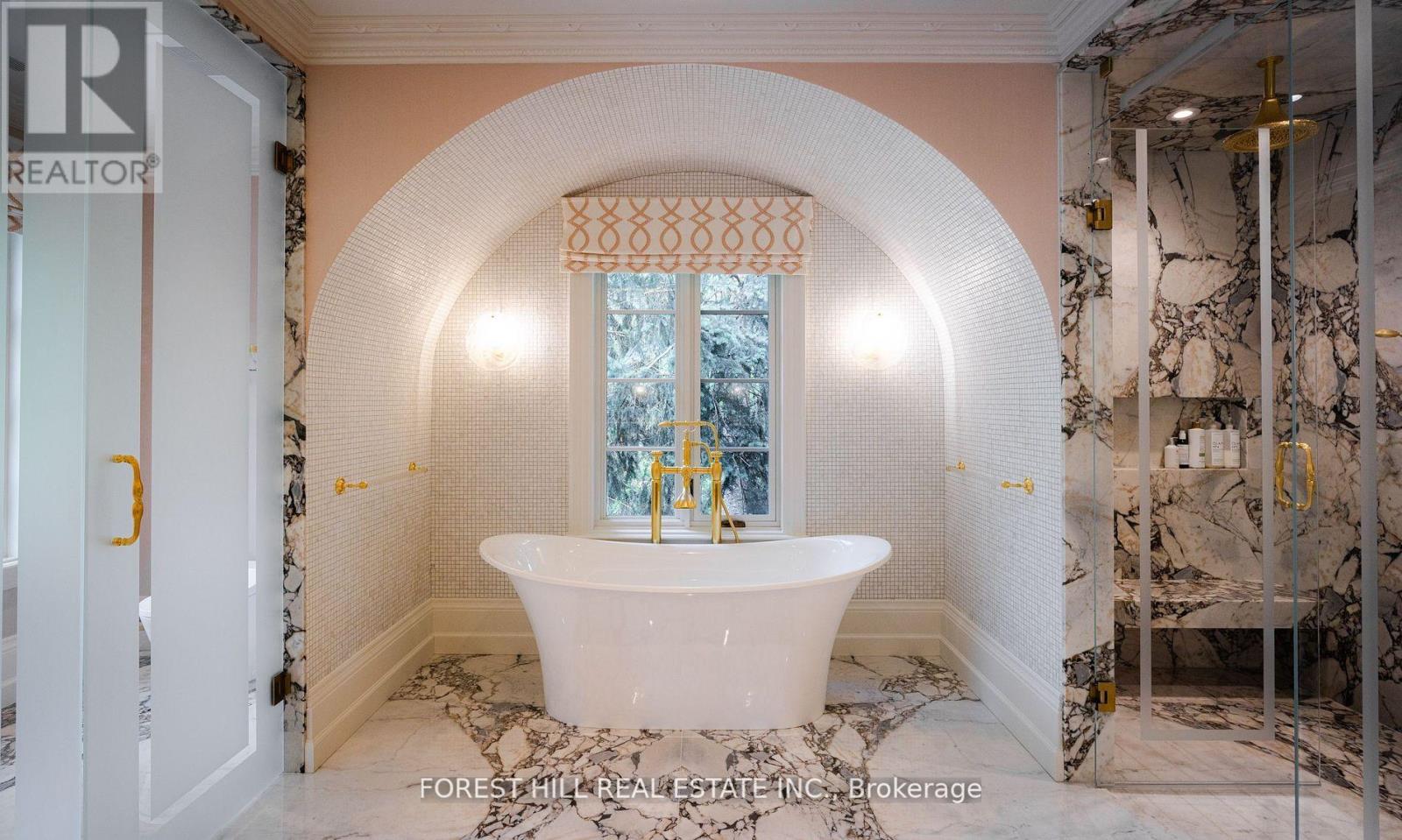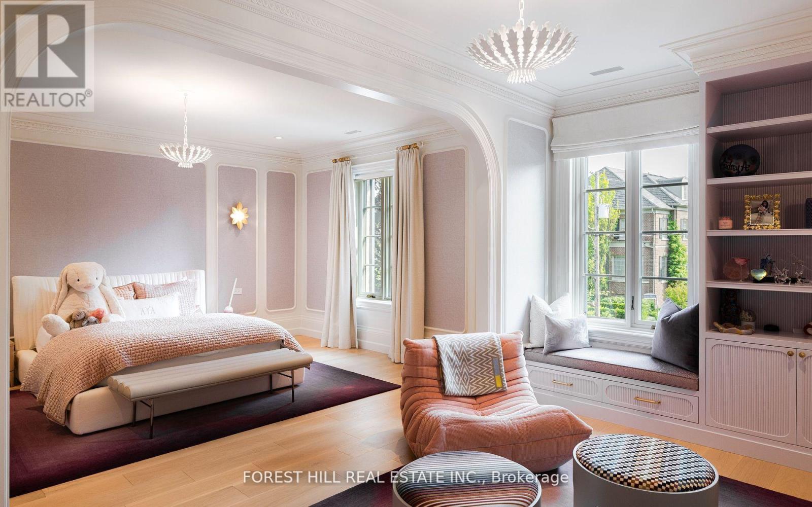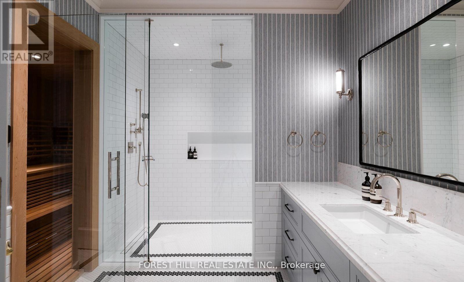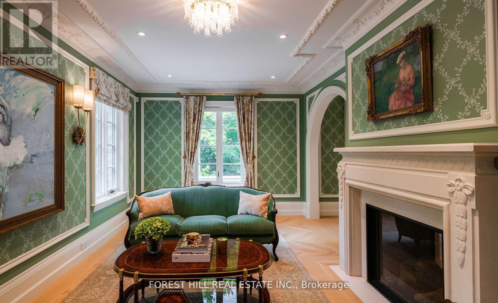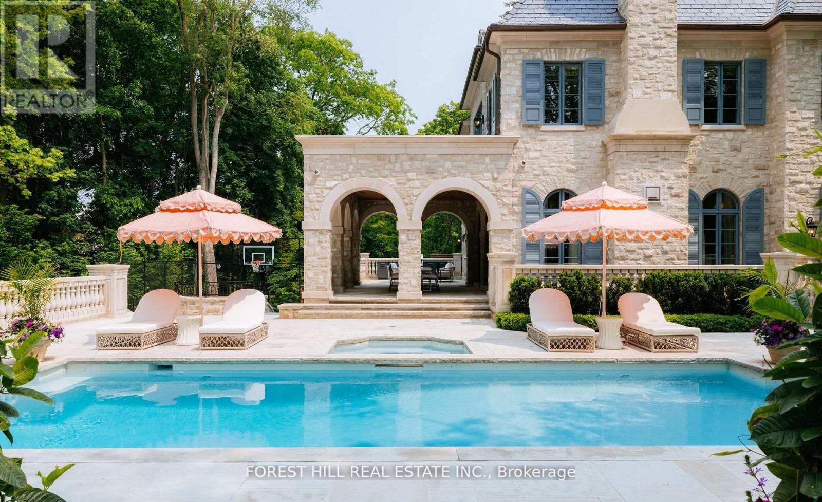 Welcome to 221 Forest Hill Road, an architectural triumph with nearly 13,000 sq ft of living space on a private 17,000 sq ft lot, nestled along the Beltline Trail in the heart of one of Toronto's most exclusive enclaves. This estate represents the pinnacle of bespoke luxury, meticulously brought to life by the city's finest: JTF Homes, Lorne Rose Architect, and Dvira Interiors. Clad in hand-selected limestone and inspired by the romance of the French countryside, the residence evokes the timeless elegance of a Provencal chateau. Arched windows with weathered-blue shutters, a stately turret, and a gracefully symmetrical facade create a striking first impression. A dramatic arcaded loggia opens onto manicured grounds and landscaping imagined by Fitzgerald and Roderick, featuring a lap pool, sports court, and lavish gardens that offer privacy and tranquility. The interiors are nothing short of breathtaking curated blend of old-world grandeur and modern refinement. The main level features soaring ceilings and a dramatic spiral staircase. Chevron-patterned white oak floors, arched passages, imported wallpaper, and tailored lighting reflect impeccable attention to detail. The formal dining room (seating 20) flows effortlessly into a statement kitchen adorned with hand-painted Portuguese tiles and custom cabinetry by Emanuele Furniture Design. The sunlit family room is anchored by a hand-carved fireplace and opens onto the gardens through elegant French doors. The crown jewel is the primary suite, a true sanctuary with vaulted ceilings, whimsical wallpaper, arched detailing, and a fireside lounge that creates a retreat-like atmosphere. The piece de resistance: a couture-inspired, two-storey dressing room with a spiral staircase and chandelier, paired with a spa-like ensuite clad in expansive stone and Shirley Wagner fixtures. The lower level features a sprawling rec room, games lounge, prep kitchen, gym, cedar sauna, and a home theatre for the ultimate cinematic escape. (id:4555)