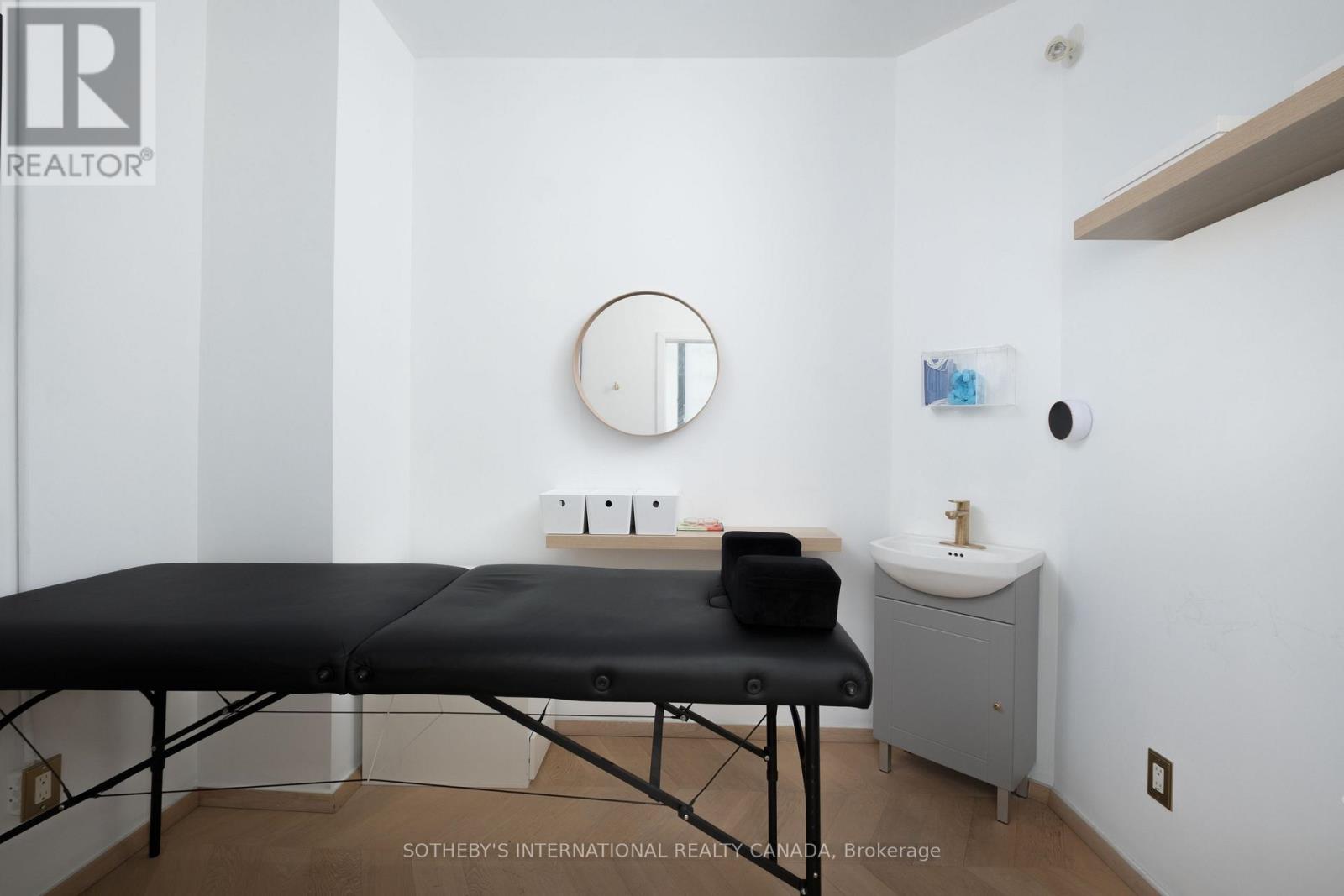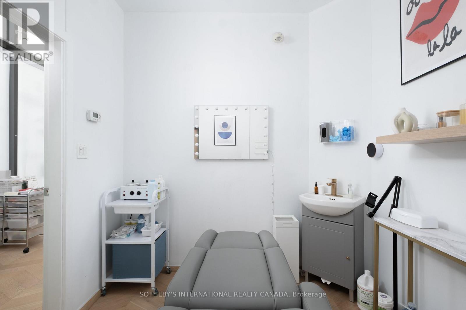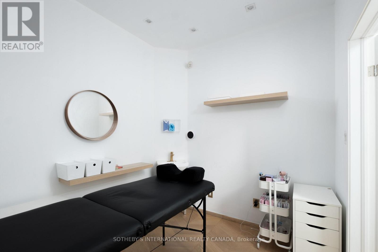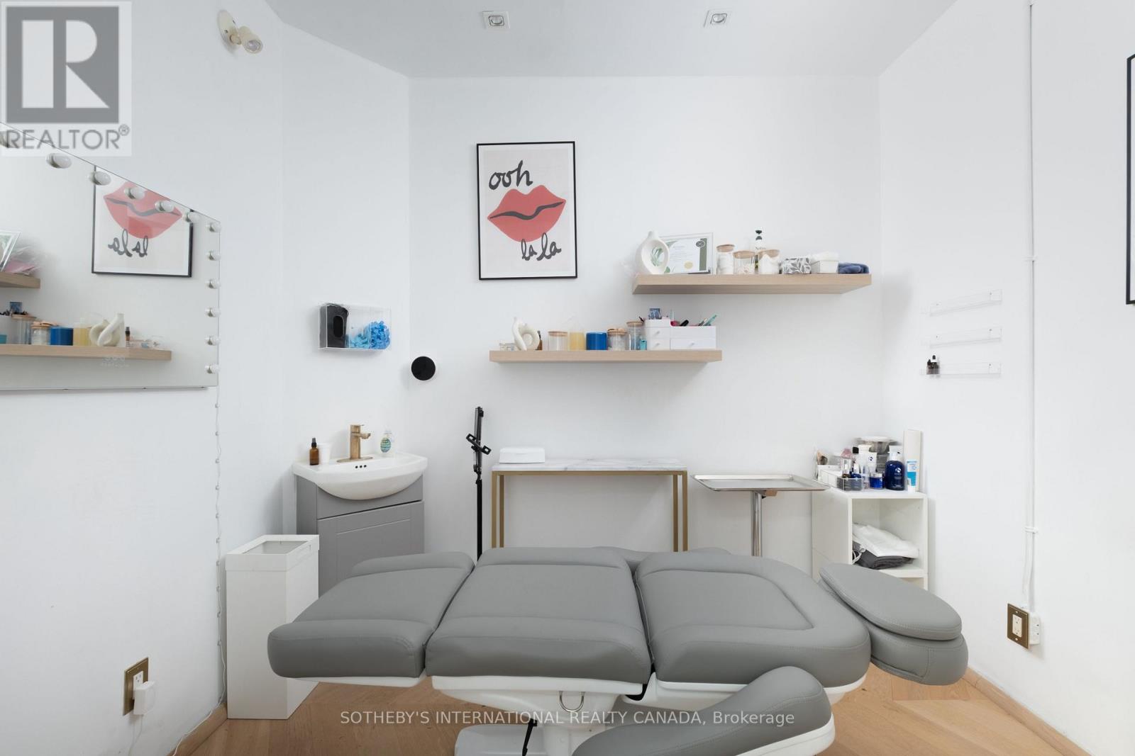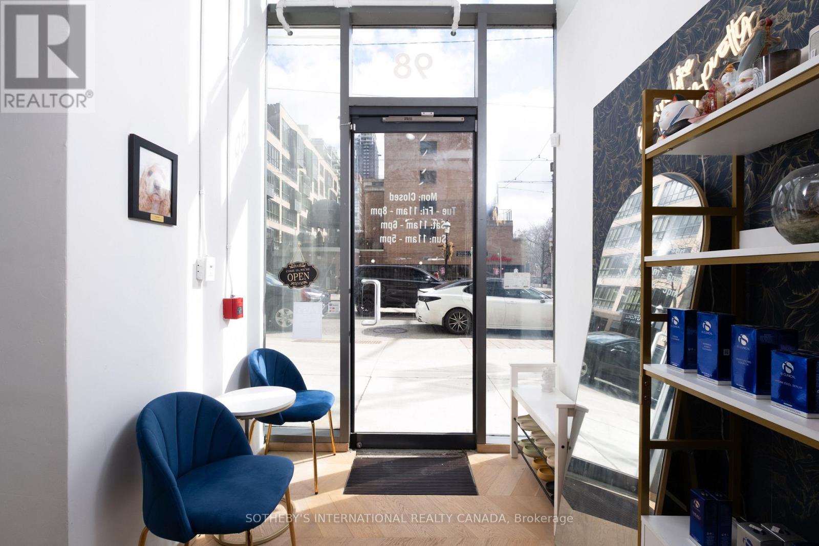 At the intersection of Church and Adelaide East, 98 Church Street offers a prominent ground-floor position within Spire, one of downtown Toronto's architecturally considered condominium addresses. This unit offers 594 square feet of rentable space with 29 feet of continuous frontage along Church Street. Floor-to-ceiling glazing floods the interior with natural light and establishes a direct visual connection to the street. The interior is composed around a reception area, two enclosed treatment rooms and an open working area. Herringbone floors and warm oak slat panelling introduce texture and a considered warm material note to the clean white space. The current fit-out, configured for beauty and aesthetic services, supports a range of professional and retail uses, from wellness and medical aesthetics to boutique consulting, design practice, showroom, or concept retail. The building's resident population and the neighbourhood's density of foot and vehicular traffic provide a built-in commercial context within one of the city's most established downtown corridors. The Financial District, King Street East, St. Lawrence Market, and the Distillery District are all within walking distance, with transit and PATH connections defining the area's accessibility. A corner presence on Church and Adelaide, where light, scale, and urban context create a considered setting in one of the city's most established downtown corridors. (id:4555)