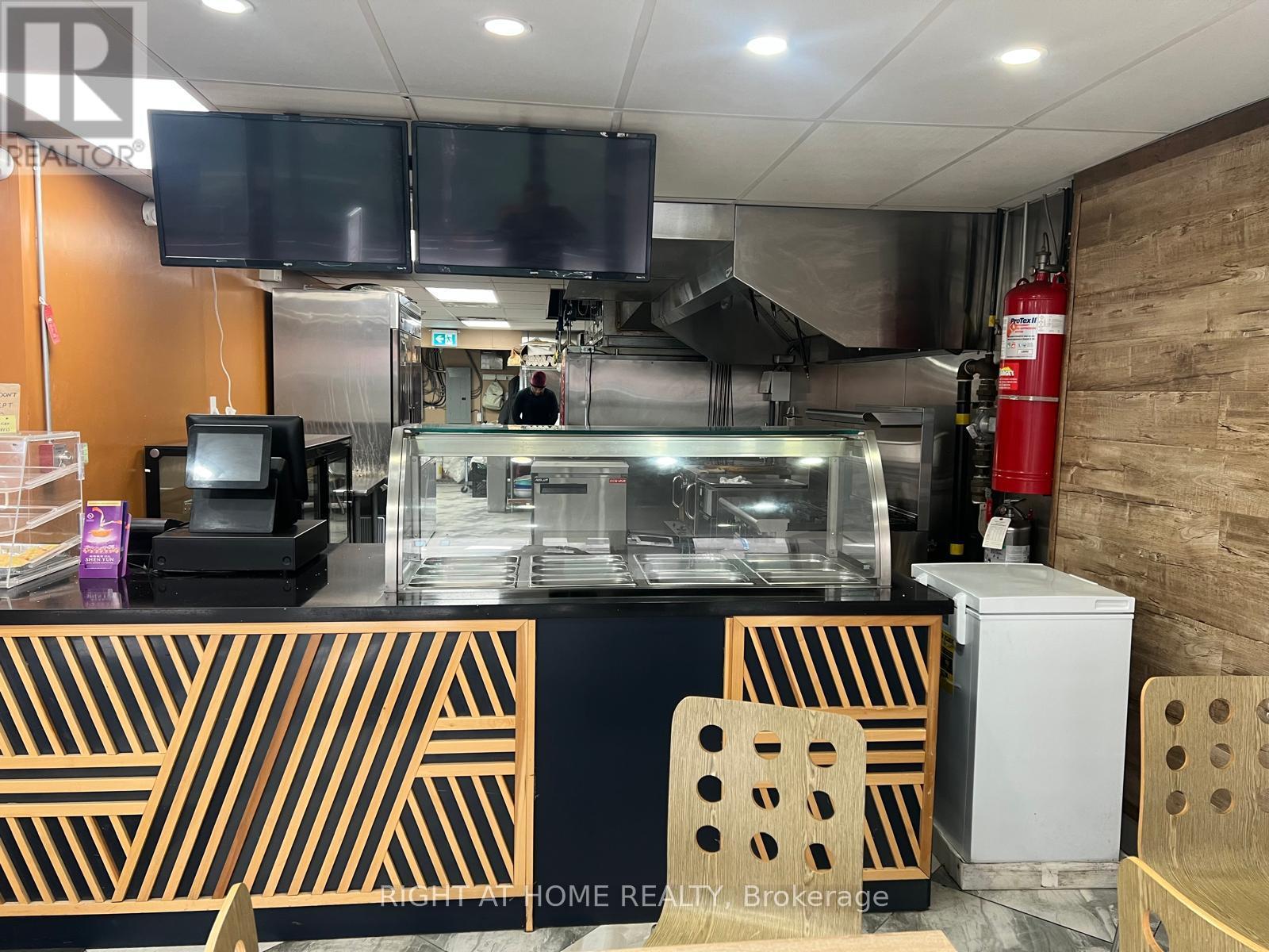Excellent sublease opportunity for a fully equipped quick-service restaurant currently operating as Amato Gyro. Located in a high-traffic retail plaza with strong pedestrian and vehicle exposure. Turn-key space featuring commercial kitchen equipment, ventilation hood, prep area, walk-in refrigeration, and customer seating area. Ideal for Mediterranean, shawarma, gyro, or other quick-service food concepts. Existing layout allows for efficient take-out and dine-in service. Surrounded by residential neighborhoods, schools, and busy commercial businesses providing steady foot traffic. Flexible sublease terms available. Great opportunity for an operator to step into an established location with minimal startup costs. Near Dundas Square (id:4555)