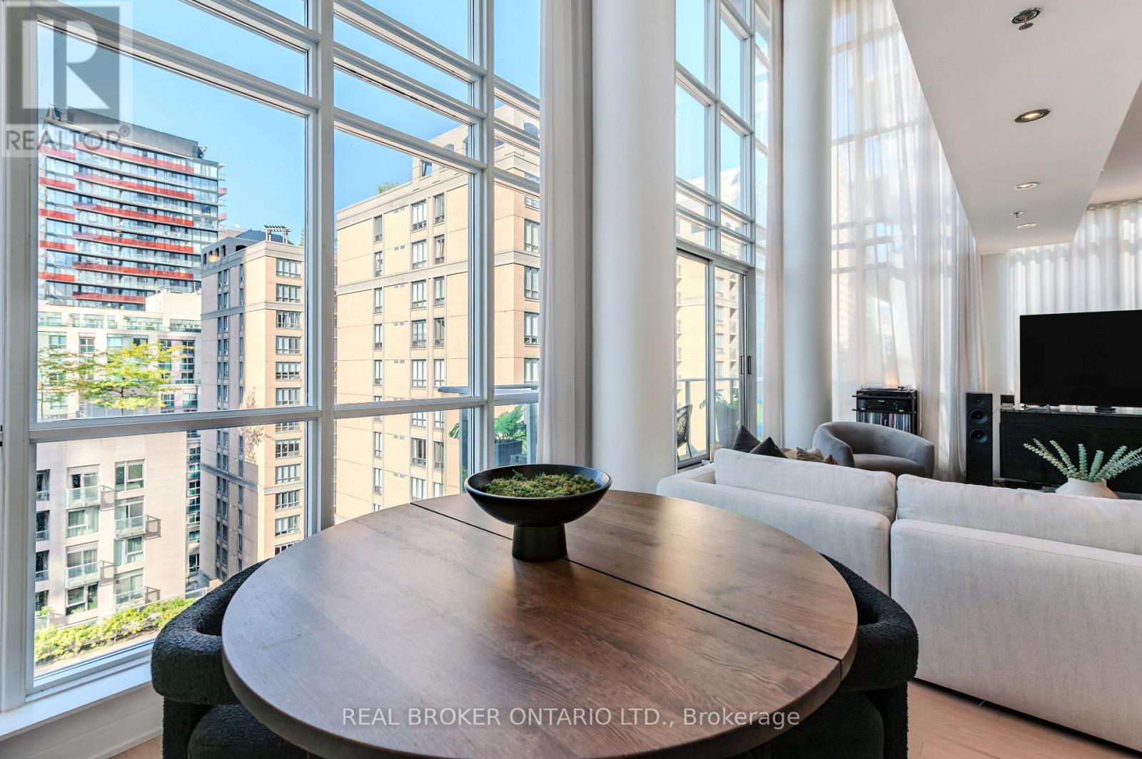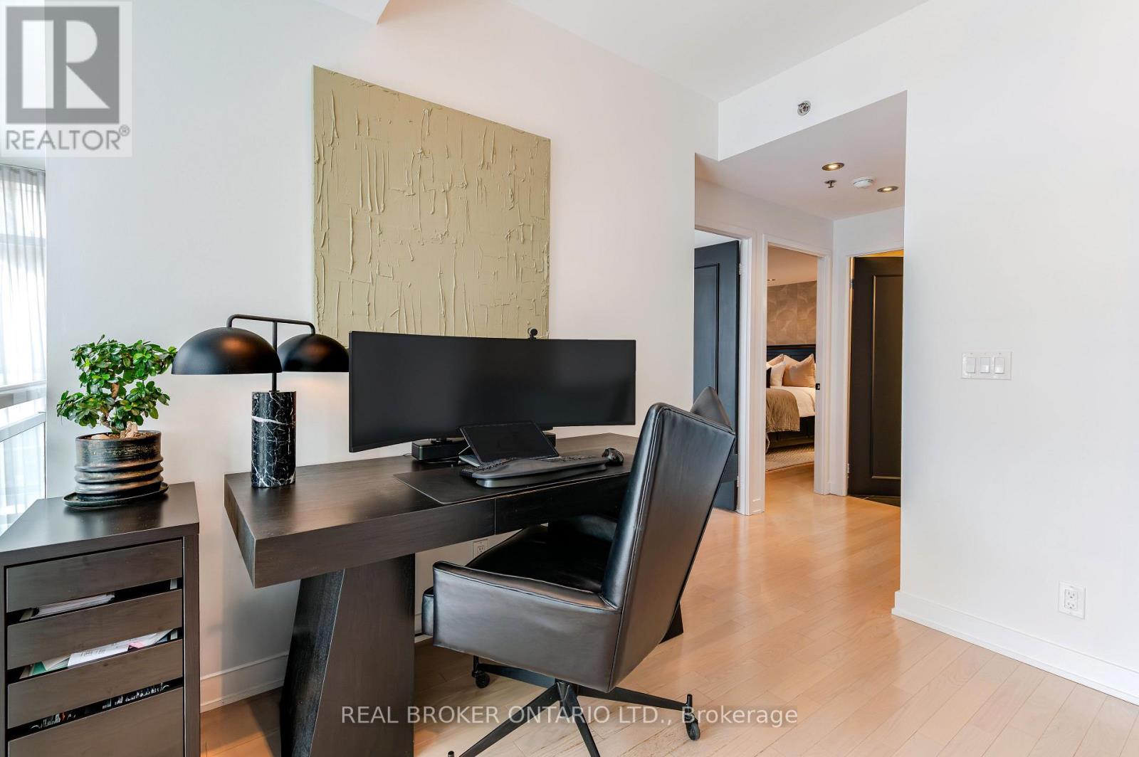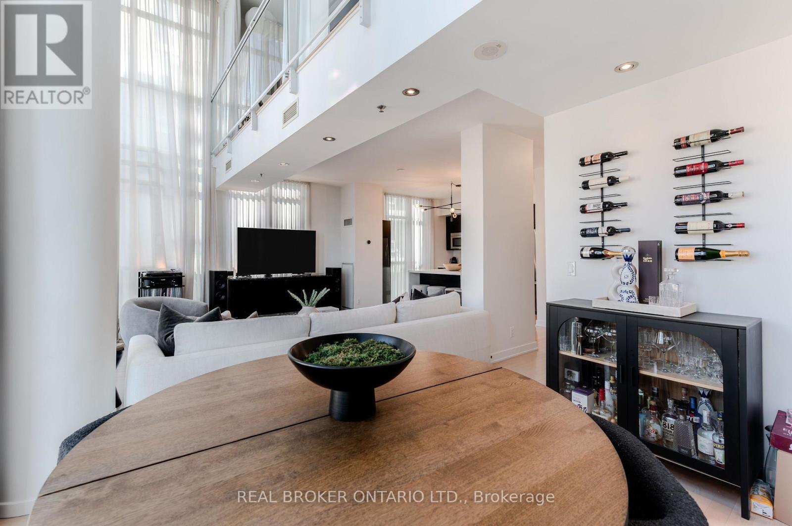 Rising above the city in Boutique Condos at 21 Nelson, this striking lower penthouse offers a rare sense of scale and light in the heart of downtown Toronto. Spanning approximately 1,405 sq ft with an additional 99 sq ft balcony, the residence unfolds across a thoughtfully designed 2+1 bedroom, 3-bathroom layout, where dramatic 19-foot ceilings and walls of glass create an atmosphere that feels closer to a boutique hotel suite than a typical condominium.The main living space is defined by its remarkable vertical volume and natural light. Floor-to-ceiling windows frame northeast city views while the open-concept layout seamlessly connects the living, dining, and kitchen areas-creating an ideal setting for both everyday living and effortless entertaining. The modern kitchen, anchored by a generous island with seating, blends clean lines with practical design, while the dining area sits against expansive windows that bring the skyline directly into the room.A dedicated office overlooking the balcony offers a bright and inspiring workspace-perfectly suited for modern work-from-home living without sacrificing privacy or style. The primary suite is calm and refined, complete with a ensuite and ample storage, while the second bedroom provides versatility for guests, family, or additional lifestyle needs.Step outside to the northeast-facing balcony, where morning light and layered city views create a peaceful extension of the home above the surrounding skyline.Complete with one parking space and access to Boutique Condos' rooftop terrace, pool, concierge, and fitness amenities, this residence delivers an elevated downtown lifestyle just steps from Queen West, TIFF Bell Lightbox, Osgoode Station, and the Financial District.A rare offering that combines volume, light, and sophisticated city living in one of Toronto's most connected neighbourhoods. (id:4555)