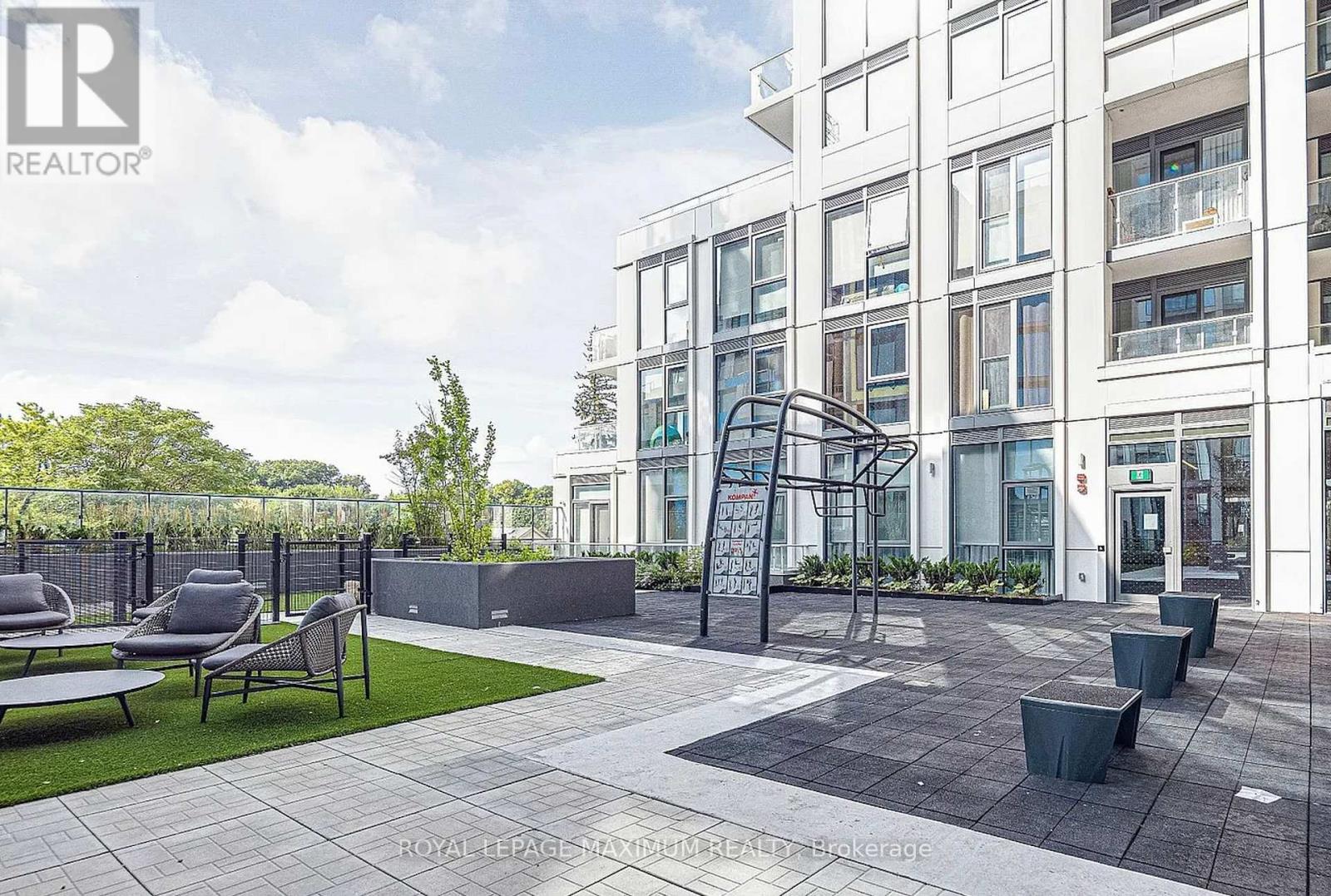 This one-bedroom plus den condo features a functional and well-planned layout. The suite opens to an open-concept kitchen and living area with a walk-out to a south-facing balcony overlooking the building's interior courtyard. The kitchen includes stainless steel built-in appliances, stone countertops, a tile backsplash, and track and pot lighting, with floor-to-ceiling windows bringing in abundant natural light. The fully enclosed den with sliding glass doors can be used as a home office or second bedroom. The primary bedroom has a built-in closet, and the three-piece bathroom is finished with modern fixtures. An in-suite laundry enclosure includes a stacked front-loading washer and dryer. Parking and a locker are included. Situated in the Forest Hill and Cedarvale area, the building is close to transit, shops, restaurants, and everyday amenities. Residents enjoy concierge service, a fitness centre, yoga and exercise areas, an outdoor terrace with BBQs, and shared recreational spaces. Direct subway access from the lobby is coming soon. (id:4555)