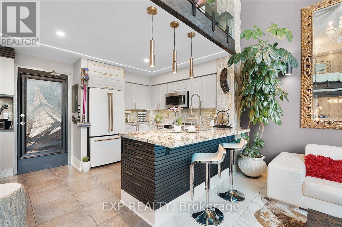 Live the loft life! You want bold, bright & unique, Welcome to this rarely offered fully transformed NYC style Hard-Loft perched on the PH-level of MYSTIC POINTE lofts in Mimico. Formally the McGinness Distillery this 2-story with 17' ceiling height showpiece blends industrial charm with modern luxury. Offering over +1200ft of brilliantly redesigned floor plan living space south facing Floor-Ceiling windows. and 1 of only a handful of Lakeview units in the building, this sun drench space was crafted to impress & entertain. Professionally reimagined by interior designer, it features 3 spacious bedrooms, 2-spa inspired bathrooms, sleek open riser stairs, dramatic glass railings, and hidden wall appliances, lighting accents that elevate every corner, the chef's kitchen boast a large eating island, ultra modern wall & ceiling lighting thr/o. A massive walk-in closet enough to support any shoe enthusiast, lots of storage, gas fireplace and a massive ceiling fan adds to its character. **Parking with attached Locker behind it, conveniently located on the same floor as the unit (so no elevator needed for groceries!) Perfect for style forward couple or remote working professional who value and crave ample space, bright and a bold design statement with luxury in mind. Seller is RREA. Fully updated in 2025...Even brand new furnace and AC (id:4555)