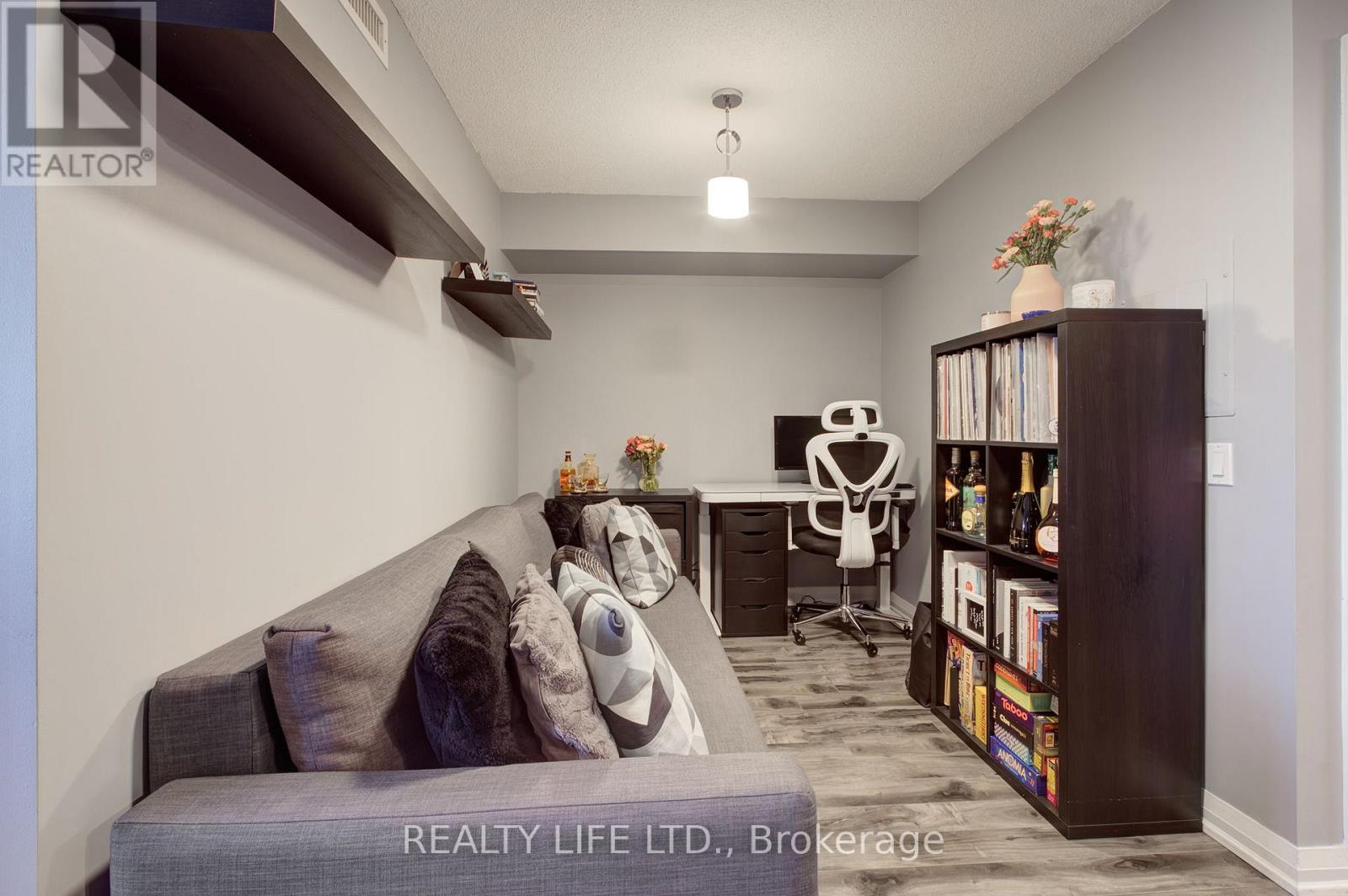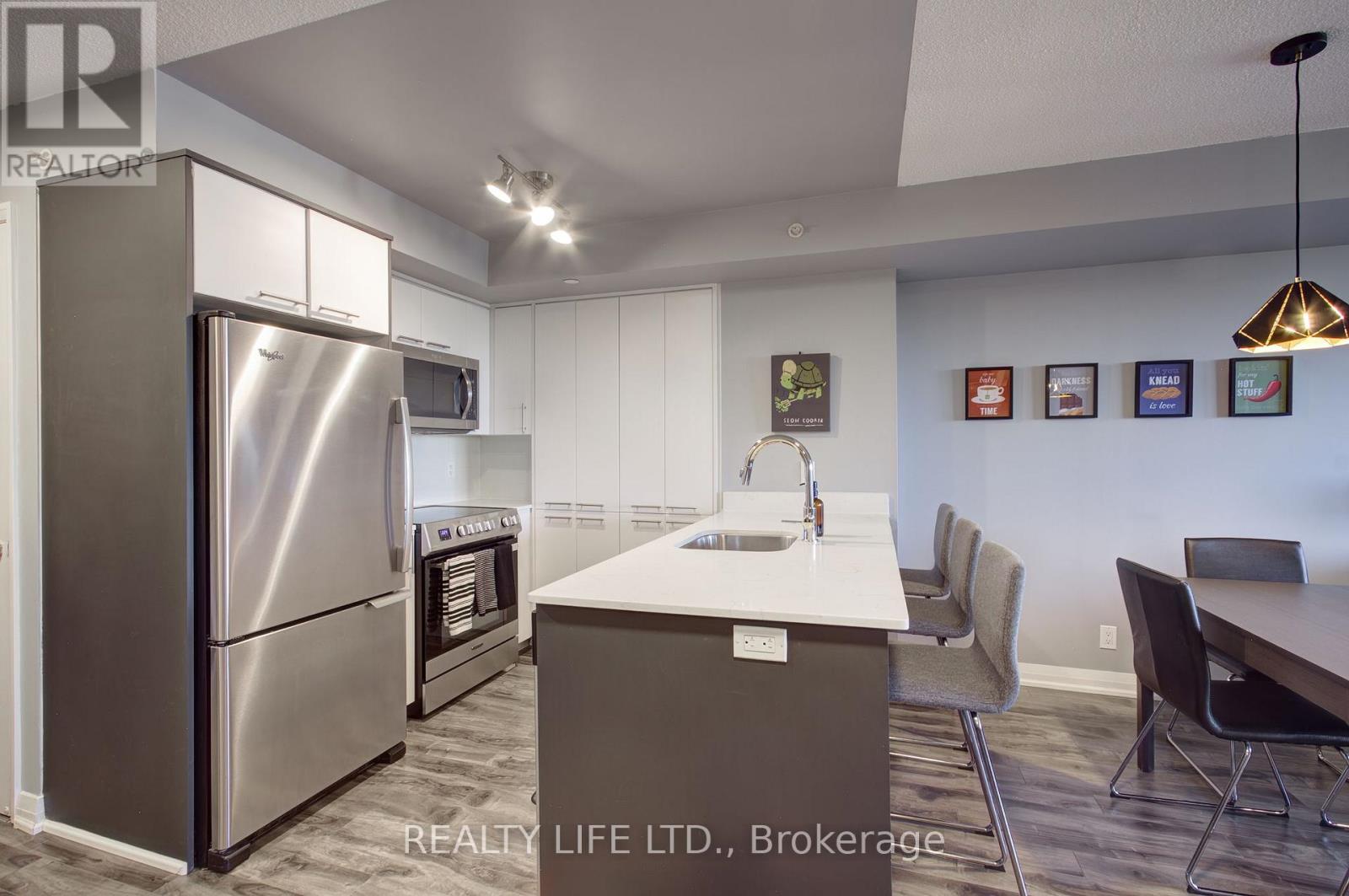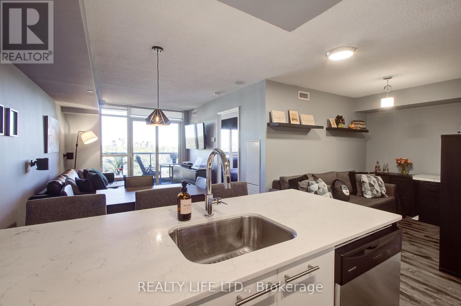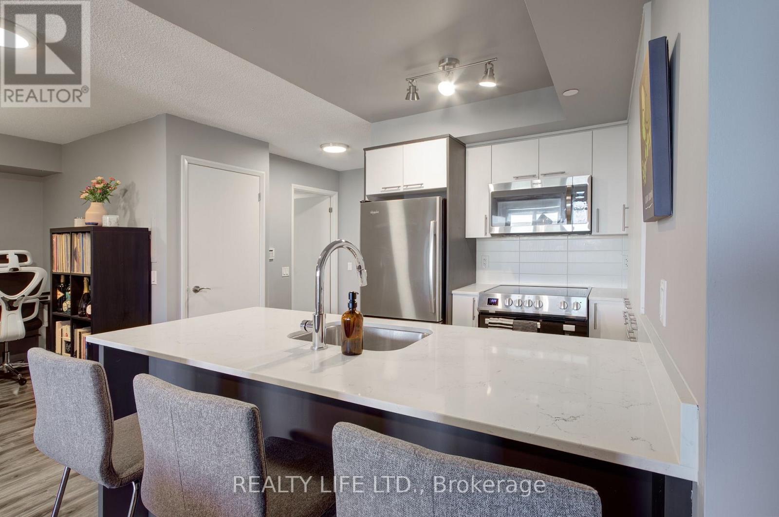 Desirable Valhalla Condos. Luxury 1 Bedroom + Den Condo With Large Balcony! Bright Open Concept Layout. 1 Parking Space. Modern Kitchen With Quartz Counter, Breakfast Bar, Ceramic Backsplash and Stainless Steel Appliances Including Slide In Range. Updates In 2019 Include Quartz Counter, Kitchen Sink, Replaced Cabinet Doors In Kitchen, Replaced Cabinet Doors In Bathroom and Laminate Flooring. Spacious Primary Bedroom With Mirrored Double Closet. Features Large Open Concept Den! Shows Well - Modern Paint Colours. Impressive Building With Many Great Amenities - Concierge, Indoor Pool, Gym, Party Room. Terrific Location - Very Convenient. Close To Highways, Public Transit, Shopping, Restaurants! (id:4555)