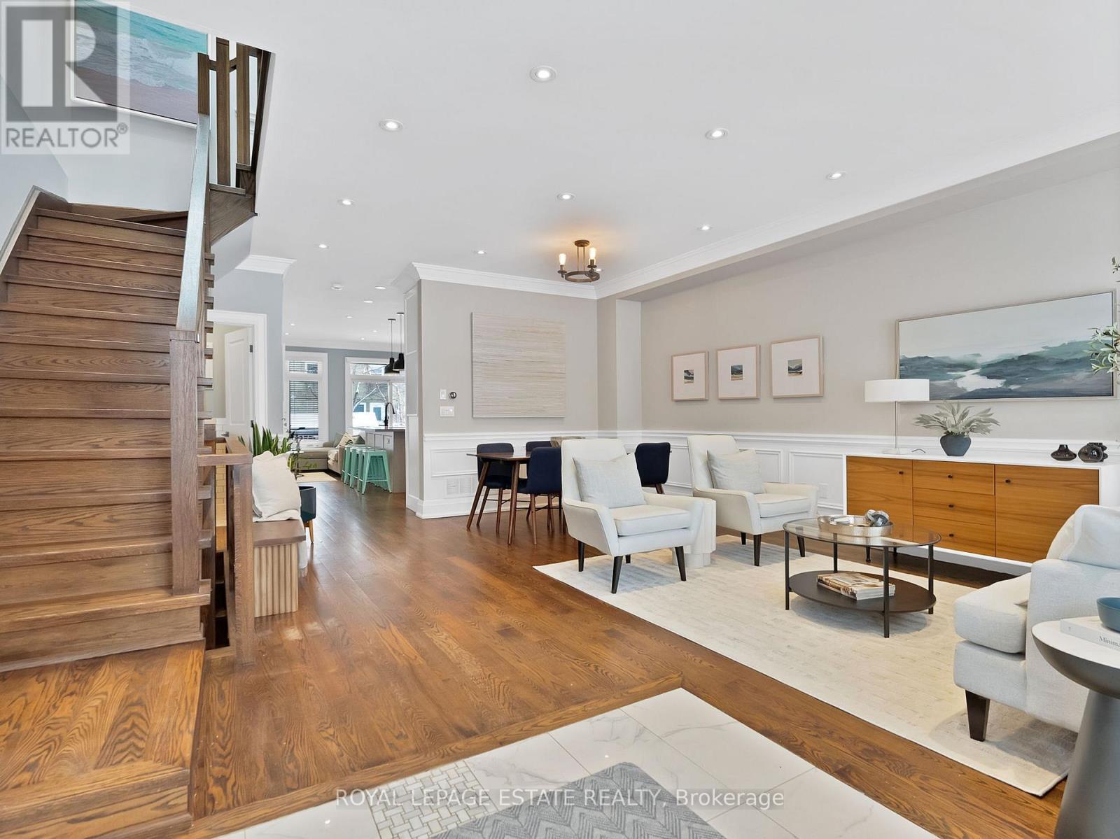 This impeccably renovated 4-bedroom, 5-bathroom family home is an entertainer's dream, set on a gorgeous tree-lined street and ideally located near top-rated schools, parks, cafes, gyms, and transit, and finished top to bottom with high-end craftsmanship. Featuring two floors of custom-finished hardwood, high ceilings, wainscoting, and plaster crown moulding, the home offers a chef's kitchen with Caesarstone countertops and backsplash, newer fridge, dishwasher, and microwave, and a walk-out from the family room to a composite deck with lifetime warranty. The thoughtful layout includes second-floor laundry, two skylights, one fireplace with a second roughed-in in the basement, and custom built-ins in the primary bedroom and ensuite, guest bedroom, and living area. Recent upgrades include a renovated primary bathroom (2023), renovated main-floor powder room, new washer and dryer (2024), new AC unit (2024), making this move-in-ready home the perfect blend of luxury, comfort, and family living. (id:4555)