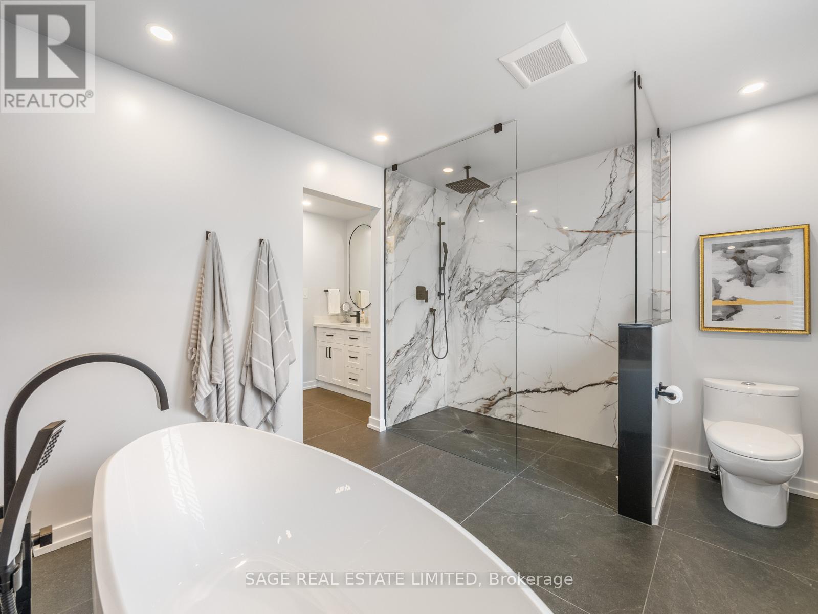 Welcome to this beautifully renovated 4+1 bedroom, 4-bathroom home in a highly sought-after, family-oriented neighbourhood near Rouge National Park, Highland Creek, and Lake Ontario. Set on a quiet, tree-lined street, this residence offers a refined blend of timeless finishes and modern functionality.The bright, open-concept main floor features hardwood flooring, elegant wainscoting, and crown moulding. Large windows fill the space with natural light, while a floor-to-ceiling stone fireplace anchors the living area. The chef-inspired kitchen is finished with stone countertops and quality cabinetry, seamlessly connecting to the main living and dining spaces. A main floor laundry room with chute adds everyday convenience.Upstairs, spa-like bathrooms are appointed with premium finishes, while the primary suite offers a private retreat with a freestanding soaker tub and a sleek, curb-less walk-in shower.The finished basement provides exceptional versatility with a wet bar, media room, gym, games area, library, and potential nanny or in-law suite, complemented by a second stone fireplace.Step outside to a professionally landscaped backyard featuring interlocking stone, integrated LED lighting, and a large gazebo with gas BBQ hookup-perfect for entertaining.This home also features smart technology, including a smart thermostat, doorbell camera, and smart switches throughout the main floor.Ideally located with direct TTC access and minutes to Rouge Hill GO Station and Hwy 401. Close to U of T Scarborough, Centennial College, the Pan Am Centre, and top-rated schools. Complete with a 2-car garage and parking for five, this is a rare turnkey opportunity in a premier location. (id:4555)