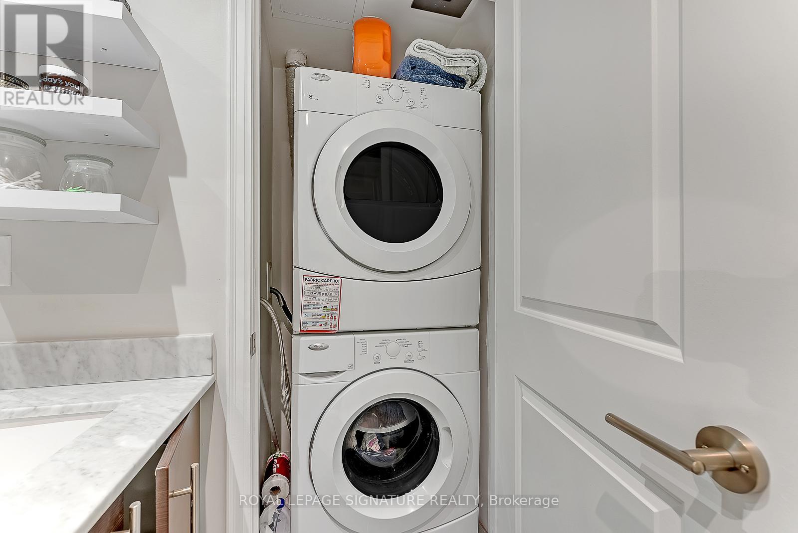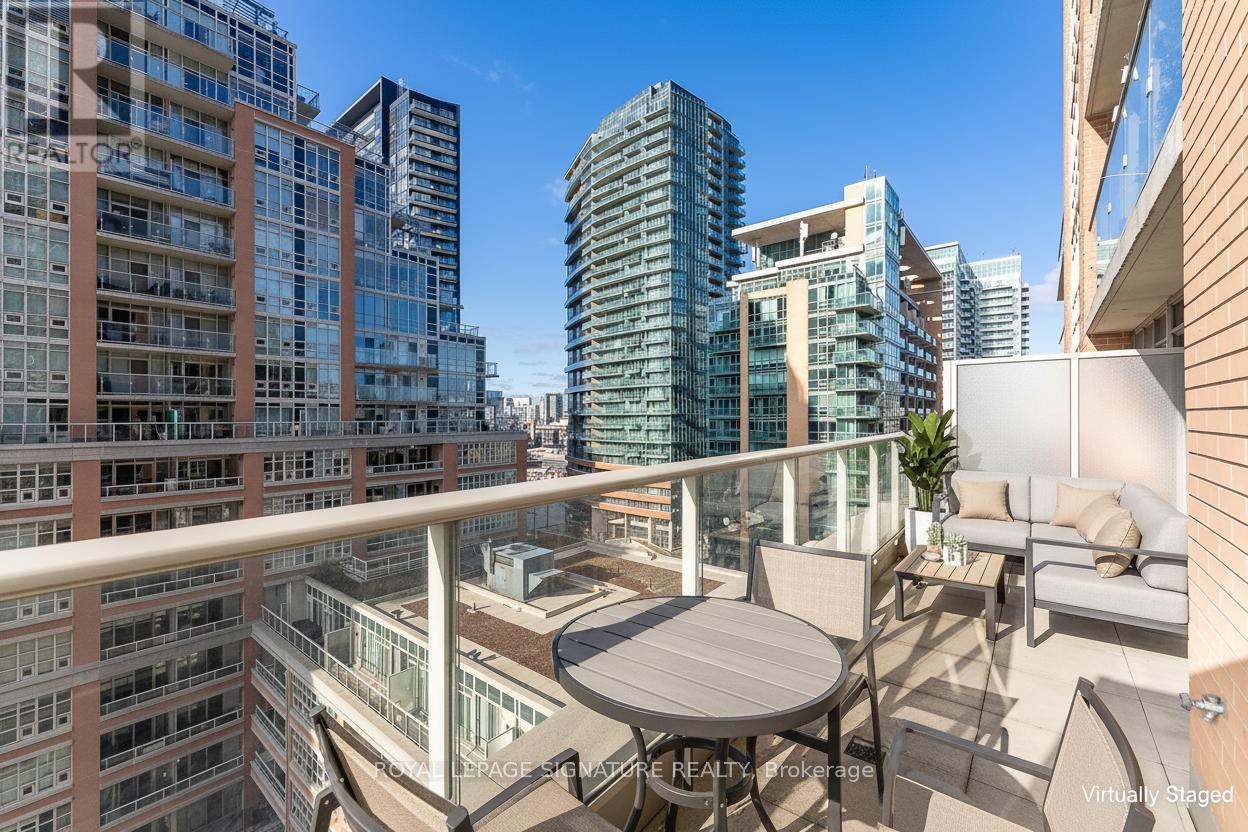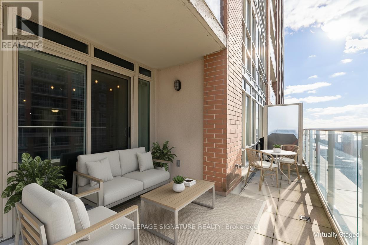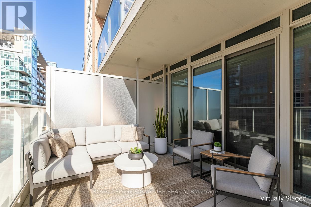 Discover this stunning terraced 1-bedroom + den suite offering exceptional space and style. The gourmet kitchen is equipped with full-sized stainless steel appliances, quartz countertops, a micro-mosaic tile backsplash, ample cabinetry, and a convenient breakfast bar- perfect for extra chopping/prepping space and dining on-the-go. Floor-to-ceiling windows flood the expansive open-concept living and dining area with natural light, providing plenty of room for a full-sized dining table and a large sectional- ideal for entertaining.The primary bedroom comfortably accommodates a large bed along with additional furnishings, and features distinctive warehouse-style block windows, a generous double closet, and a spa-inspired 4-piece bathroom (with a freshly re-caulked soaker bathtub/shower). A spacious loft-style den with its own closet offers versatile use as a guest bedroom, home office, gym or yoga studio. Step outside to the impressive 126+ sq ft terrace, where you can enjoy beautiful west-facing views of the lake and breathtaking sunsets. The ensuite laundry is super sweet. 1 Parking & Locker Included! World-Class Amenities: 24-Hour Concierge, Gym: Fitness, Weight & Yoga, Indoor Pool, Jacuzzi's, Saunas, Movie Theatre, Bowling Alley, Virtual Golf Room, Ping Pong Room, Billiard's Room, Guest Suites, Visitor Parking, Rooftop Deck Lounge with BBQ's & More. (id:4555)