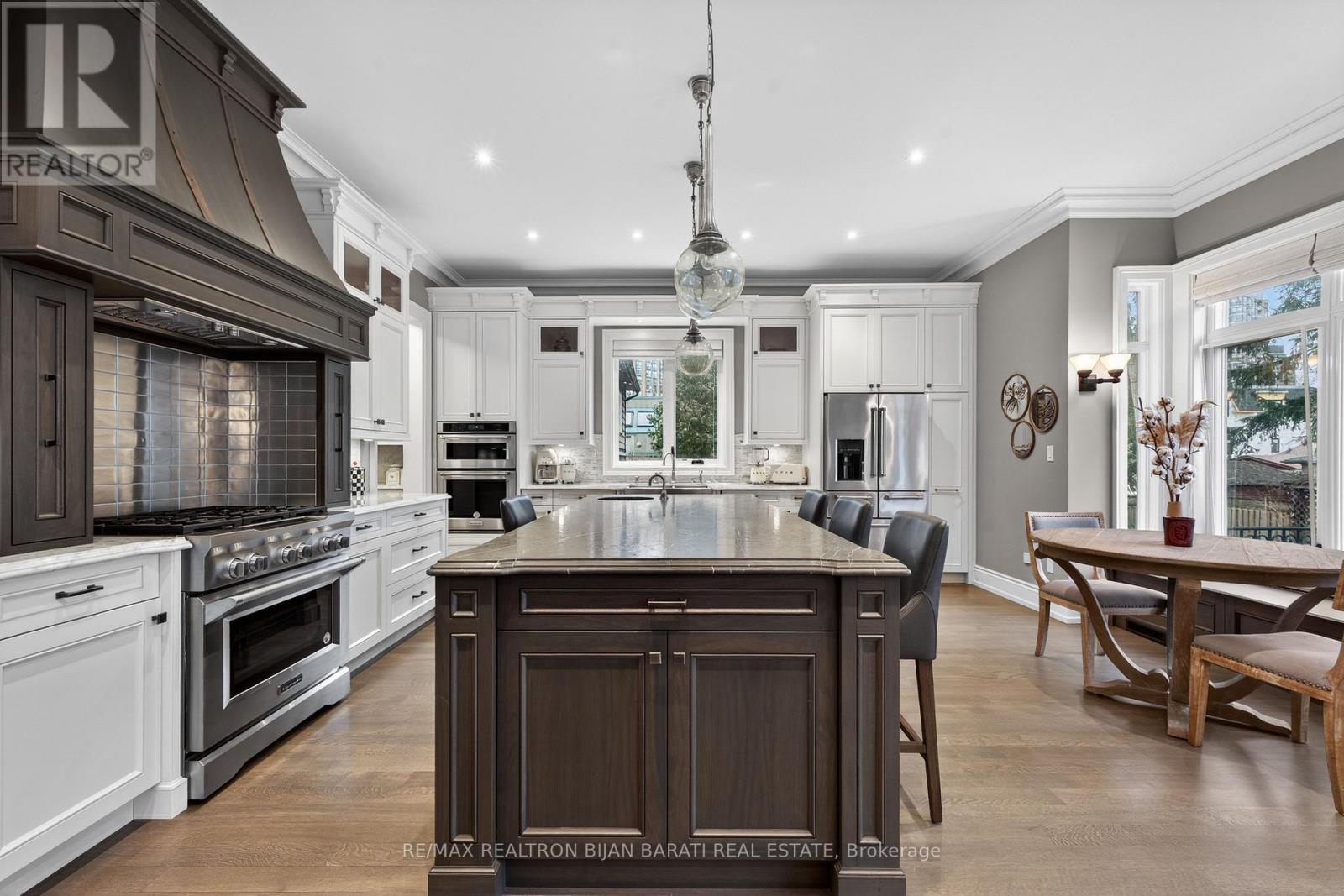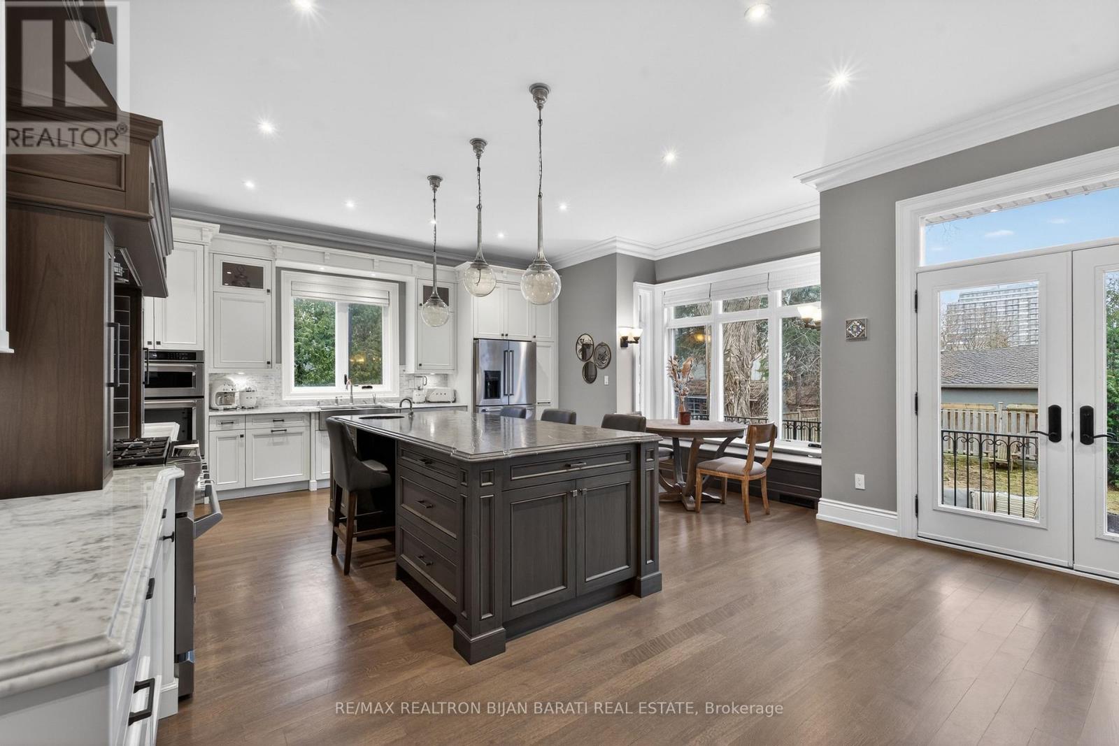 This Newer Custom Built Home, Meticulously Crafted And Sophisticated Designed On A Sun-Filled Southern Prime Lot: 50' X 117' !! It Offers Approximately 5,400 Sq.Ft Of Luxurious Living Space! 4+2 Bedrooms And 7 Washroom! E-L-E-V-A-T-O-R For 3 Levels! Impressive Architectural Design With Warm Accents And A Functional Layout! Soaring Ceiling Height ((1St Flr: 10', Office: 13.5', 2Nd Flr: 10' (Including Cof Cling), Rec Rm: 10.5'))! Hardwood Flooring And Led Lighting Thru-Out Main & 2Nd Flr! Beautiful Mix Of Limestone And Brick In Facade, And Full Brick For Other Three Exterior Sides!! Heated Floor in Lower Level And Snow Melting System for Driveway! High-End Millwork! Paneled Walls, Crown Molding, Coffered Ceilings, Led Potlights & More! The Main Floor's Flawless Layout Seamlessly Combines Functionality & Desirability, Featuring Spacious Living & Dining Areas With A Gas Fireplace, A Stylish Office/Library Featuring High Ceiling And Integrated Bookcases And Paneled Walls, Perfect For Work From Home! Walkthrough Pantry Leads To A Chef-Inspired Kitchen And Breakfast Area With State-Of-The-Art Appliances, Quality Cabinets, And A Built-In Bench! Spacious Family Room With Gas Fireplace, Rich Wall Unit, Walk-Out To Large Deck, Patio And Lovely Backyard. The Second Floor Offers A Breathtaking Master Bedroom, Boudoir W/I Closet And A Sumptuous Heated Floor Ensuite, Plus Three Additional Bedrooms Include Their Own Bathrooms, And A Large Laundry. The Lower Level Boasts An Incredible Recreation Room With A Wet Bar & Walk-Out To A Patio, Plus An Inviting Wine Cellar With Climate Control, A Guest/Nanny Room, Gym, And A Fully Equipped Home Theatre. Very Convenient Location: Minutes From Subway Station, And All Other Amenities! No Sidewalk in Front! This Home Is An Absolute Must See! (id:4555)