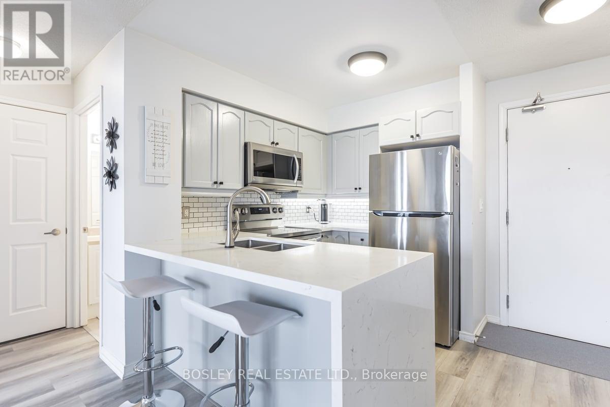Spacious and beautifully updated 2-bedroom, 2-bath residence in sought-after Bellair Gardens, complete with the rare offering of two side-by-side parking spaces. Enjoy sweeping southwest skyline views from this bright, well-appointed suite, ideally located near major highways, shops, trails, the TTC, and everyday conveniences. The modern kitchen features quartz countertops, a striking waterfall island, stainless steel appliances, and a custom backsplash. A highly functional split-bedroom layout provides excellent privacy, while floor-to-ceiling windows flood the living space with natural light. Vinyl flooring throughout the living areas adds a fresh, contemporary feel, making this home ideal for comfortable everyday living and entertaining. (id:4555)