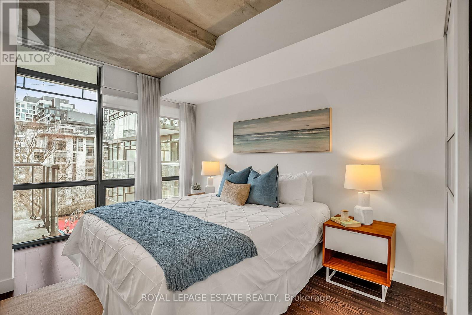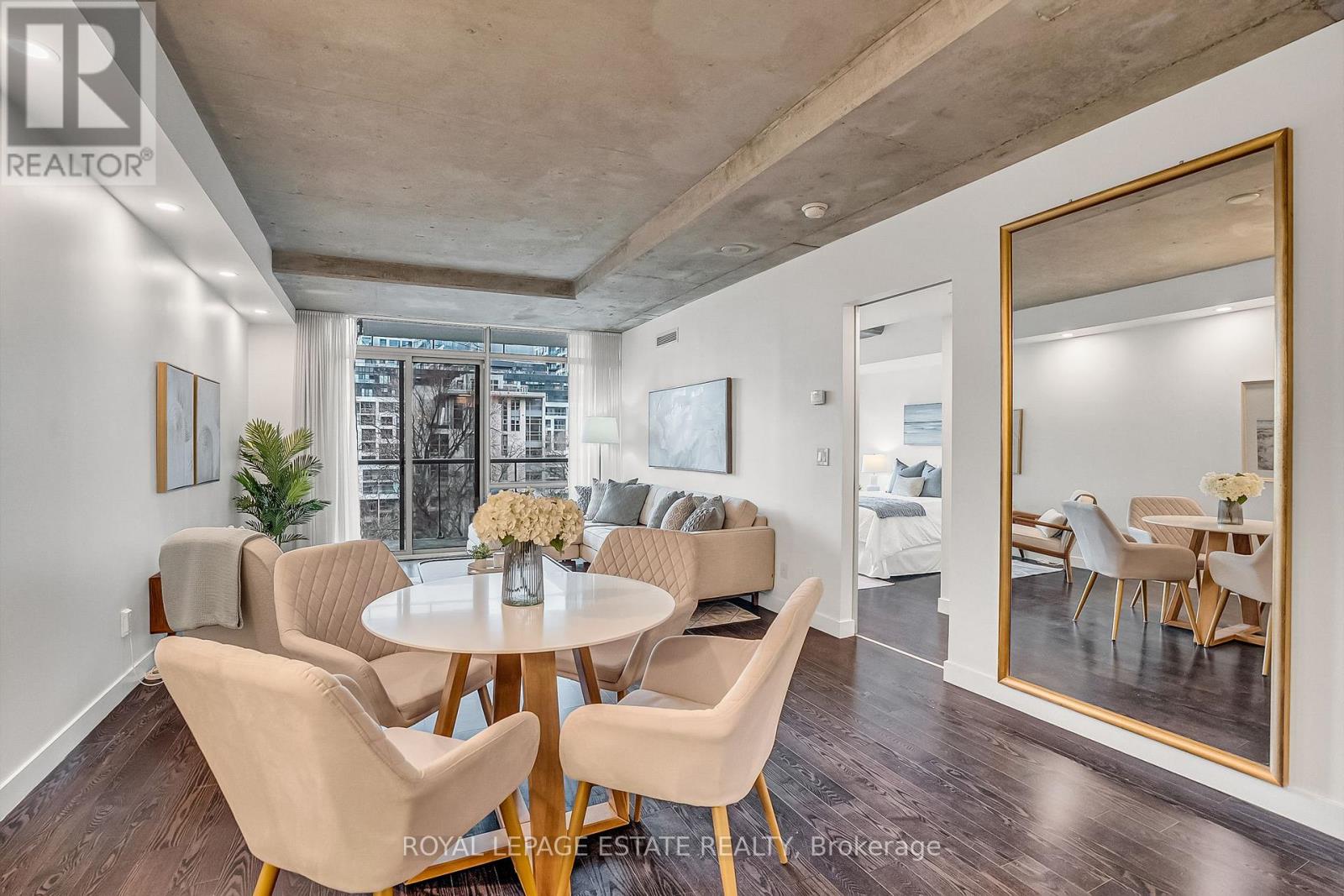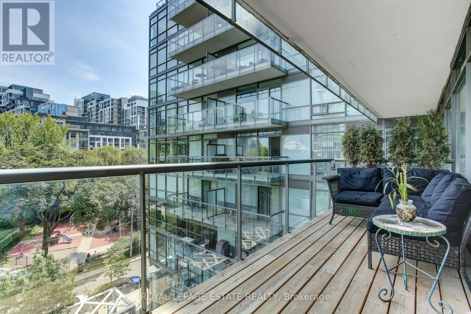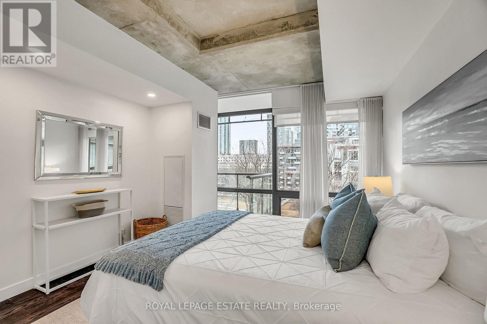 Located in the heart of King West, this stunning south-facing one-bedroom plus den offers 830 square feet of sophisticated and modern living space, including a parking space and locker. The unit features unobstructed views of Victoria Memorial Square Park and the Mirror Pool, perfectly situated for privacy and protected from future development. The interior boasts 9-foot exposed concrete ceilings and floor-to-ceiling windows that provide abundant natural light. The bright, airy and ample open-concept living and dining area is generous in proportion allowing for roomy and comfortable furniture placement. Additional overhead lighting has been added for further practicality and ambience. Double patio doors flow out to an oversized balcony equipped with a natural gas BBQ hookup and that killer view. The kitchen is finished with sleek, modern cabinetry, full-sized stainless steel appliances, a large stone island with modern hanging task lights. The versatile den includes an oversized closet and can serve as a second bedroom or an office. The primary bedroom offers a tranquil retreat with park views and a walk-in closet with custom built-ins. Additional features include a spa-inspired bathroom with dual access. Residents enjoy exclusive access to first-class amenities at the 1 Hotel, including a gym, rooftop pool, bar and 24-hour concierge service. The building is steps away from the Entertainment District, shops, restaurants, Billy Bishop Airport, and the upcoming Ontario Line King-Bathurst station - across the street!. This meticulously maintained property perfectly balances urban convenience with a tranquil lifestyle. (id:4555)