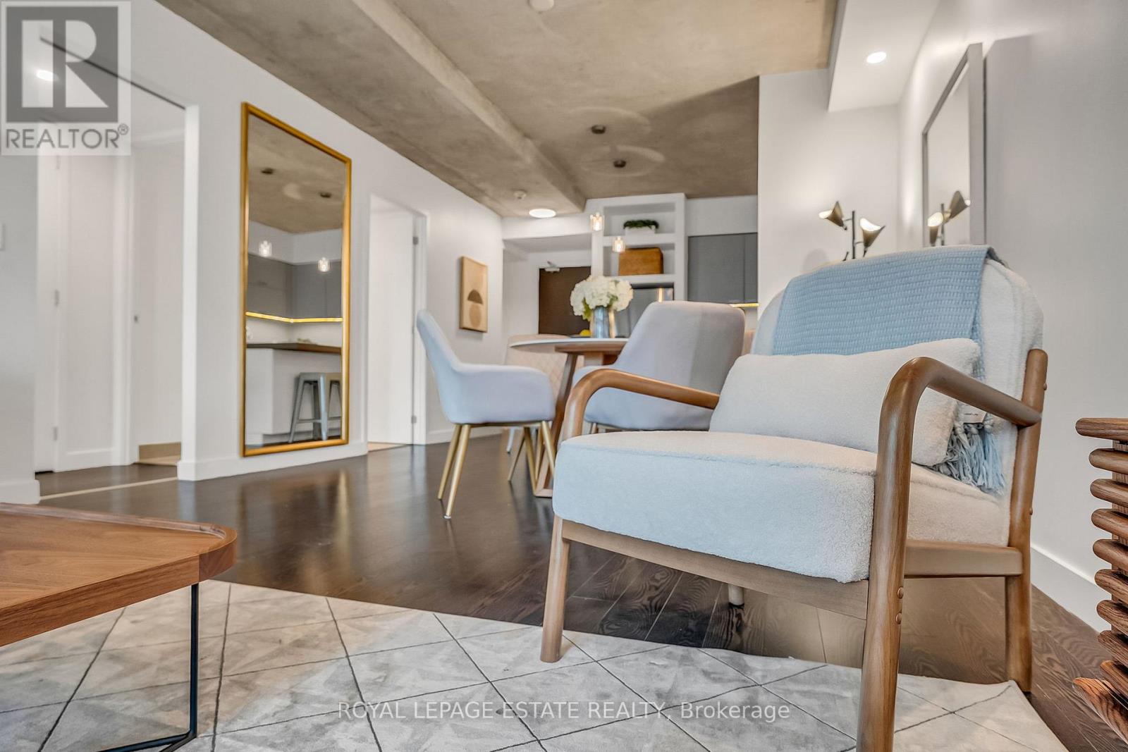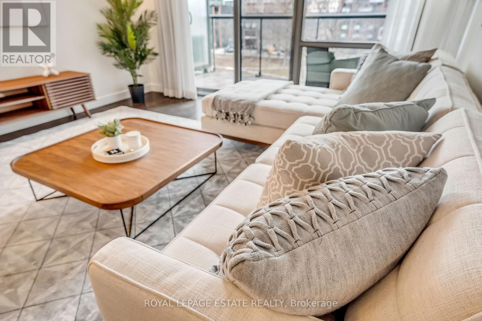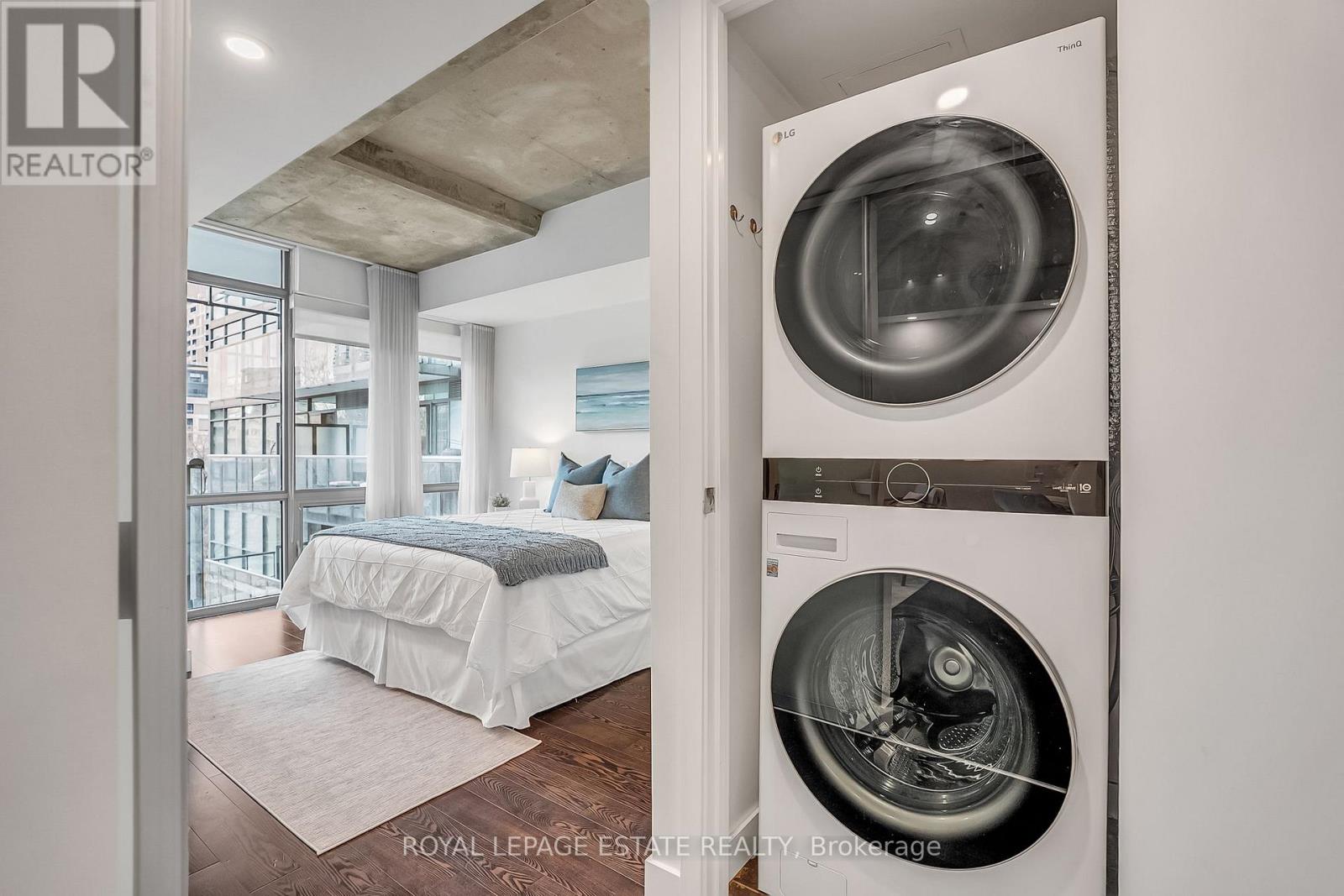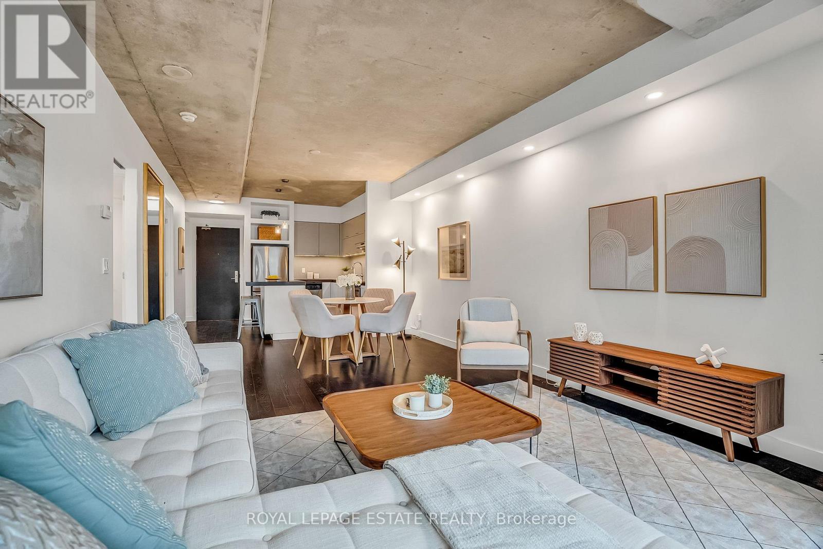 Located in the heart of King West, this stunning south-facing one-bedroom plus den offers 830 square feet of sophisticated and modern living space, including a parking space and locker. The unit features unobstructed views of Victoria Memorial Square Park and the Mirror Pool, perfectly situated for privacy and protected from future development. The interior boasts 9-foot exposed concrete ceilings and floor-to-ceiling windows that provide abundant natural light. The bright, airy and ample open-concept living and dining area is generous in proportion allowing for roomy and comfortable furniture placement. Additional overhead lighting has been added for further practicality and ambience. Double patio doors flow out to an oversized balcony equipped with a natural gas BBQ hookup and that killer view. The kitchen is finished with sleek, modern cabinetry, full-sized stainless steel appliances, a large stone island with modern hanging task lights. The versatile den includes an oversized closet and can serve as a second bedroom or an office. The primary bedroom offers a tranquil retreat with park views and a walk-in closet with custom built-ins. Additional features include a spa-inspired bathroom with dual access. Residents enjoy exclusive access to first-class amenities at the 1 Hotel, including a gym, rooftop pool, bar and 24-hour concierge service. The building is steps away from the Entertainment District, shops, restaurants, Billy Bishop Airport, and the upcoming Ontario Line King-Bathurst station - across the street!. This meticulously maintained property perfectly balances urban convenience with a tranquil lifestyle. (id:4555)
