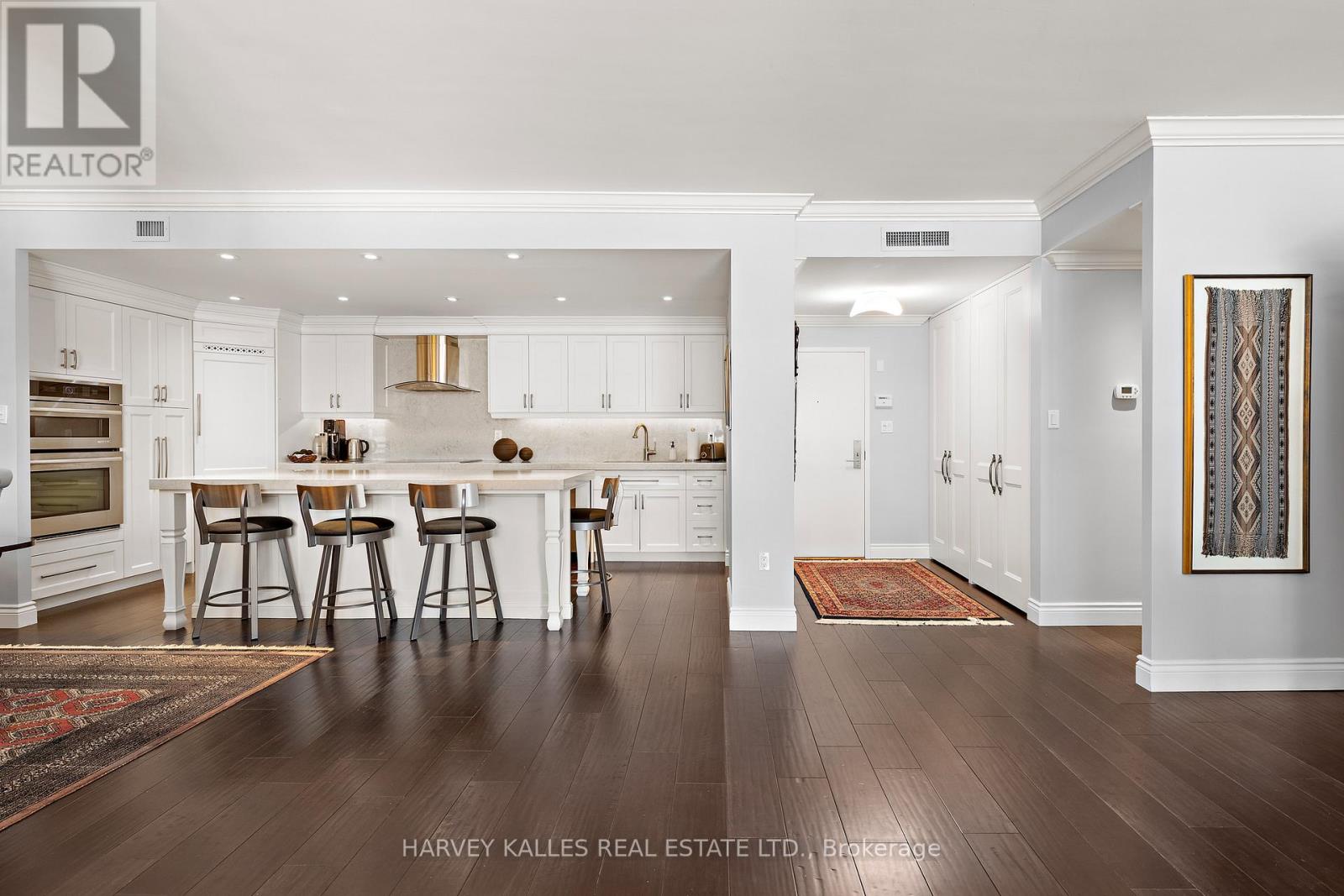 Stepping into this 1,950 sq ft condominium, downtown Toronto fades into the distance, giving way to a rare feeling of privacy, proportion, and calm.Suite 818 at 80 Front Street East is a rare penthouse-level, two-bedroom, two full-bath residence that lives like a home-offering the comfort, scale, and ease of living often associated with a house, without sacrificing the convenience of downtown condo life.Hand-scraped engineered hardwood floors, nine-foot ceilings, and crown mouldings create a composed and welcoming backdrop. The open layout flows naturally from living to dining to kitchen, anchored by a wood-burning fireplace framed in Caesarstone quartz with a custom mantle. The kitchen features a generous Caesarstone island, matching counters and backsplash, and custom cabinetry designed for practical, everyday use.The primary suite is a serene retreat with custom floor-to-ceiling closets and a well-appointed ensuite boasting an oversized shower, stone-topped vanity, and Rubinet fixtures. The second full bath, finished in Carrara tile and marble, continues the home's timeless aesthetic.A premium double-sized parking space adjacent to the elevator ensures everyday convenience. With remarkably low maintenance fees for its size and a rooftop terrace only forty steps from the stair door, effortless indoor-outdoor living is always within reach. Market Square offers 24-hour concierge and security, indoor salt-water pool, infra-red sauna, two fitness rooms, squash court, curated lending library, workshop, landscaped courtyard, and two rooftop terraces with panoramic views and natural gas and charcoal BBQs. Elegant new lobby (2025) and refurbished corridors reflect thoughtful reinvestment. Just steps from St. Lawrence Market, this is a condominium for those seeking space, comfort, and a home-like feel without compromise. (id:4555)