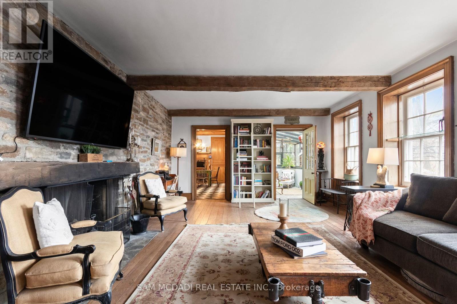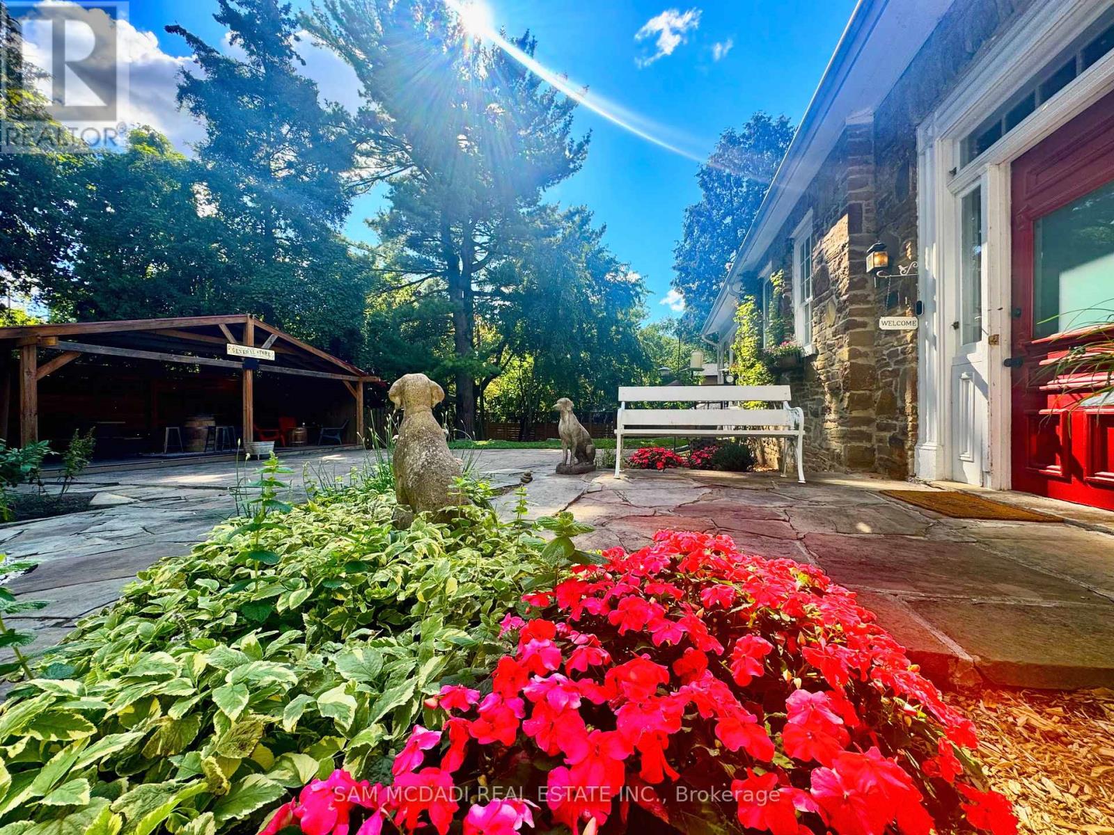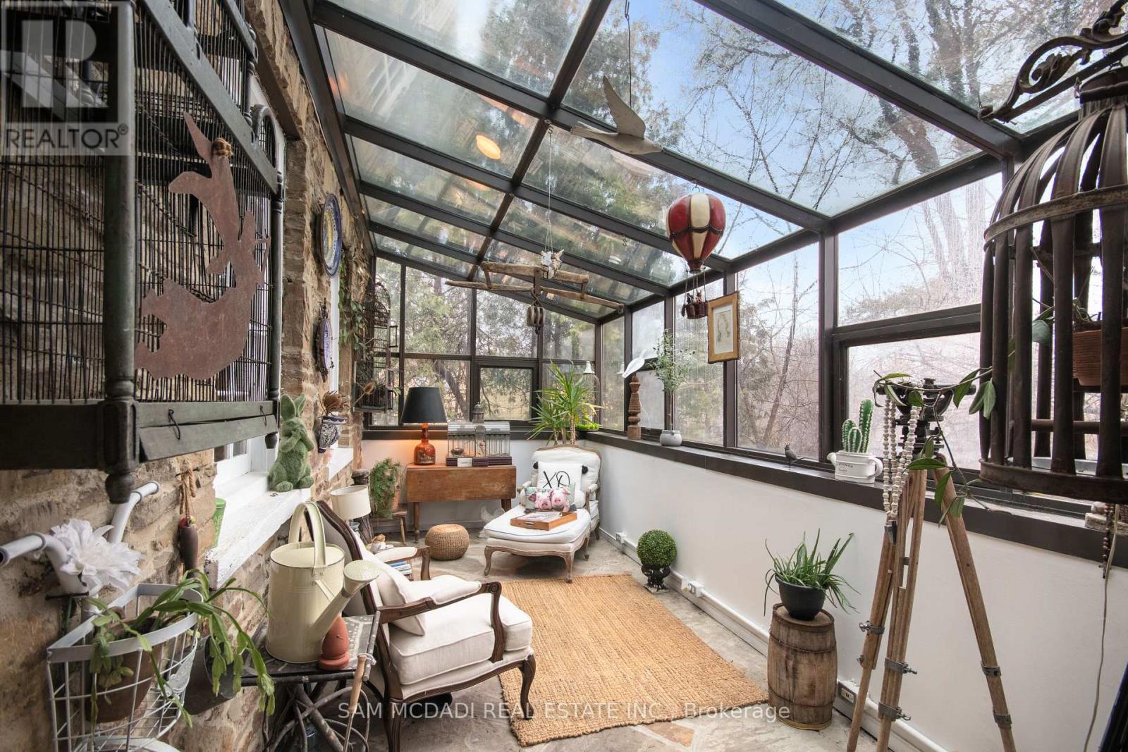 Welcome to 85 Yorkleigh Avenue, a rare offering set on an extraordinary 1.15-acre lot backing onto the Humber Creek ravine. Surrounded by mature trees and complete privacy, this property offers a lifestyle seldom found within the city. The home's stone façade, manicured gardens, and inviting front porch create a setting that feels elegant, character-rich and grounded in nature. Inside, the home unfolds with distinctive timeless charm. The eat-in kitchen is a statement space, featuring exposed wood beams, a wood-burning fireplace, classic checkered flooring, and a seamless walkout to the grounds. The dining room is designed for intimate entertaining, complete with its own fireplace and custom built-ins, while the living room showcases a striking stone hearth and direct access to the sunroom. Wrapped in glass, the sunroom offers a tranquil, light-filled escape, perfect for year-round enjoyment with serene views of the surrounding ravine canopy. The main level features two bedrooms, including a peaceful primary retreat with double closets, alongside a well-appointed 3-piece bath. A vaulted loft above provides a versatile space ideal for guests, a studio, or a private hideaway. The walk-out lower level expands the home's functionality with a third bedroom, an office, 3-piece bath, laundry, and terra cotta stone flooring throughout, well-suited for extended family or flexible living arrangements. Outdoors, the grounds are no thing short of exceptional. Multiple seating areas, curated gardens, and natural pathways lead you through a private, tree-lined setting. Tucked within the ravine, a charming elevated treehouse offers a storybook 1 bedroom with a 3-piece bath retreat, a rare and whimsical feature that captures the essence of this unique property. Ideally positioned near Douglas B. Ford Park and the scenic Humber River Recreational Trail, with convenient access to reputable schools, shopping centres and easy access to Highway 401 and 427. (id:4555)
