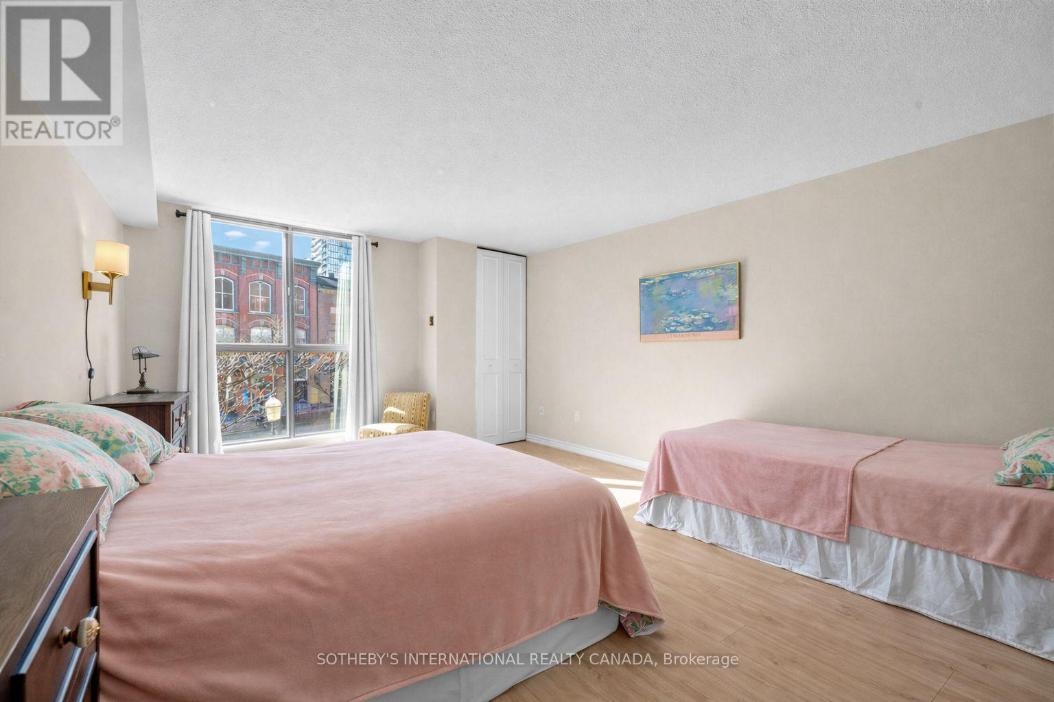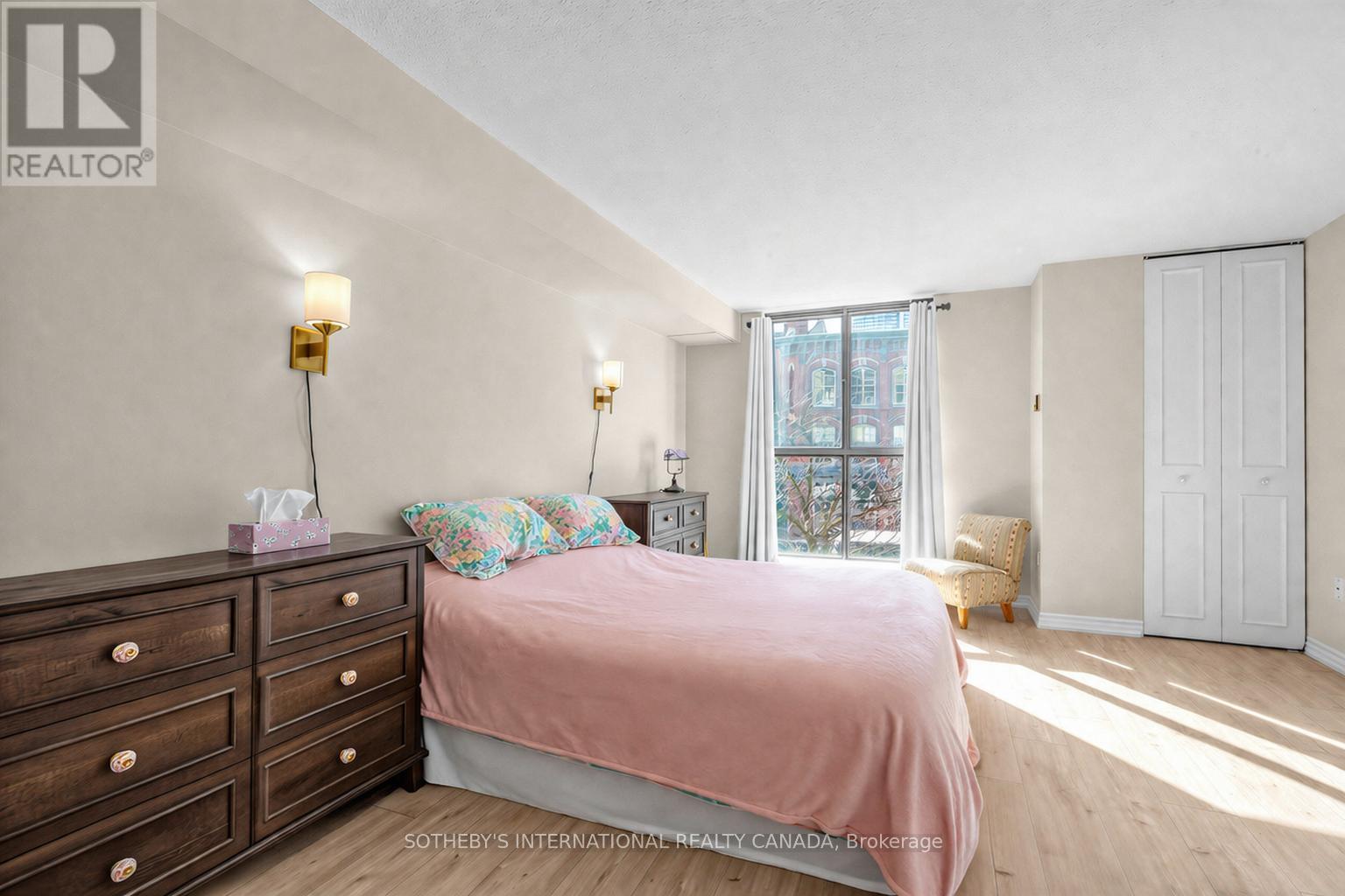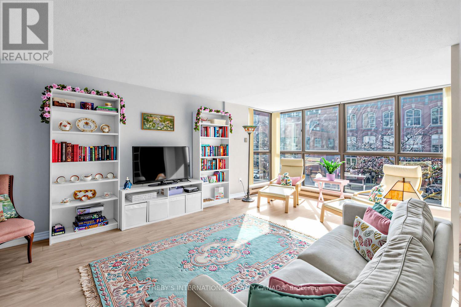 Market Square, a boutique condominium in the heart of the St Lawrence Market district. Bright, beautifully proportioned and thoughtfully laid out, this inviting suite of approximately 1118 square feet offers an exceptional blend of space, comfort, and functionality. A welcoming foyer opens into a defined dining area, seamlessly connecting to an expansive living room filled with natural light from a full wall of windows and showcasing amazing views of St Lawrence Market and the Flatiron Building.The well appointed kitchen offers generous cabinetry and counter space, creating an efficient and practical workspace with a clean, timeless aesthetic. The adjacent dining area provides flexibility for hosting or quiet meals at home.The oversized primary bedroom offers a peaceful retreat with a large walk in closet, while the spacious, fully updated bath features a sleek glass enclosed shower and modern finishes. A separate laundry area adds everyday convenience.Light toned flooring, soft neutral finishes, and a calm, cohesive palette enhance the sense of openness throughout. The layout is exceptionally functional, with a clear separation between living and private areas, offering both comfort and privacy.Unbeatable location with a Walk Score of 99 and Transit Score of 100. Easy access to the second floor terrace with barbecues. Outstanding building amenities include rooftop gardens, saltwater pool, party room, and 24 hour concierge. Steps to theatre, shops, restaurants, TTC, LCBO, Berczy Park, Eaton Centre, the Financial District, and the lake. (id:4555)