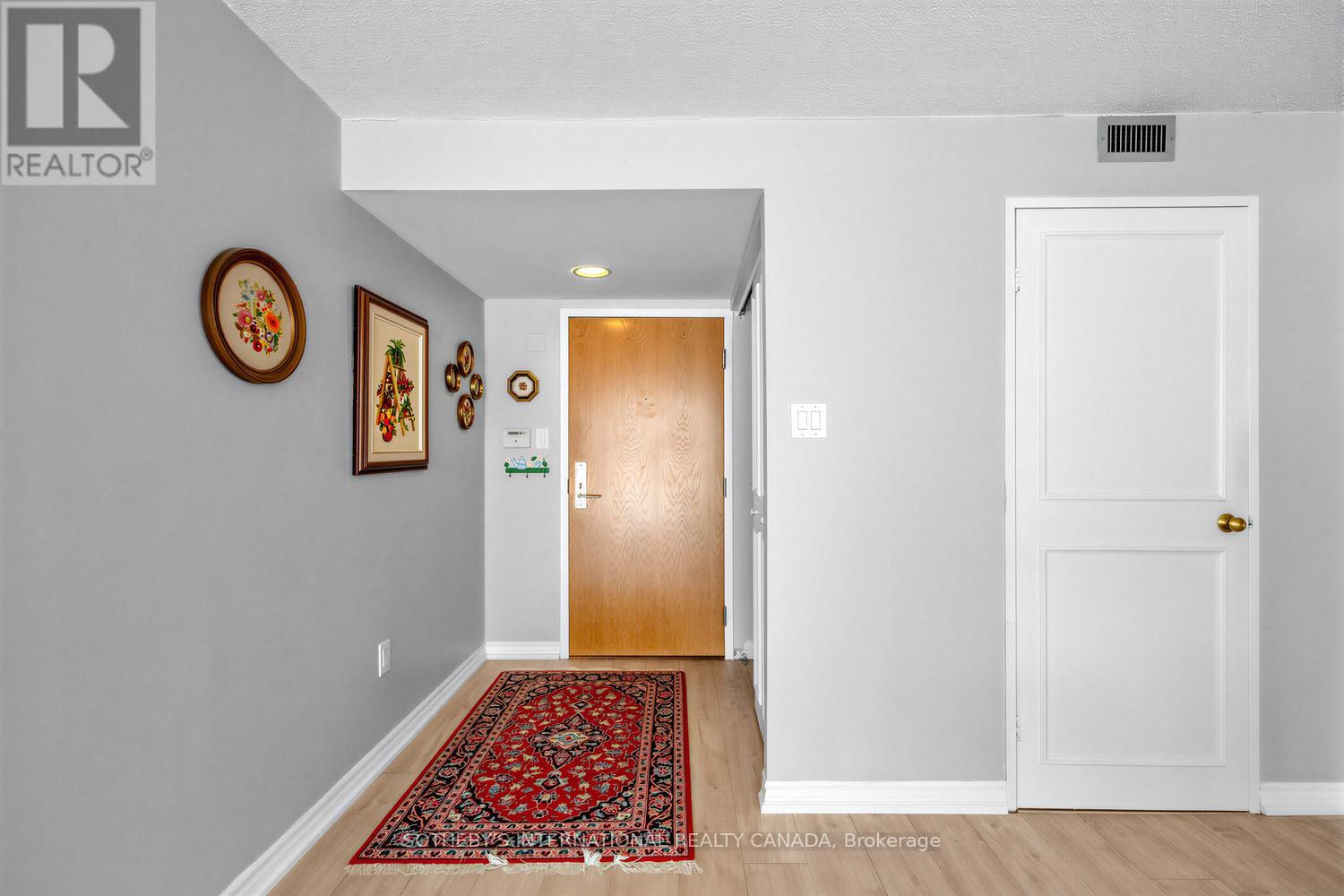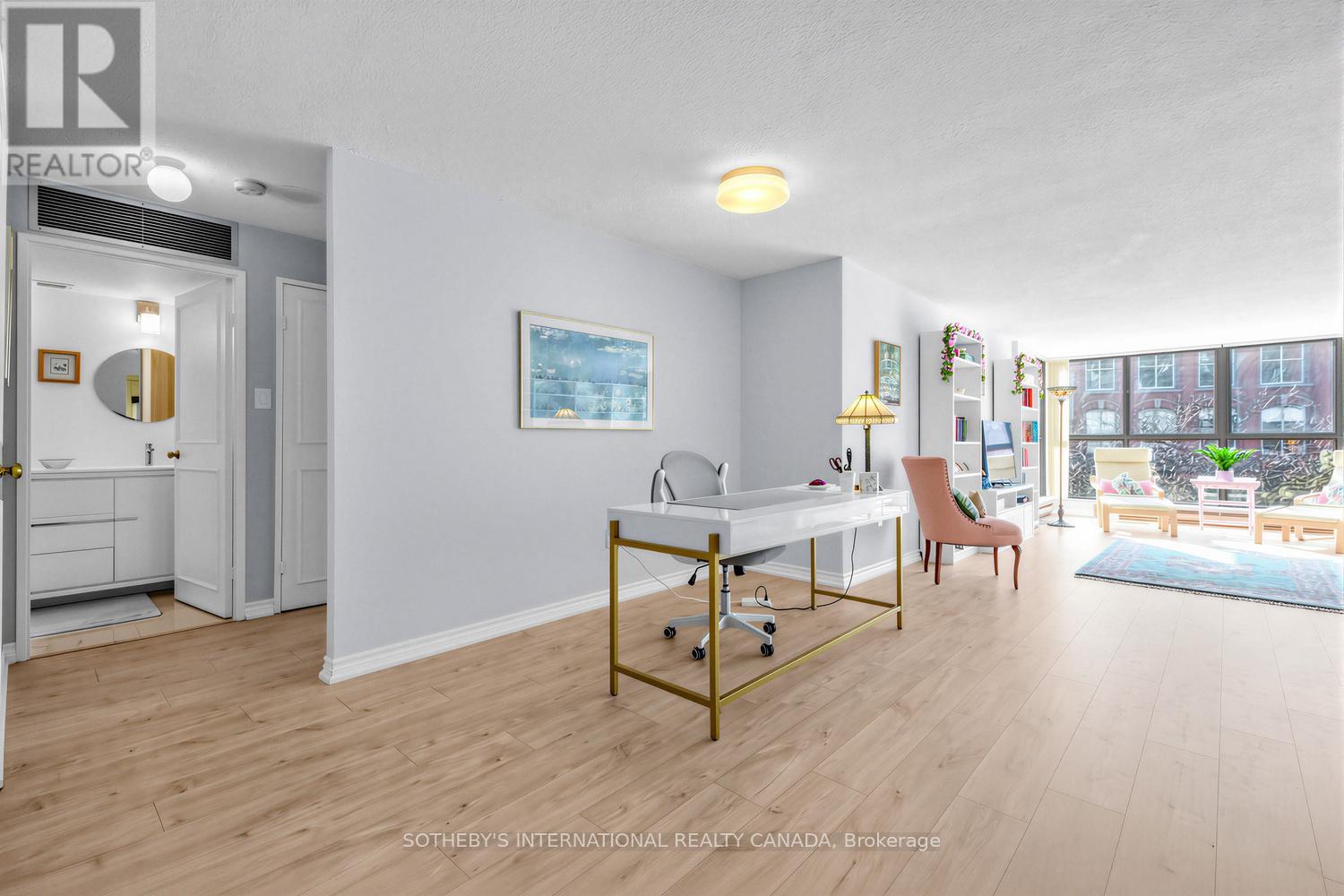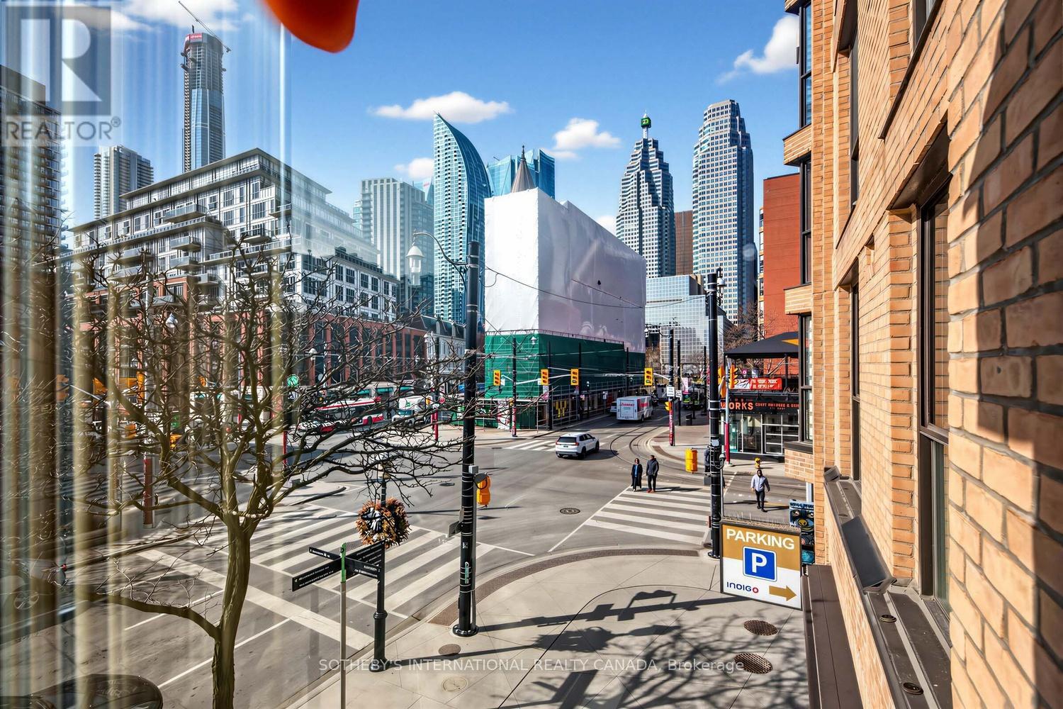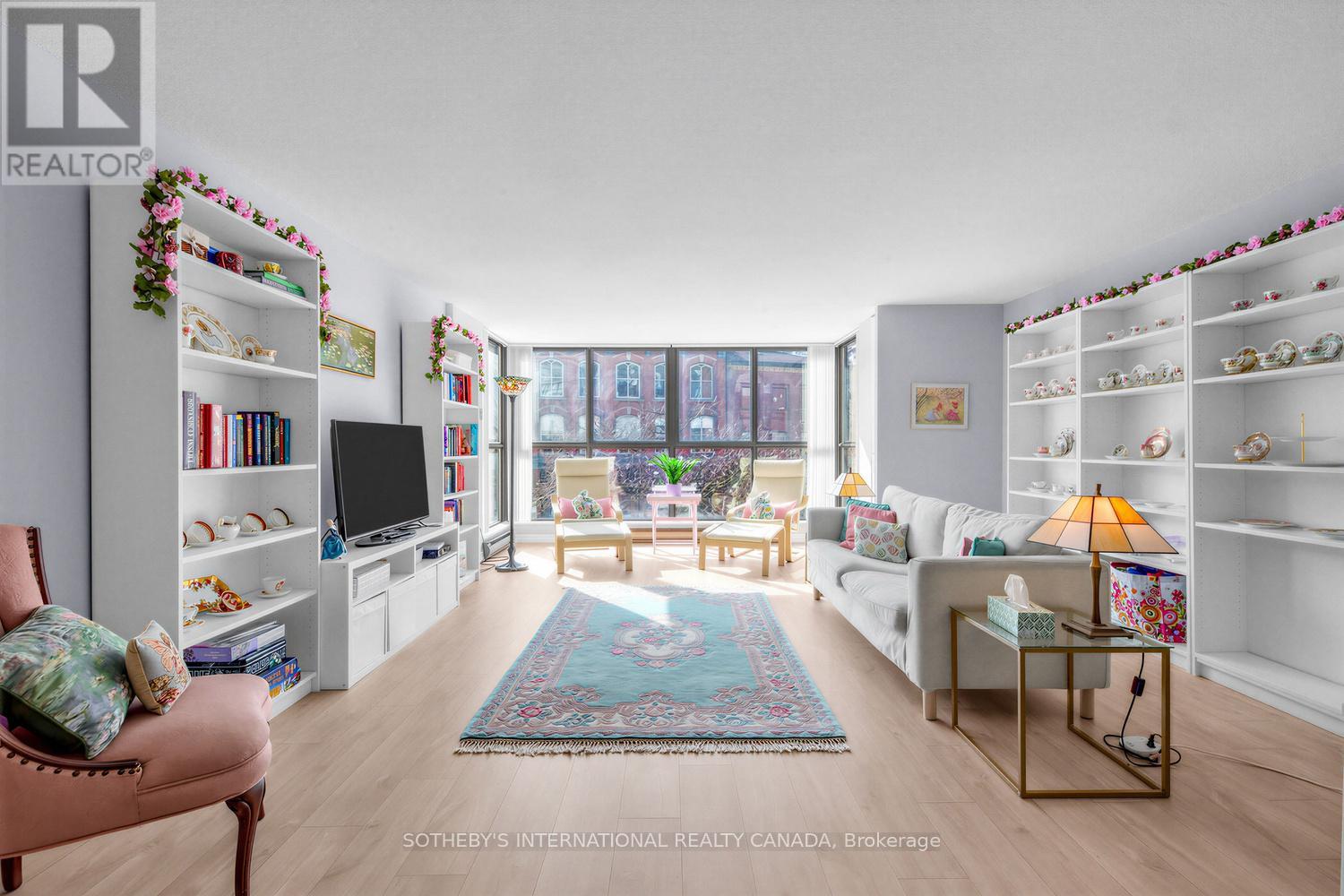 Market Square, a boutique condominium in the heart of the St Lawrence Market district. Bright, beautifully proportioned and thoughtfully laid out, this inviting suite of approximately 1118 square feet offers an exceptional blend of space, comfort, and functionality. A welcoming foyer opens into a defined dining area, seamlessly connecting to an expansive living room filled with natural light from a full wall of windows and showcasing amazing views of St Lawrence Market and the Flatiron Building.The well appointed kitchen offers generous cabinetry and counter space, creating an efficient and practical workspace with a clean, timeless aesthetic. The adjacent dining area provides flexibility for hosting or quiet meals at home.The oversized primary bedroom offers a peaceful retreat with a large walk in closet, while the spacious, fully updated bath features a sleek glass enclosed shower and modern finishes. A separate laundry area adds everyday convenience.Light toned flooring, soft neutral finishes, and a calm, cohesive palette enhance the sense of openness throughout. The layout is exceptionally functional, with a clear separation between living and private areas, offering both comfort and privacy.Unbeatable location with a Walk Score of 99 and Transit Score of 100. Easy access to the second floor terrace with barbecues. Outstanding building amenities include rooftop gardens, saltwater pool, party room, and 24 hour concierge. Steps to theatre, shops, restaurants, TTC, LCBO, Berczy Park, Eaton Centre, the Financial District, and the lake. (id:4555)