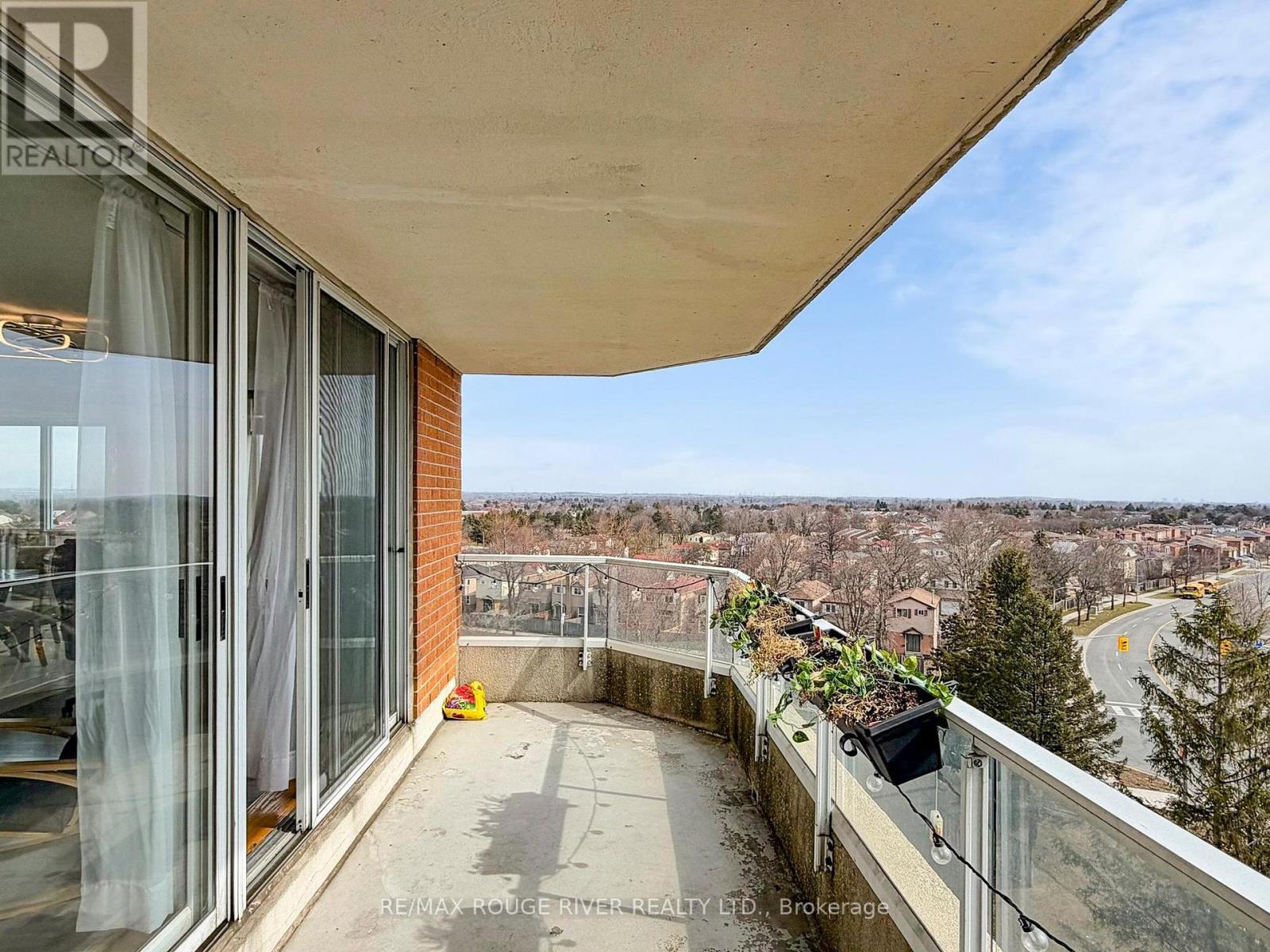 Welcome to Mayfair on the Green in the sought-after Malvern neighbourhood. This bright and spacious corner 2-bedroom condo offers one of the larger layouts in the building, designed for comfortable and practical living. Enjoy a generous open-concept layout with large windows that bring in plenty of natural light and showcase beautiful south-east views. Step out onto the private balcony and take in peaceful, panoramic views, including stunning sunrises over the Rouge Valley. The unit features laminate flooring throughout, a wellappointed kitchen with ceramic flooring, updated countertops, stainless steel hood fan, and modern fixtures. Both bathrooms are finished with upgraded counters, sinks, and faucets. Insuite laundry adds everyday convenience. Ideally located with transit at your doorstep and quick access to Highway 401, making commuting simple. Walking distance to Malvern Town Centre, grocery stores, pharmacies, medical offices, and schools. Just minutes to University of Toronto Scarborough campus, Centennial College, Pan Am Sports Centre, and Toronto Zoo. Well-managed building offering 24-hour gatehouse security and excellent amenities including an indoor pool, fitness centre, and party room. Includes: Locker #7 (Unit 82-B2) and Parking #33 (B2 level). (id:4555)