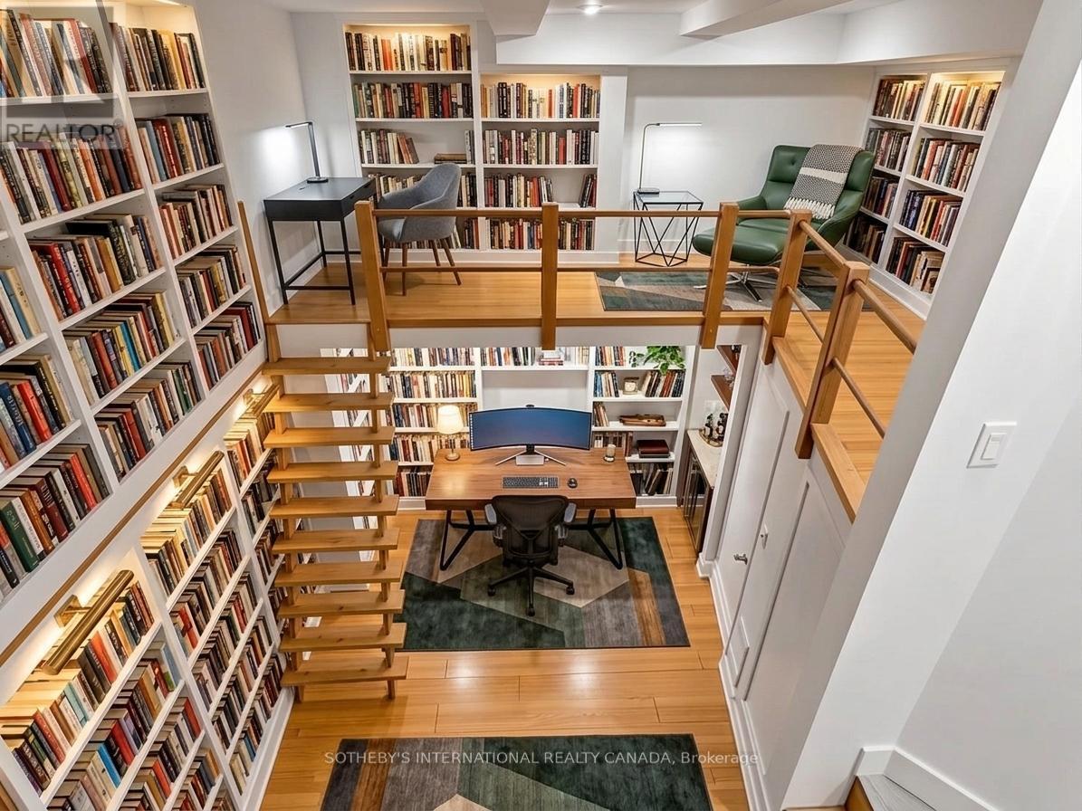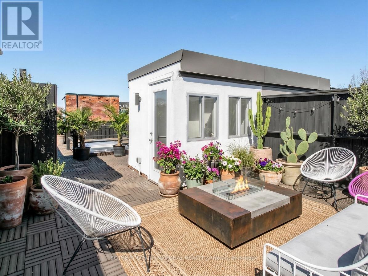 Quietly tucked away just off vibrant Queen Street and steps to Trinity Bellwood's Park, this exceptional urban townhome offers the holy grail of oversized indoor and outdoor living space with incredible light and panoramic city views, in a highly coveted location! With an attached private garage and a near perfect walk score, this multi-level residence has the "wow" factor! Set within an exclusive collection of just eight luxury residences on a quiet, tree-lined street, this sophisticated historic loft conversion blends character with modern versatility. Soaring ceilings and expansive proportions create a striking, open atmosphere fit for both everyday living and inspired entertaining. Expansive living and dining areas flow seamlessly into a large, open kitchen, perfect for hosting. Skylights and oversized north- and south-facing windows bring in natural light throughout the day. Whether you're envisioning a grand home office, creative studio, library or private gym, this home has the perfect ground floor space to create your dream! The generous proportions of this home easily accommodate oversized furnishings like pool tables, hot tubs, ping pong tables, large home theatre screens. Step outside to your private 700 square foot rooftop terrace, complete with sweeping city views and ample space for an outdoor kitchen, lounge area, or even a hot tub-your own urban retreat above it all. This private setting feels worlds away from the city's energy-yet remains steps from it all. This inspiring space and unbeatable location is a must see! Note Library and Gym are AI generated. (id:4555)