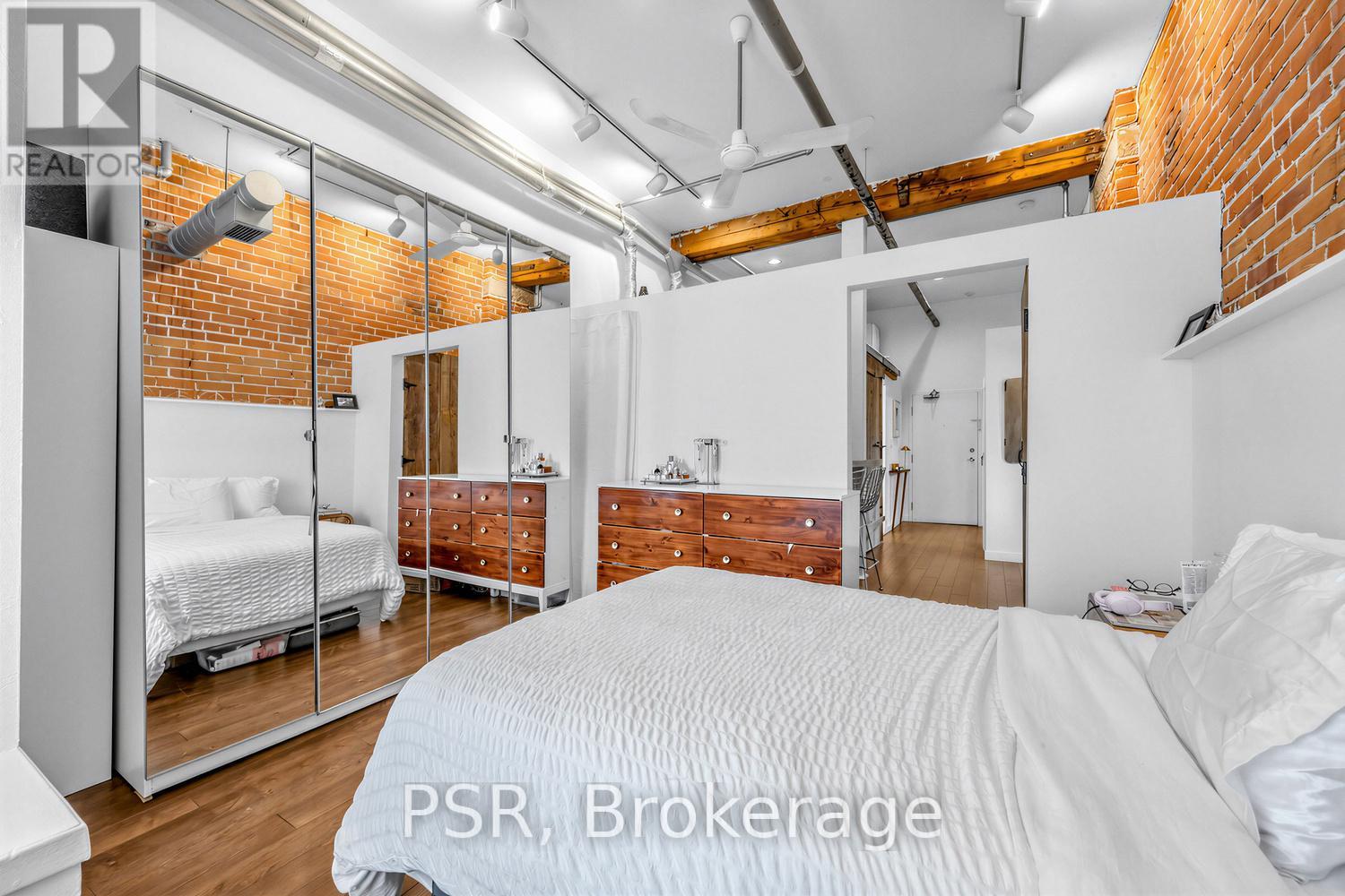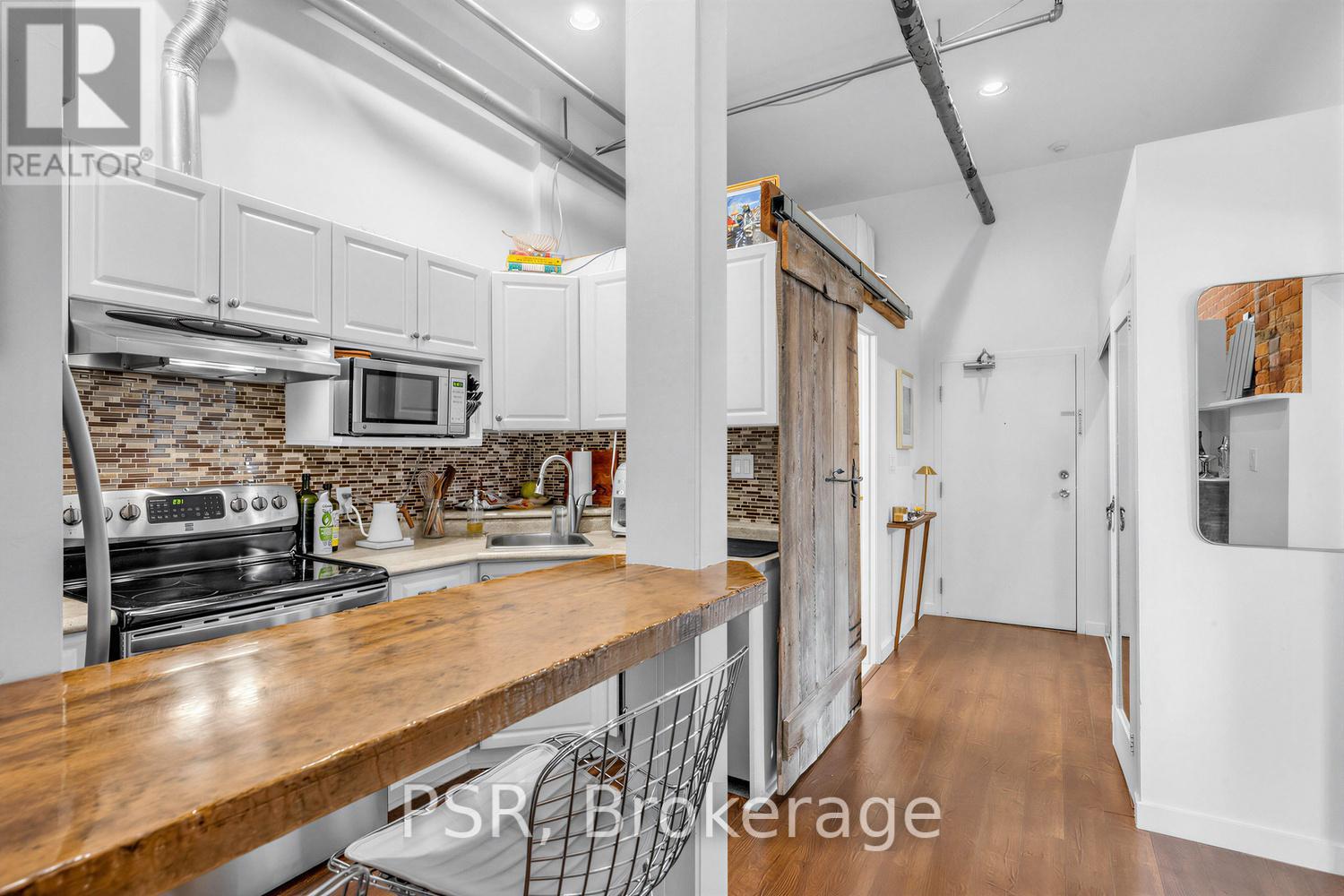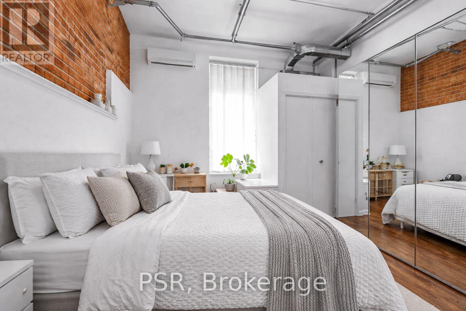 Welcome to this exceptional, sun-drenched brick-and-beam loft in the boutique Stockyards Lofts building! Perfectly positioned on the coveted southwest corner, this authentic hard loft is flooded with natural light throughout the day. Featuring soaring ceilings and a thoughtfully designed layout with defined living spaces, this loft offers the best of both style and functionality. The spacious bedroom provides a true retreat, complete with convenient in-room laundry and large west facing windows. The expansive living area is bright and versatile, easily accommodating both a comfortable living space and a full dining setup. Character-rich details like exposed brick, beams, and unique barn doors add warmth and personality throughout. The updated bathroom adds a modern touch, while the kitchen is equipped with stainless steel appliances and a charming breakfast bar-ideal for casual dining. Complete with an above-ground parking space, this loft checks all the boxes. Located in vibrant Weston-Pellam Park, you'll enjoy easy access to an ever-growing selection of shops, restaurants, and amenities, along with excellent transit options via the nearby St. Clair W streetcar. A rare opportunity to own a hard loft in one of the city's most dynamic neighbourhoods! (id:4555)