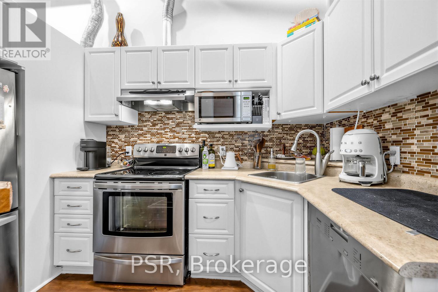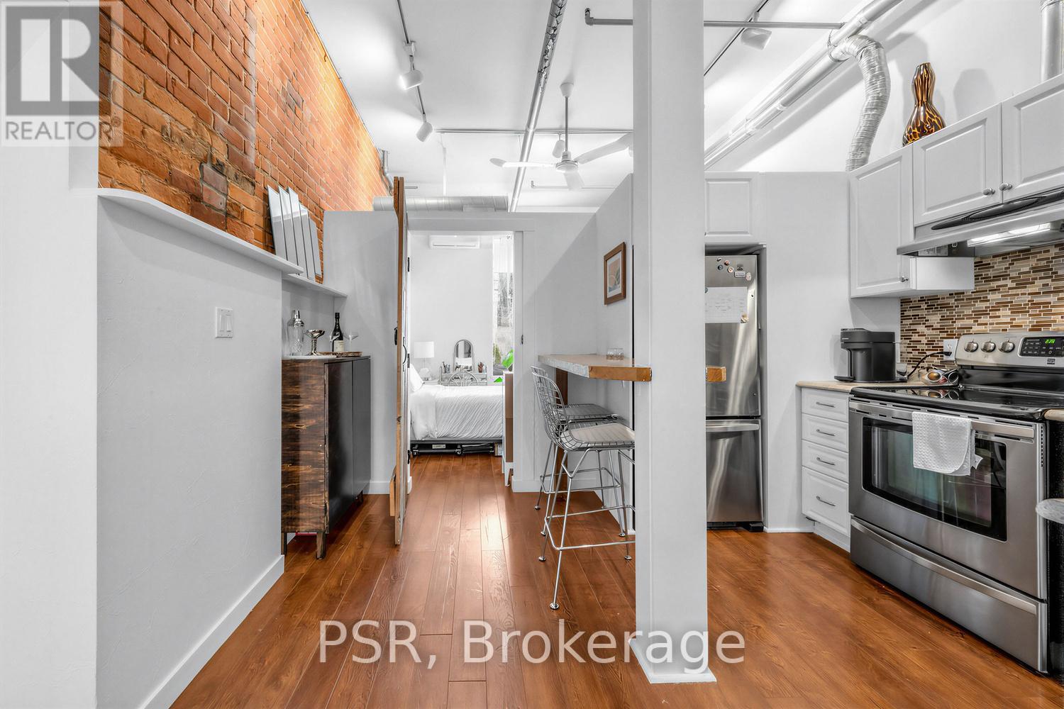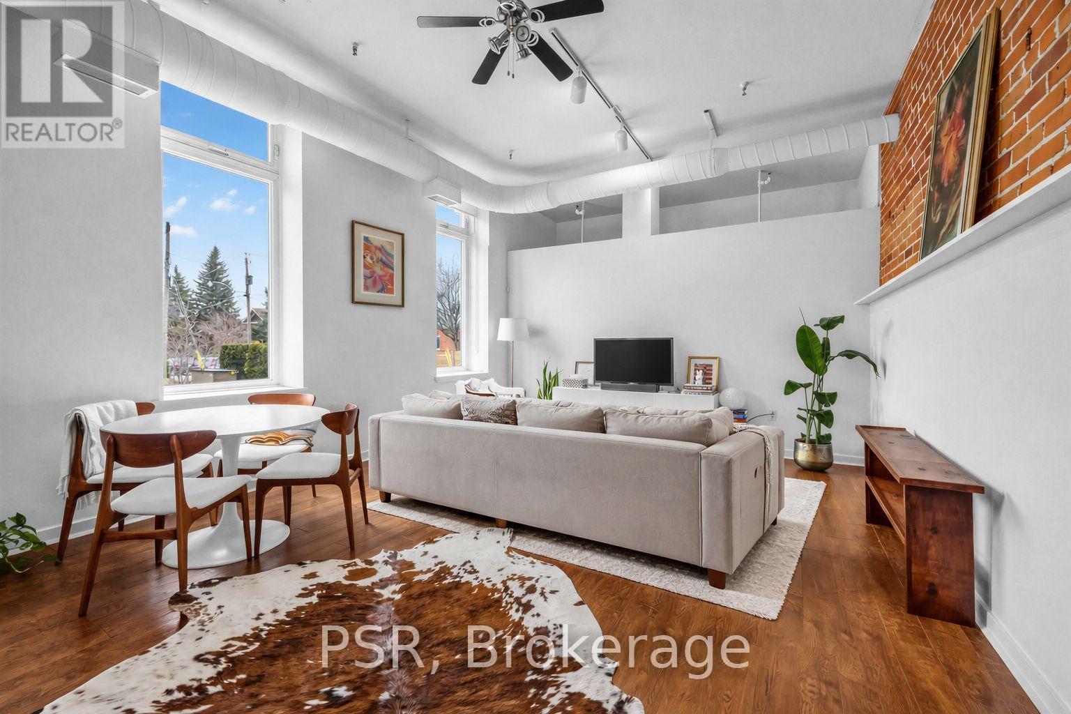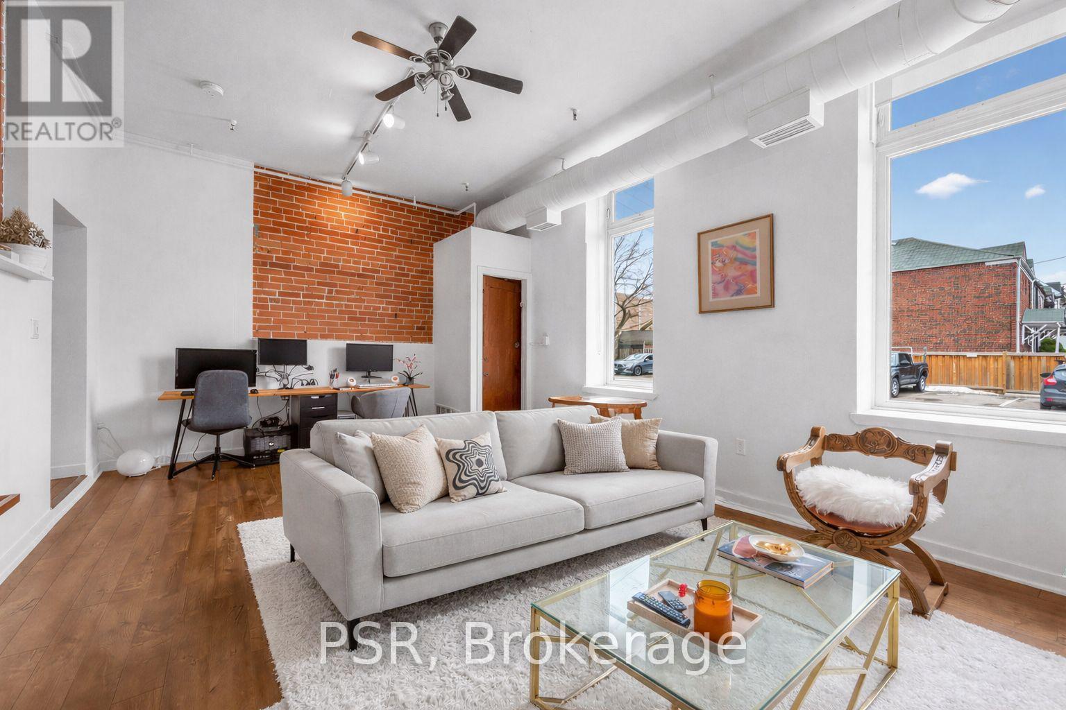 Welcome to this exceptional, sun-drenched brick-and-beam loft in the boutique Stockyards Lofts building! Perfectly positioned on the coveted southwest corner, this authentic hard loft is flooded with natural light throughout the day. Featuring soaring ceilings and a thoughtfully designed layout with defined living spaces, this loft offers the best of both style and functionality. The spacious bedroom provides a true retreat, complete with convenient in-room laundry and large west facing windows. The expansive living area is bright and versatile, easily accommodating both a comfortable living space and a full dining setup. Character-rich details like exposed brick, beams, and unique barn doors add warmth and personality throughout. The updated bathroom adds a modern touch, while the kitchen is equipped with stainless steel appliances and a charming breakfast bar-ideal for casual dining. Complete with an above-ground parking space, this loft checks all the boxes. Located in vibrant Weston-Pellam Park, you'll enjoy easy access to an ever-growing selection of shops, restaurants, and amenities, along with excellent transit options via the nearby St. Clair W streetcar. A rare opportunity to own a hard loft in one of the city's most dynamic neighbourhoods! (id:4555)