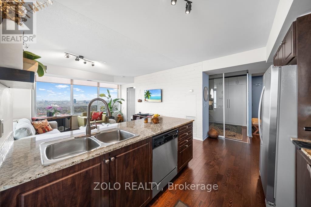 Perched on the 38th floor, this stunning corner suite offers a front-row seat to sweeping, unobstructed lake and city views. Bright, open, and effortlessly elegant, the space is framed by two private balconies, including a serene walk-out from the primary bedroom.The second bedroom has been thoughtfully transformed with a custom-built office and a sleek retractable double Murphy bed (over $11,000), blending design and functionality in a way that actually makes sense.Refrigerator (2022)Washer & Dryer (2022)Laminate flooring in both bedrooms (2021)Warm hardwood floors run through the main living space, leading into a modern kitchen finished with stainless steel appliances and granite countertops.Residents enjoy access to premium amenities including a fully equipped gym, indoor pool, guest suites, and generous visitor parking.Ideally located just minutes from downtown with easy access to Mimico GO Station, this home offers that rare balance of calm waterfront living and city convenience. Current AAA tenant willing to stay or vacate. (id:4555)