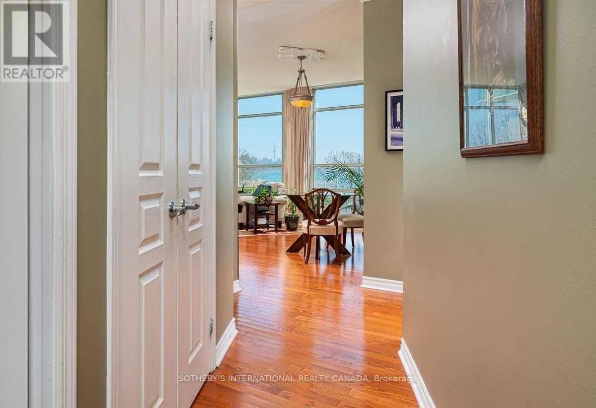 Experience elevated waterfront living along prestigious Lake Shore Boulevard with this absolutely stunning corner suite offering unobstructed panoramic views of the city skyline, shimmering lake, and Toronto Islands. Bathed in natural light, the expansive living and dining area features rich hardwood flooring, floor-to-ceiling windows, and a seamless walkout to a private balcony-perfect for taking in breathtaking sunrises. The thoughtfully designed galley kitchen is equipped with built-in appliances and a charming breakfast area, ideal for enjoying your morning coffee while watching the vibrant lakeside scene unfold. Two generously sized bedrooms provide exceptional comfort, including a serene primary retreat complete with a 4-piece ensuite, built-in wardrobe, and walk-in closet. Enjoy the convenience of a premium parking space located close to the elevator PLUS two storage lockers. This exceptional residence offers the best of waterfront living, just steps to local cafés, acclaimed restaurants, public transit, and the scenic Sunnyside Boardwalk, with quick access to the Gardiner Expressway and Queen Elizabeth Way. Indulge in a full suite of building amenities, including a fully equipped fitness centre, 24/7 concierge desk, elegant party room, and a quiet library lounge-perfect for unwinding with a good book. (id:4555)