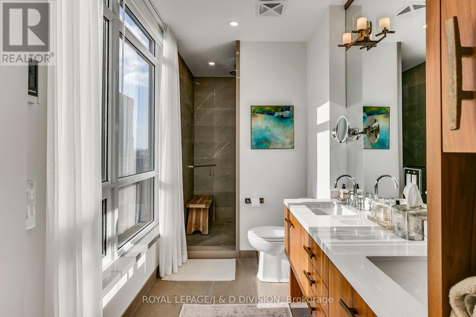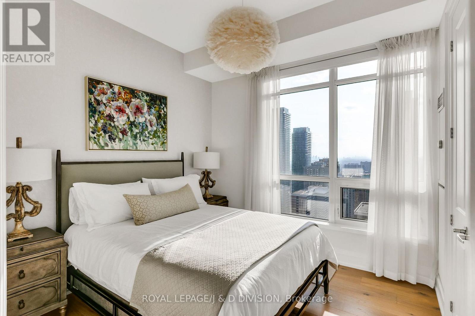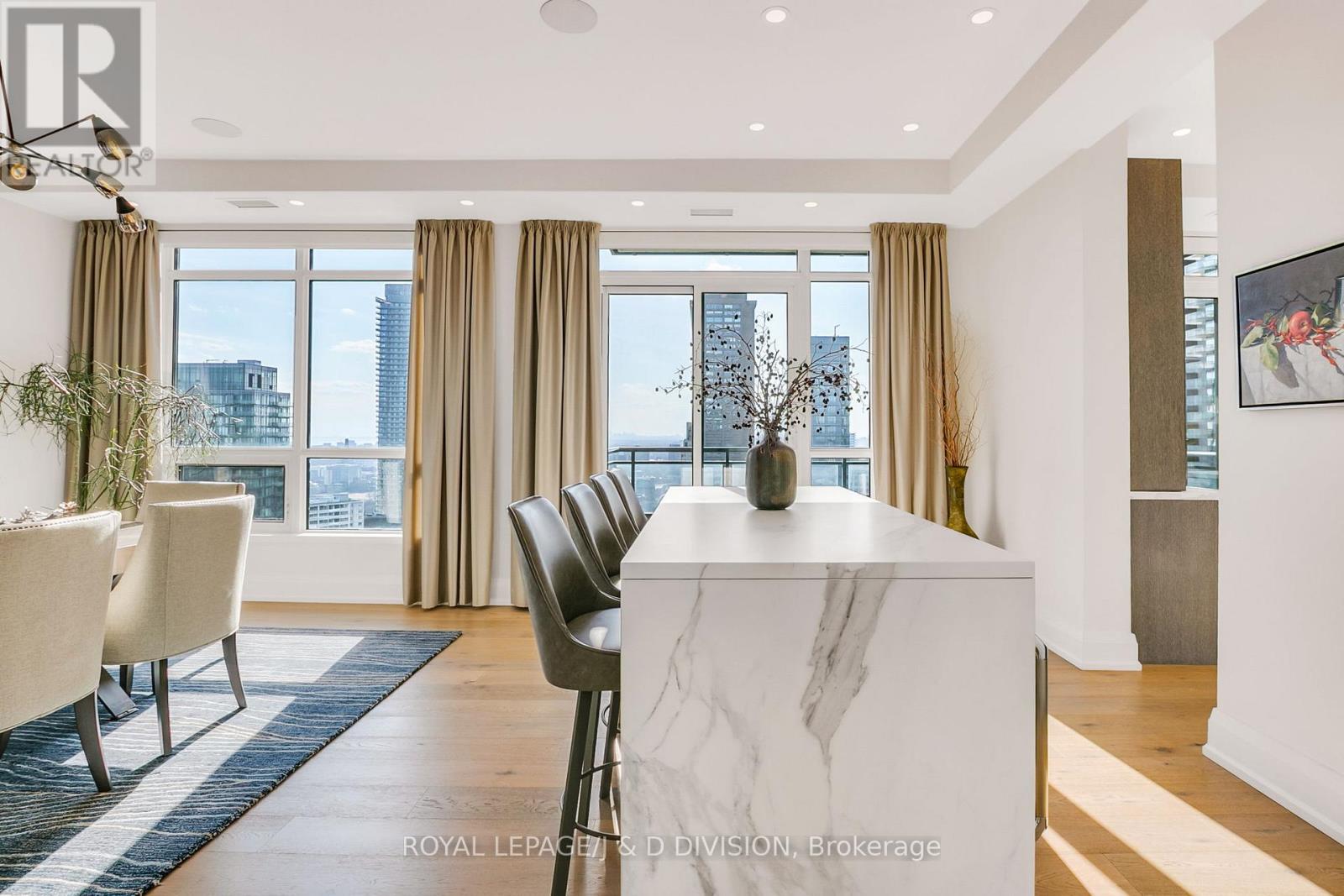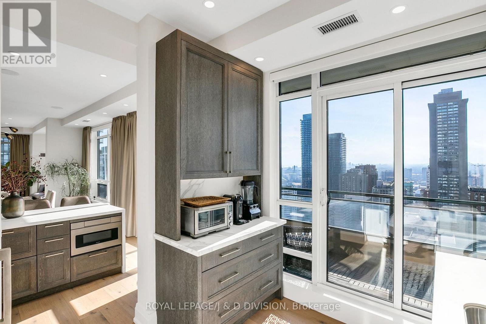 Experience the pinnacle of urban luxury in this expansive 1,954 sq. ft. sub-penthouse residence, offering a rare bungalow-in-the-sky lifestyle on the edge of prestigious Yorkville. Shared with only one other suite on the floor, this home spans the entire westerly side of the building, providing a front-row seat to stunning daily sunsets. Bathed in epic natural light from floor-to-ceiling windows and soaring 10-foot ceilings throughout, the interior is finished with stunning wide-plank white oak hardwood and elegant porcelain flooring.The heart of the home is an open-concept living and dining area anchored by a cozy gas fireplace, a custom porcelain-clad waterfall island, and a strategic pantry/bar area with a full-size wine fridge and abundant storage. The chef-inspired kitchen is a standout, featuring custom-designed cabinetry by the renowned Downsview Kitchens, premium appliances, and a gas range. Truly extraordinary for city living, this residence boasts five sets of patio doors leading to a spacious south-facing terrace and two west-facing balconies-totalling 371 sq. ft. of private outdoor space. The main terrace features a rare built-in gas line for BBQs, which are permitted. For added convenience, gas service for the BBQ, fireplace, and cooktop is included in the monthly maintenance fee.Unique to this home are two separate entrances: a formal main entry and a highly functional secondary mudroom with a custom built-in bench. The primary suite is a true retreat featuring a 5-piece spa-like ensuite, four closets, and private balcony access. Includes two-car parking and an owned locker. Residents enjoy premium amenities including a 24-hour concierge, exercise room, pool, a 17th-floor garden, and two available guest suites for visiting family and friends.This dog-friendly building welcomes pets of all shapes and sizes. Steps from the subway, Eataly, and world-class shopping, this is a rare opportunity for refined city living with flexible possession available. (id:4555)
