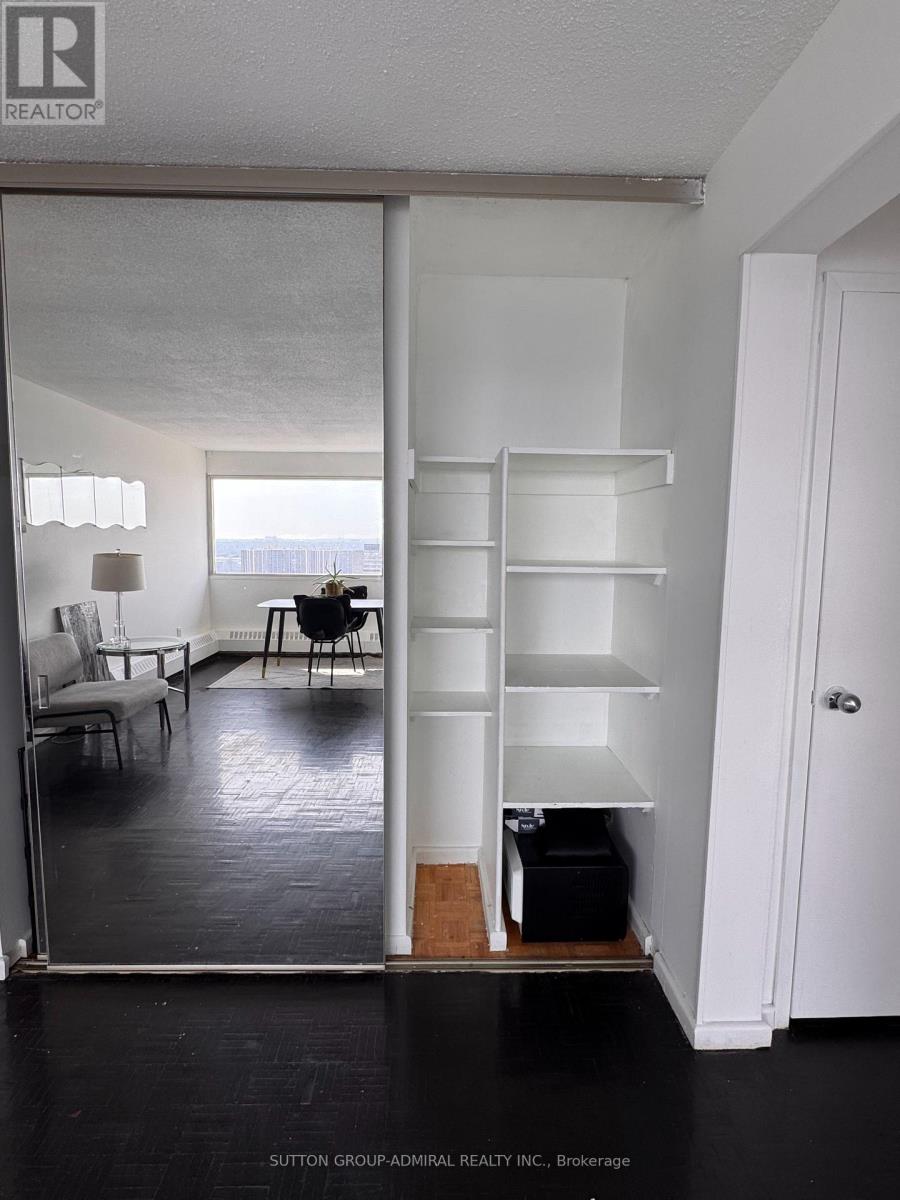 Welcome to unit 2405. This one Bed + Den (with Parking & Locker) is full of light, full of storage and the perfect place to call home. The building has a pool & plenty of visitor parking alongside other amenities Included in Maintenance- Cable, Electricity, Internet, Water, Parking, Locker. Inside the unit enjoy plenty of built in storage with mirrored sliding door closets in the bedroom and in the living/dining area. Additional storage closet beside the bathroom + exclusive use storage locker. There bedroom comfortably fits a queen bed and the den can be used as an office, dining area, or secondary room. Unit is carpet free. Close to schools, subway stops, transit lines, countless grocery stores, shops and the Aga Khan Museum. (id:4555)