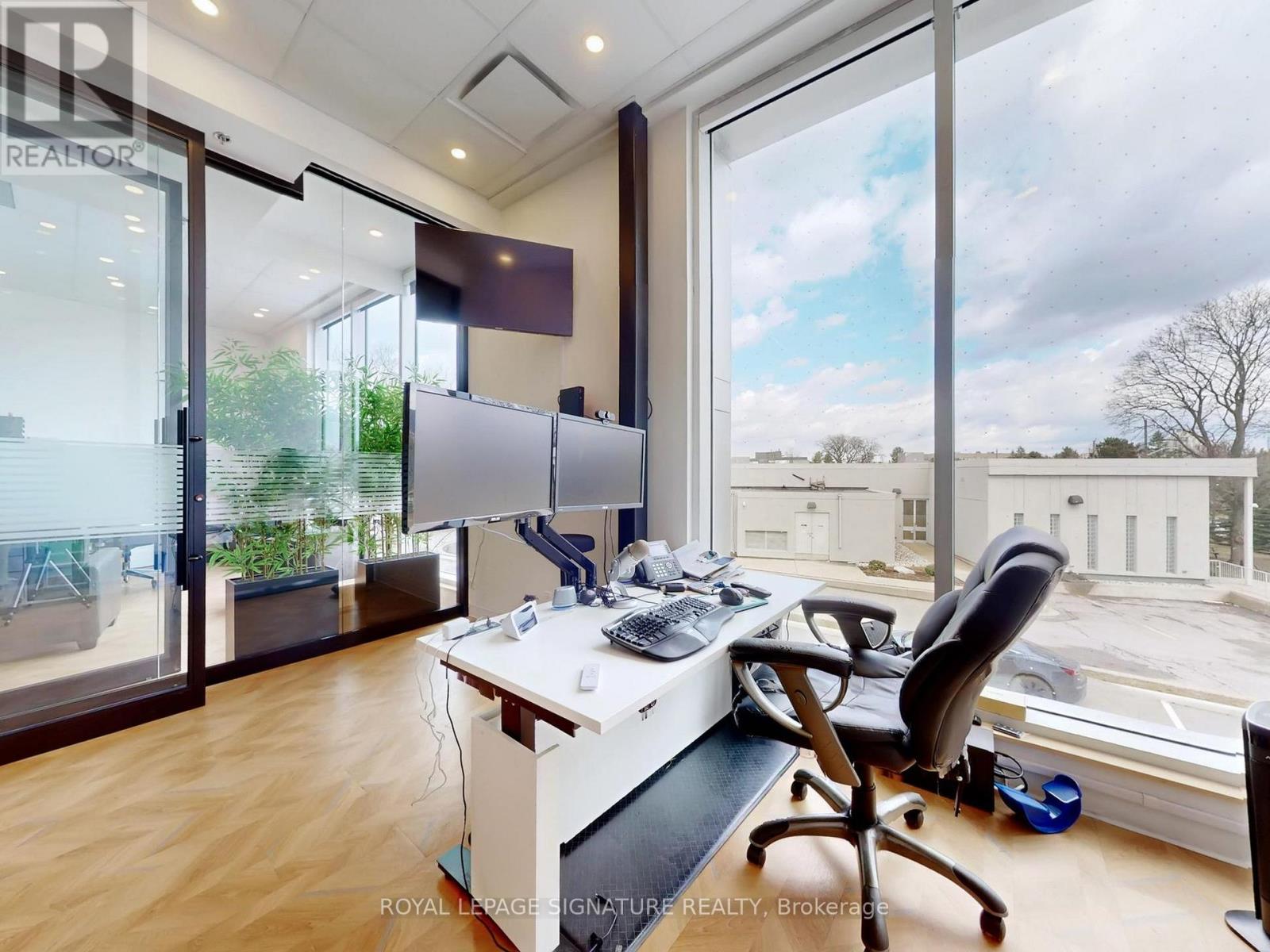 Rare opportunity for investors or end-users to acquire a newly renovated, turnkey professional office space. This modern unit features a full kitchenette and a private 4-piece washroom, complemented by impressive 10 floor-to-ceiling windows and soaring 13.5 ceilings. Designed for functionality and efficiency, the space accommodates up to 8 workstations and includes a glass-enclosed boardroom with seating for 10, along with two spacious private offices. Additional upgrades include custom lighting, a dedicated storage room with built-in cabinetry, and commercial-grade automated window coverings. Ideally located in the highly sought-after Leslie & York Mills area, with convenient access to the DVP and Highway 401. Just steps to public transit and Southwell Park, and minutes from the shops, dining, and amenities at CF Shops at Don Mills. Flexible occupancy: existing tenants are willing to stay or vacate. Contact listing agent for further details. (id:4555)
