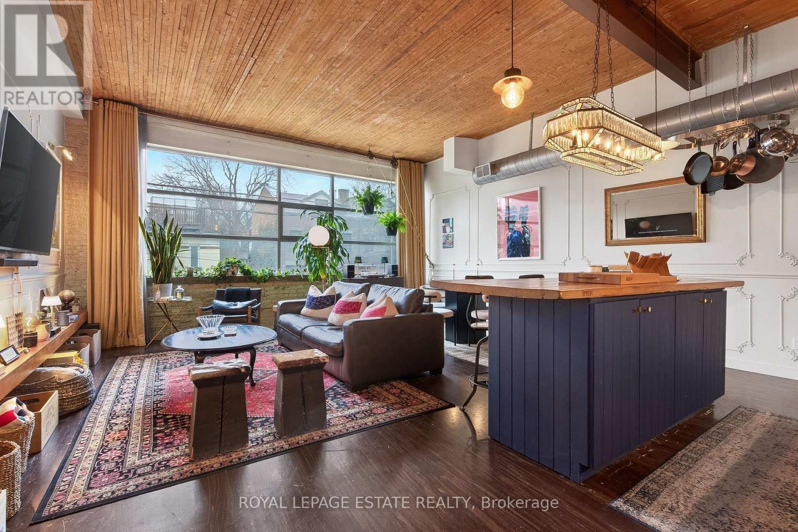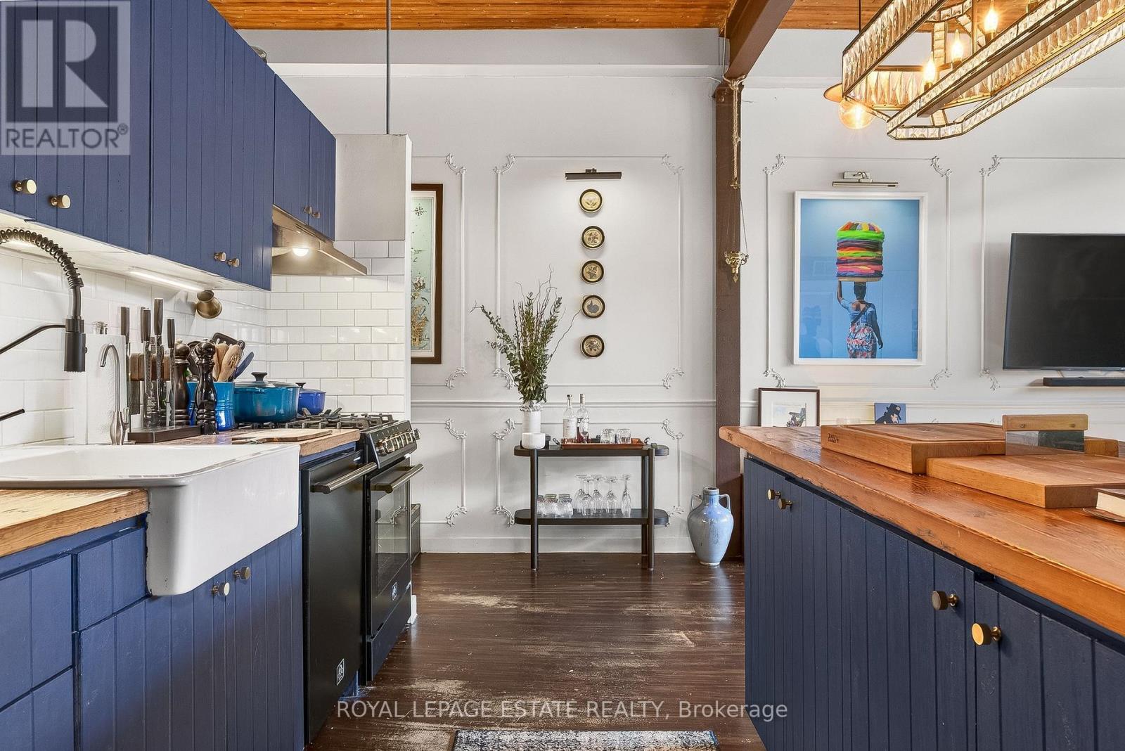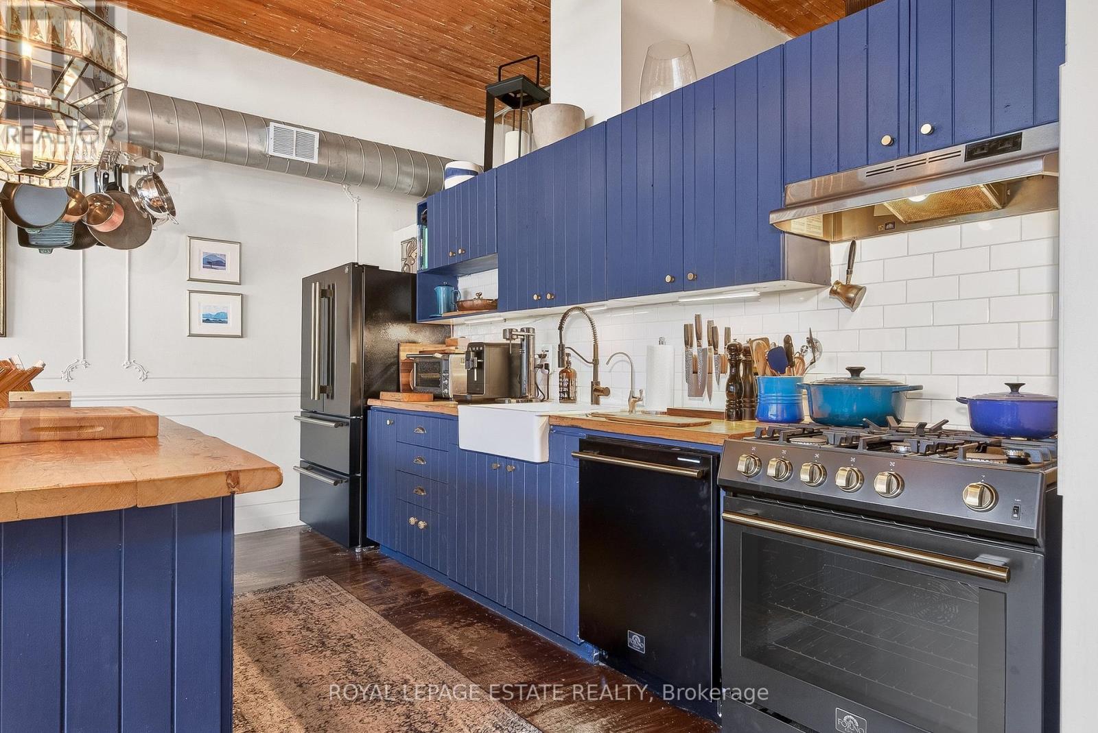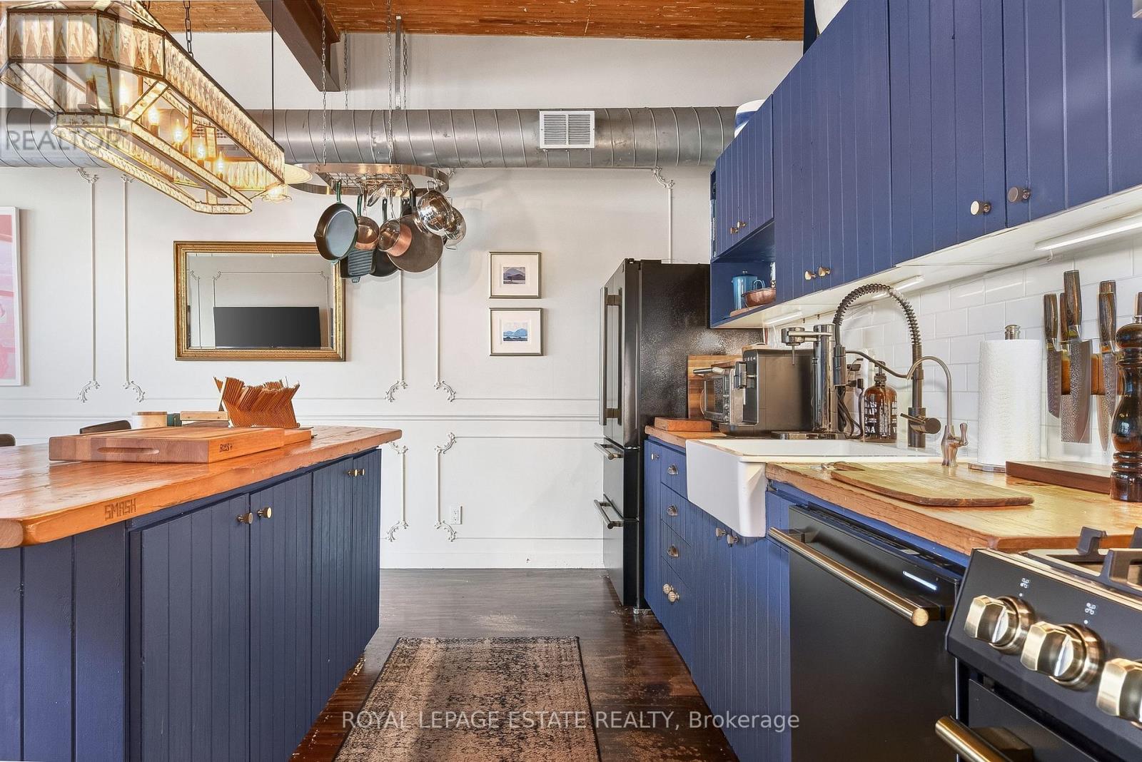 Is there anything more Toronto than a hard loft?This 1 bedroom, 1 bathroom suite at Century Lofts offers 841 sqft of open-concept space in a boutique, converted building built in 2000. Framed by oversized warehouse-style windows, the space is filled with natural light, while polished concrete floors with a subtle wood grain finish bring warmth to the industrial feel.The open layout is anchored by an updated kitchen featuring blue cabinetry, butcher block countertops, and a full suite of brand new Forno appliances. A newly added gas line allows for a proper gas range with cast iron details, making the kitchen as functional as it is striking.Open, flexible, and easy to live in, the space adapts to whatever your day looks like, whether that's a quiet night in or having people over.Major system upgrades have all been taken care of, including a new furnace (2026), owned tankless water heater (2026), water softener (2026), reverse osmosis system (2026), and air conditioning (2022).Century Lofts is a well-maintained boutique building with updated amenities, including a rooftop terrace with BBQs, gym, and party/meeting room. Located in the heart of downtown, just steps to TTC, cafés, restaurants, and everyday essentials.Includes 1 parking space and 1 locker. (id:4555)