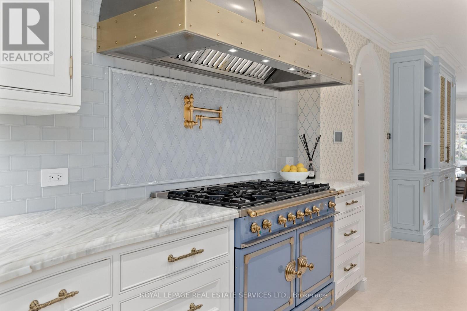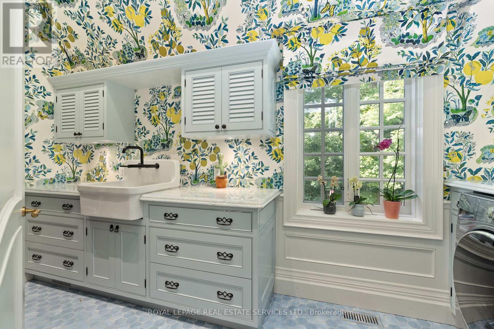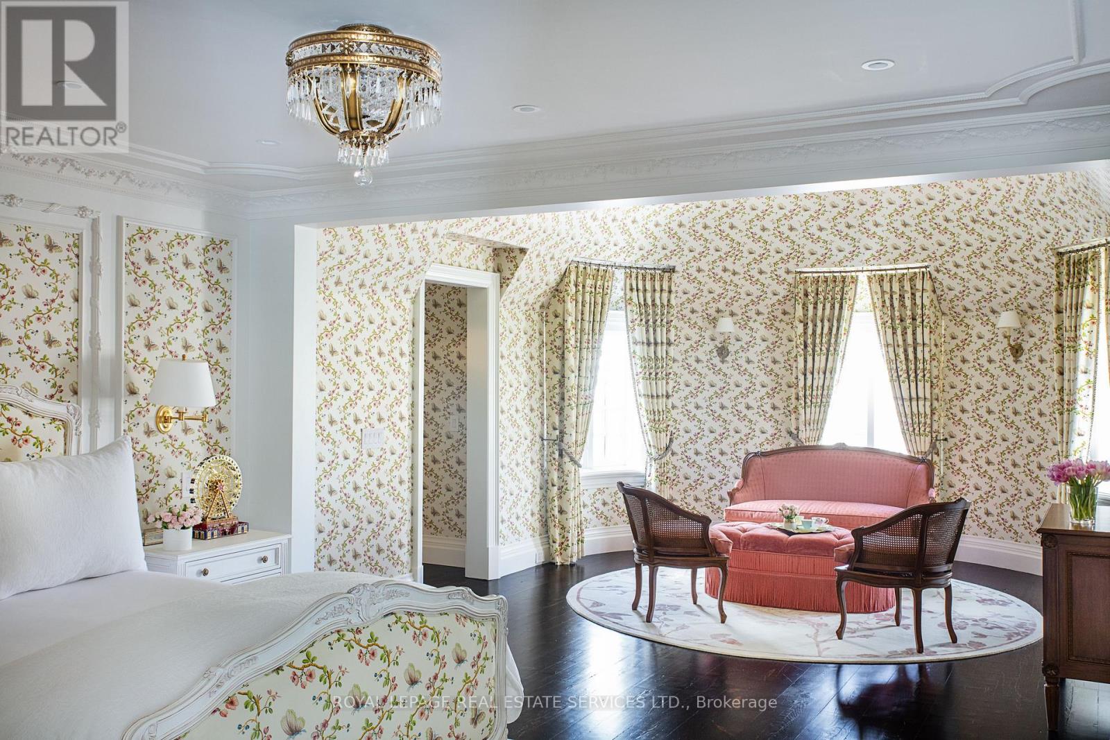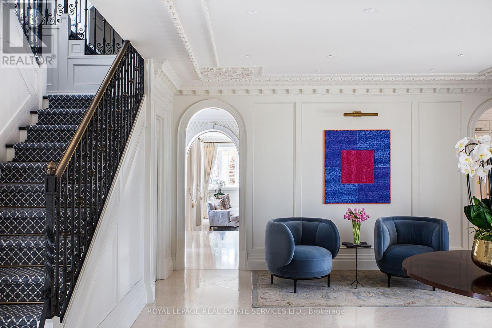 As one of Toronto's original landmark estates, the 'Rosewood Estate' sets the bar for uncompromising luxury in the city. Tucked discreetly at the end of a quiet cul-de-sac, the residence rests on a sprawling 1.12 acre private ravine lot. Reimagined in 2019 by acclaimed architect Lorne Rose, with interiors by Dvira Interiors, and built to exacting standards by JTF Custom Homes, the home is a masterclass in vision, craftsmanship, and enduring design. The approach is cinematic: a stone and wrought iron fence opens to manicured gardens, mature maple trees, and imported European planters that frame the limestone facade and cedar roofline. A heated drive and walkways lead to grounds designed for both grandeur and privacy, where an elegant saltwater pool, cabana, outdoor kitchen, fireplace, and a full sports court are seamlessly woven into the landscape. The gardens dissolve into a lush ravine backdrop, offering rare tranquility within the city. Inside, nearly 12,000 square feet of living space unfolds with quiet confidence. Timeless custom crown moulding and wainscoting, hand-carved marble fireplace mantels, and imported European wallpaper and hardware create a layered, textural narrative throughout. Built-in cabinetry and vanities by Falcon Kitchens anchor the principal rooms, while marble counters, bespoke lighting, custom drapery, and automated blinds reflect meticulous attention to detail. The chef's kitchen is equipped with a suite of luxury appliances, including a La Cornue range, and flows effortlessly into both formal living spaces designed for modern family life. The upper levels offer five serene bedrooms, including a primary retreat with soaring vaulted ceilings, dual bespoke dressing rooms, and a lavish marble-clad ensuite. The lower level rivals a private club, complete with a state-of-the-art theatre, glass-enclosed gym, recreation spaces, a nanny suite, and a large laundry room. Rosewood Estate is not merely a residence, it is a legacy property. (id:4555)