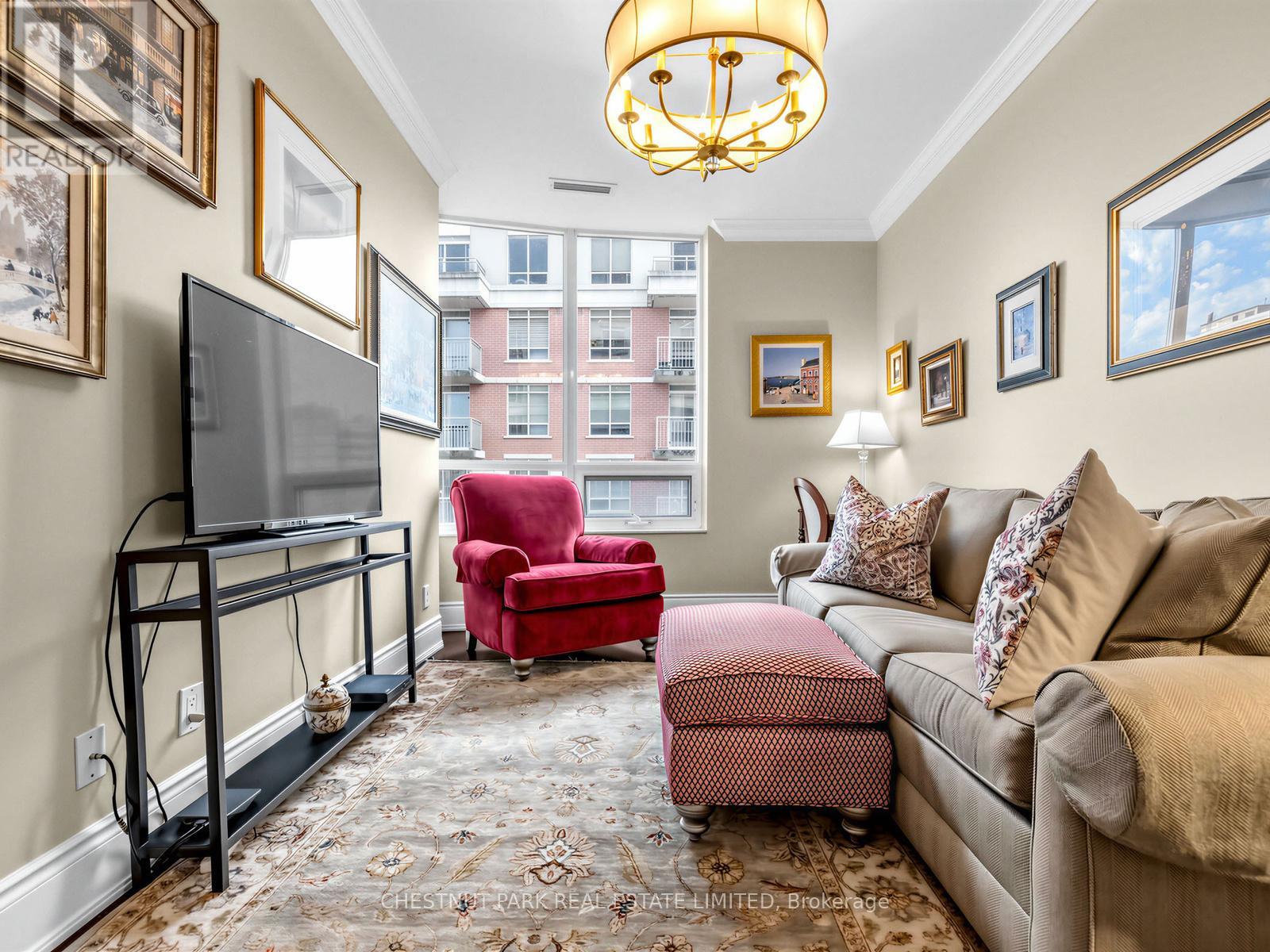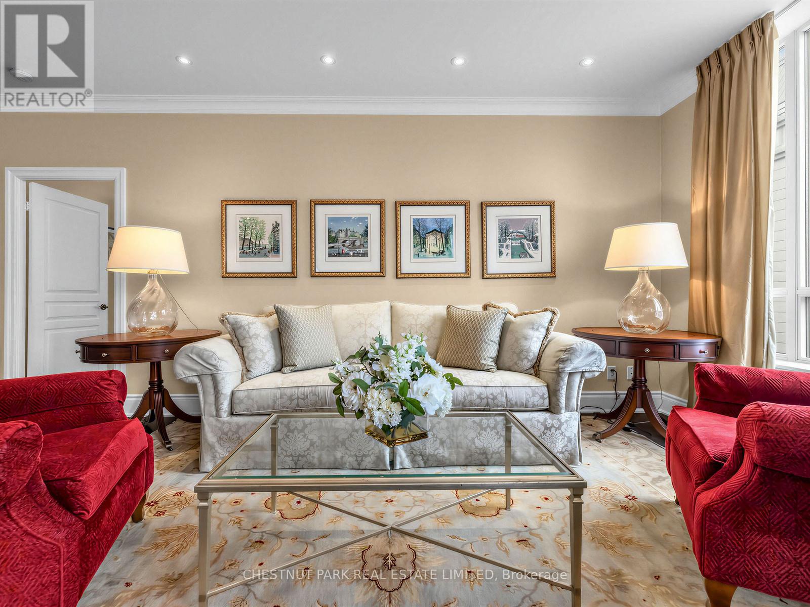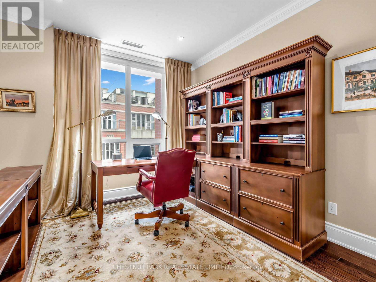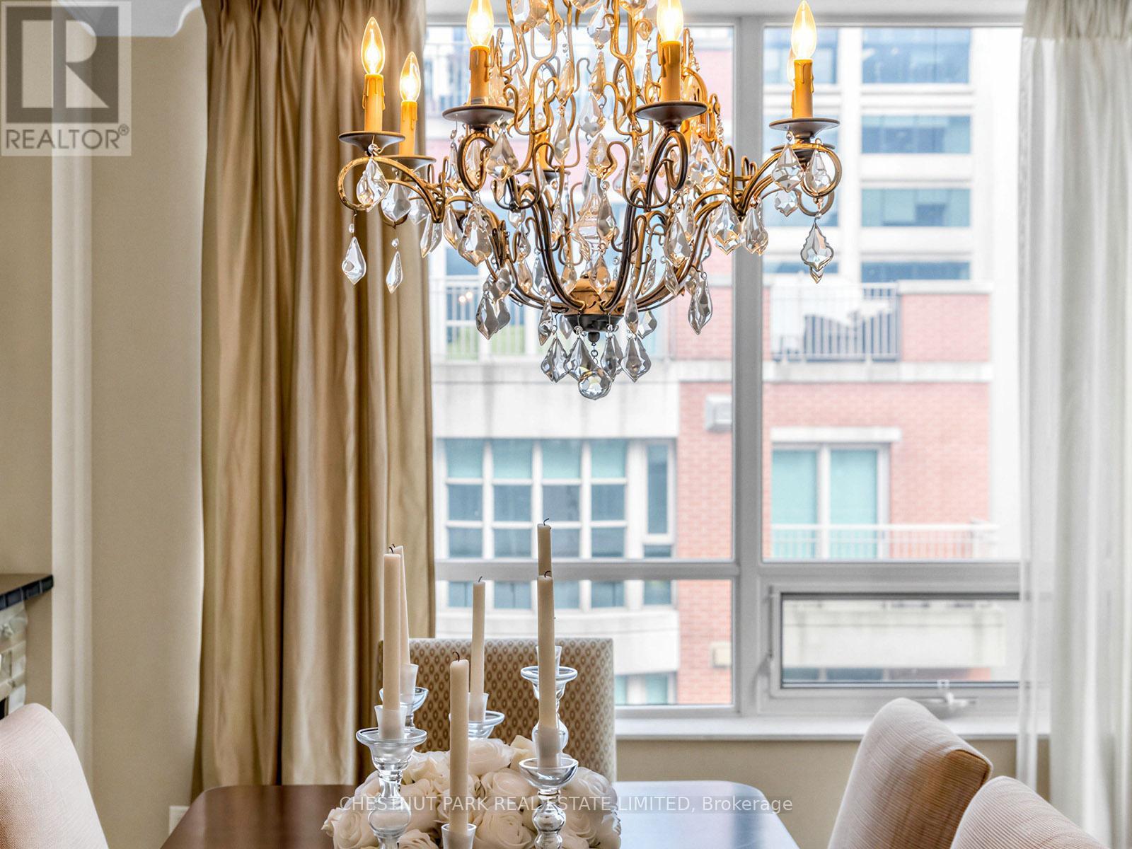 Refined and elegant. this expansive 1,735 sq ft south-east corner residence is filled with natural light and designed for both comfortable living and sophisticated entertaining. Featuring two private balconies, 9 ft ceilings and engineered hardwood flooring throughout, the suite offers a gracious, well-proportioned layout.The updated eat-in kitchen is both functional and beautifully appointed, complete with granite countertops, matching backsplash, stainless steel appliances and abundant storage. A walkout to the balcony with a gas BBQ line makes outdoor dining effortless. The oversized formal living and dining rooms are anchored by a striking three-way gas fireplace, creating a warm and inviting atmosphere.A thoughtfully designed split-bedroom floor plan ensures privacy. The primary retreat is a true sanctuary, featuring a custom walk-in closet, an additional double closet and a spacious 6-piece marble ensuite with double vanities and excellent storage. A generous adjoining sitting area or home office offers flexibility and could easily be converted into a third bedroom. The second bedroom, currently used as a den, includes a double closet and ample space.Complete with the rare offering of two-car parking and two lockers, this exceptional condo is located just steps from the shops, dining and easy transit of Yonge & St Clair. Residents enjoy premium amenities including 24-hour concierge, visitor parking, a fitness centre, guest suite and party room. (id:4555)