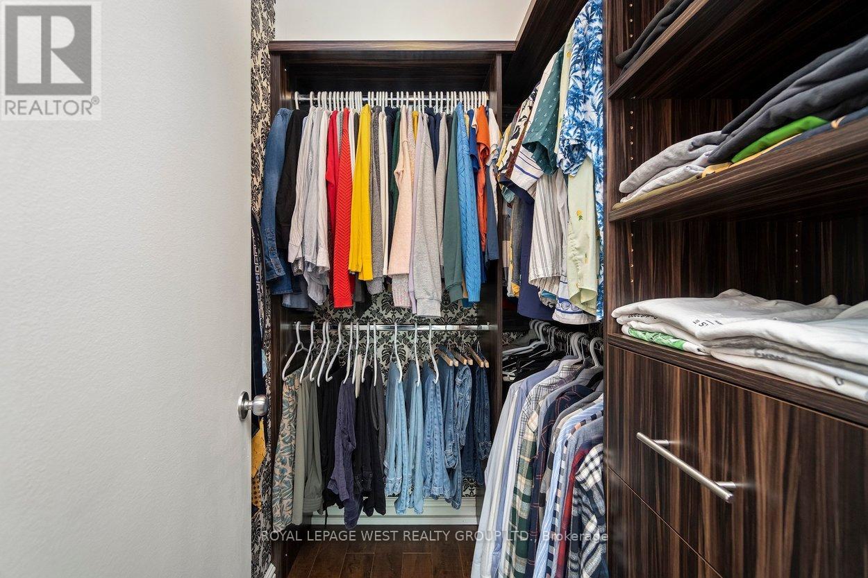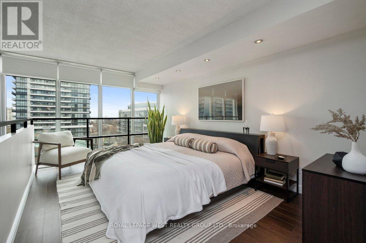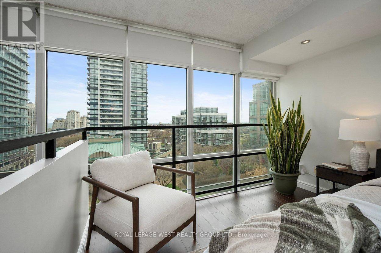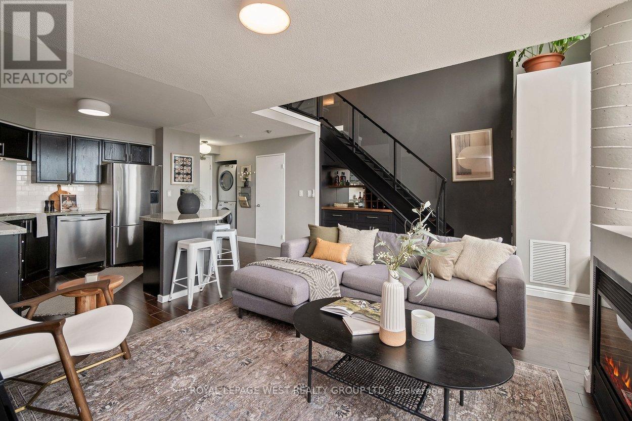 Rarely offered two-storey, south-facing loft at Mystic Pointe, showcasing serene views of lush greenery and the lake, and no signs of the highway. Sun-filled throughout the day, this bright, open-concept space offers just under 1,000 sq.ft. of well-designed living. Soaring 17 ft ceilings and expansive windows create a dramatic, airy living area, perfect for both relaxing and entertaining. The open kitchen features granite countertops and a breakfast bar that seamlessly connects to the living space, making hosting effortless. A custom bar area with built-in storage tucked beneath the stairs adds both function and style. The main level includes a convenient powder room, while the upper level offers a spacious bedroom, 4-piece bathroom, a walk-in closet with built-ins for extra storage, and a versatile den ideal for a home office, nursery, or guest space. Situated in the heart of Park Lawn & Lake Shore, steps to the waterfront, parks, trails, and everyday amenities. This location offers a perfect balance of urban convenience and lakeside calm living. (id:4555)