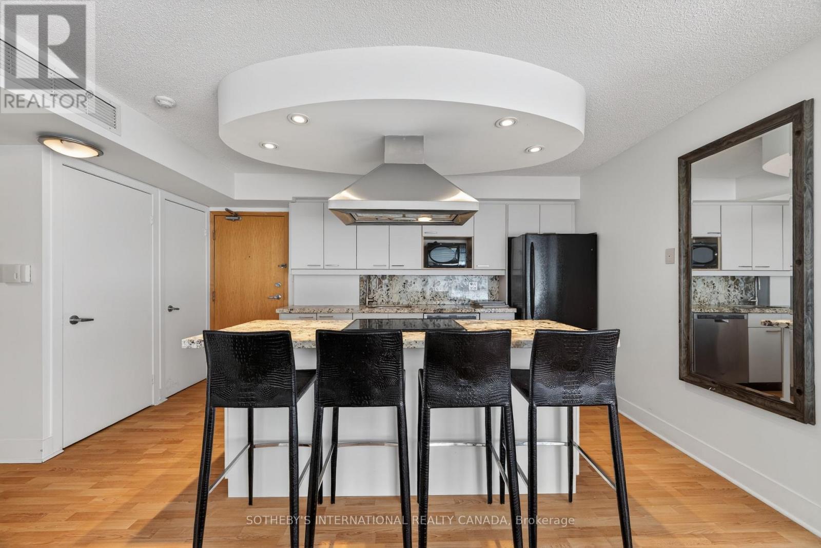 Stunning Waterfront Living! Bright & stylish furnished suite with gorgeous Lake Ontario views. This beautifully appointed 2-bedroom, 2-bathroom residence offers approximately 800 sqft. of thoughtfully designed living space in Toronto's vibrant Harbourfront community. Enjoy southwest views and glowing sunsets through expansive oversized windows that fill the open-concept living and dining area with natural light. The modern kitchen features sleek cabinetry, ample counter space, and a central island with breakfast bar, complemented by a built-in glass cooktop and upgraded oversized range hood. Custom blinds and smart storage solutions throughout -including a built-in closet in the primary bedroom - add both style and function. Situated in a quiet, well-maintained building with 24-hour security and concierge, directly across from the Music Garden, marina, and scenic waterfront trails for walking and cycling. Steps to transit, dining, shops, and entertainment, this suite offers the perfect blend of tranquility and urban convenience. Parking and locker included - also available short-term. (id:4555)