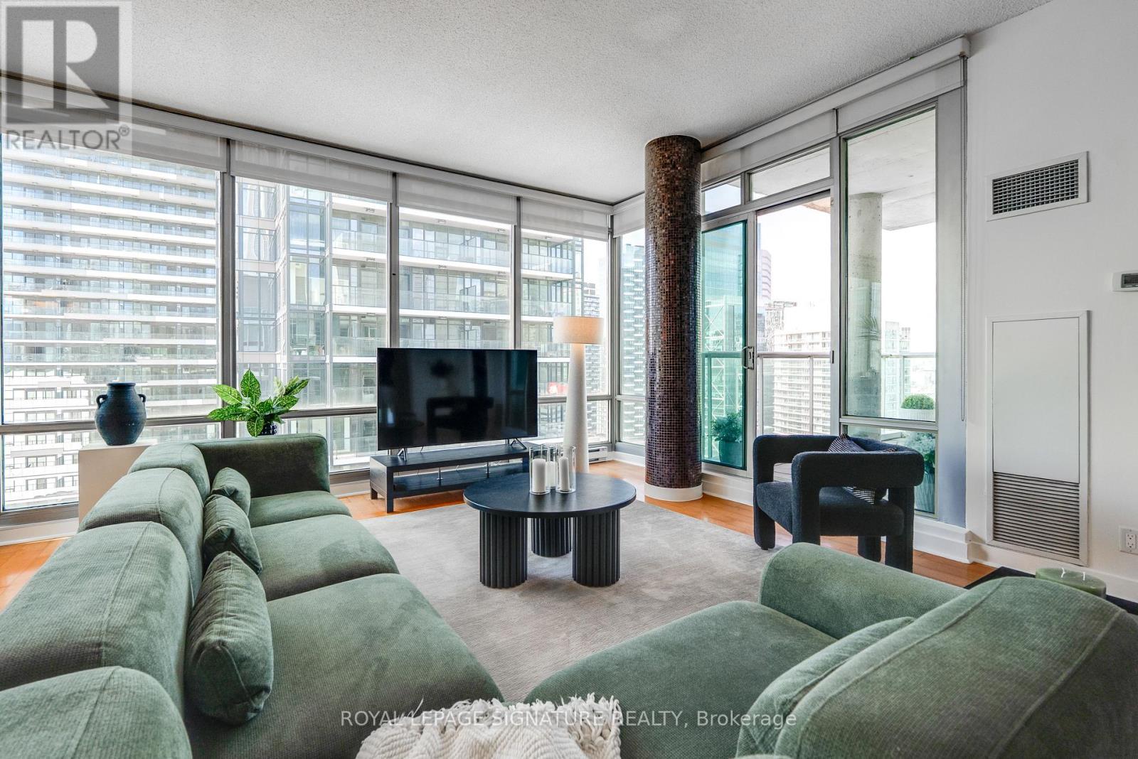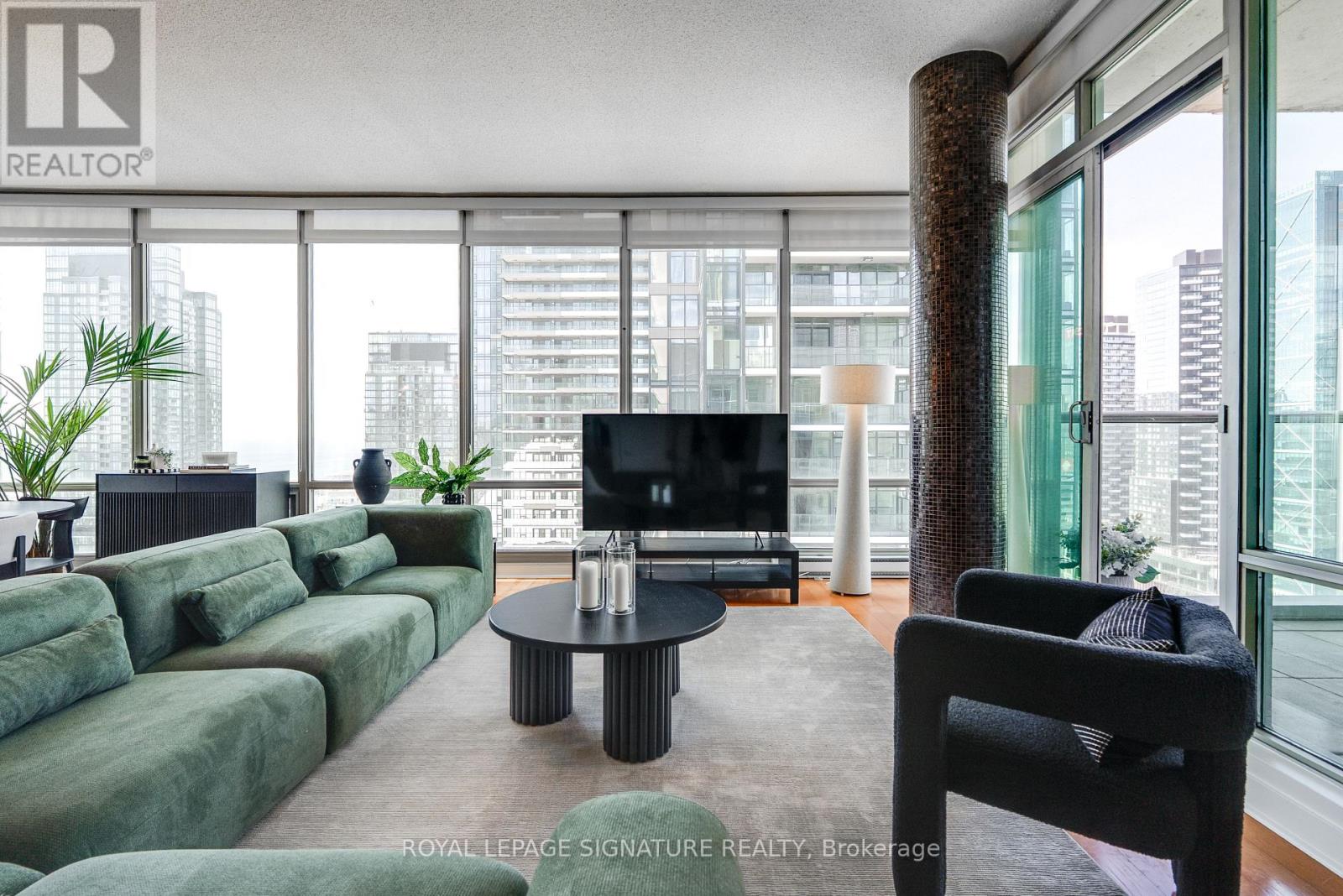 Penthouse living by the waterfront. Welcome to this rare 1,412 sq ft top-floor suite in one of Toronto's most established waterfront communities, offering jaw-dropping city skyline, lake, and sunset views, exceptional privacy, and the hard-to-find bonus of 2 parking spaces and 2 lockers on the ground floor. Designed for both comfort and impact, this bright, open-concept home features 10-foot ceilings, floor-to-ceiling windows, a spacious entryway, and an open kitchen with centre island and abundant storage. With 3 generous bedrooms, 3 bathrooms, the layout offers the kind of scale and flexibility rarely found in condo living. Enjoy a full suite of premium amenities including an indoor pool, jacuzzi, saunas, gym, guest suites, party room, theatre, rooftop garden, BBQ area, 24-hour concierge and visitor parking. Set in the heart of Toronto's vibrant waterfront, you're just moments from the CN Tower, Rogers Centre, Ripley's Aquarium, Union Station, the Financial District, highways, and streetcar access - the perfect blend of luxury, lifestyle, and convenience. (id:4555)