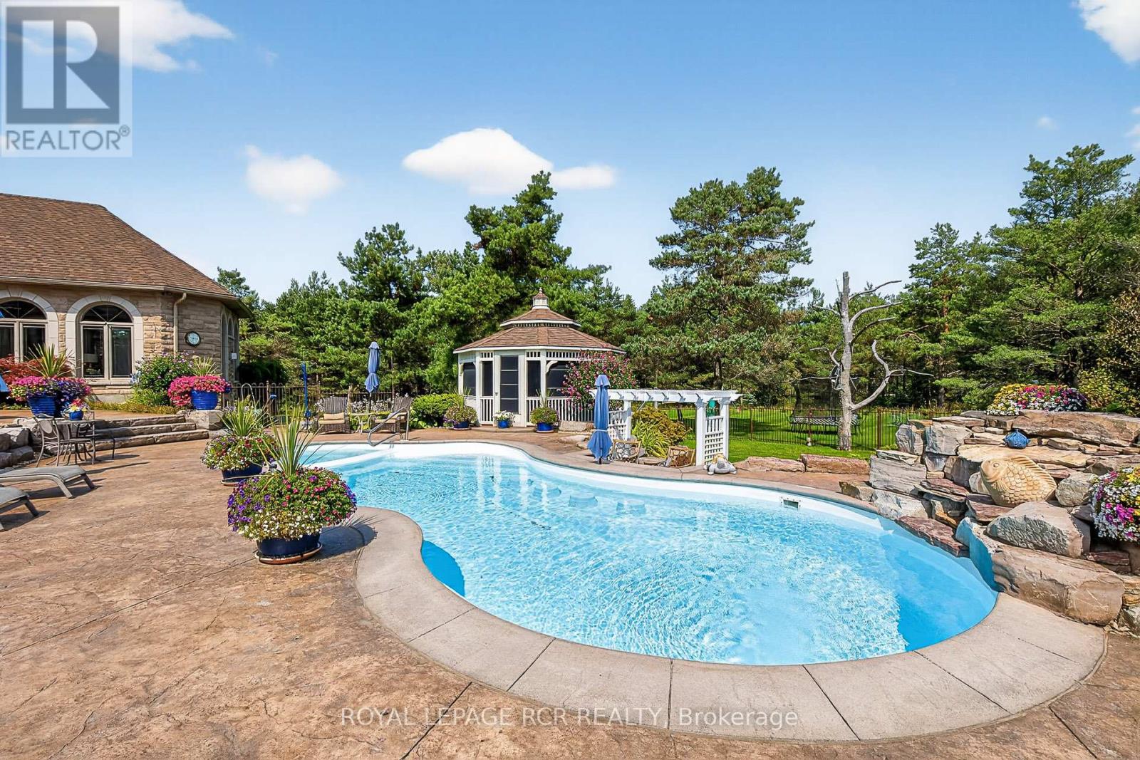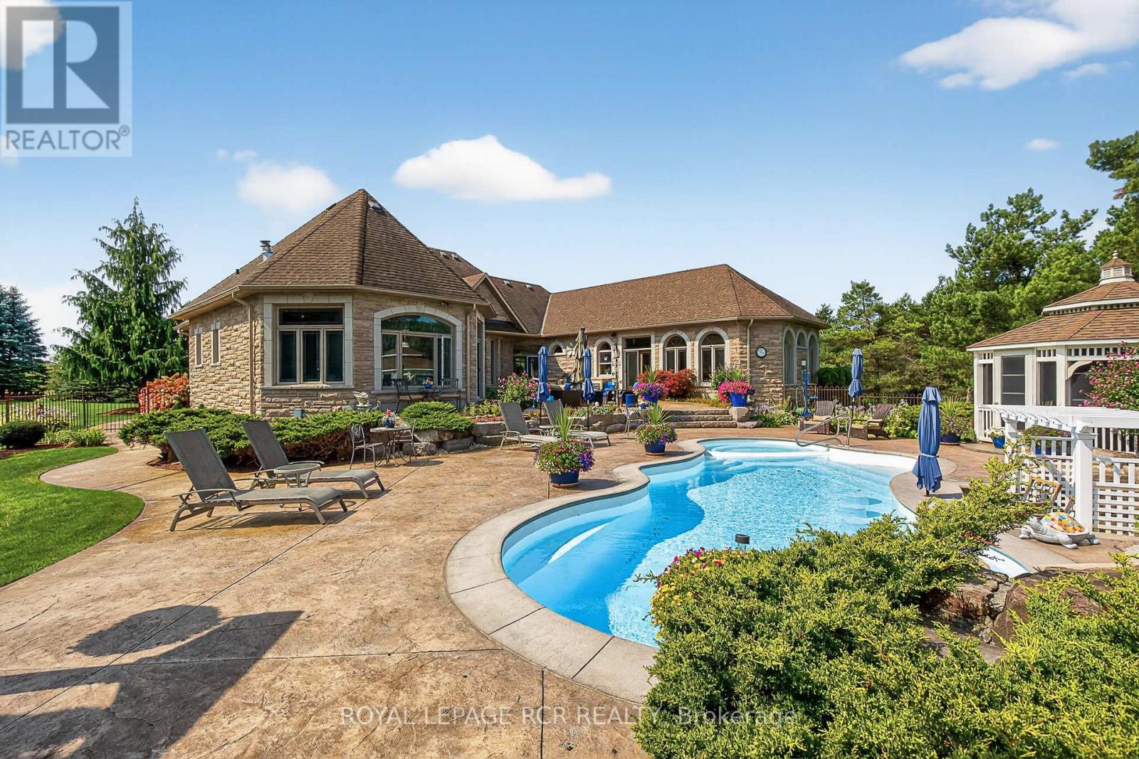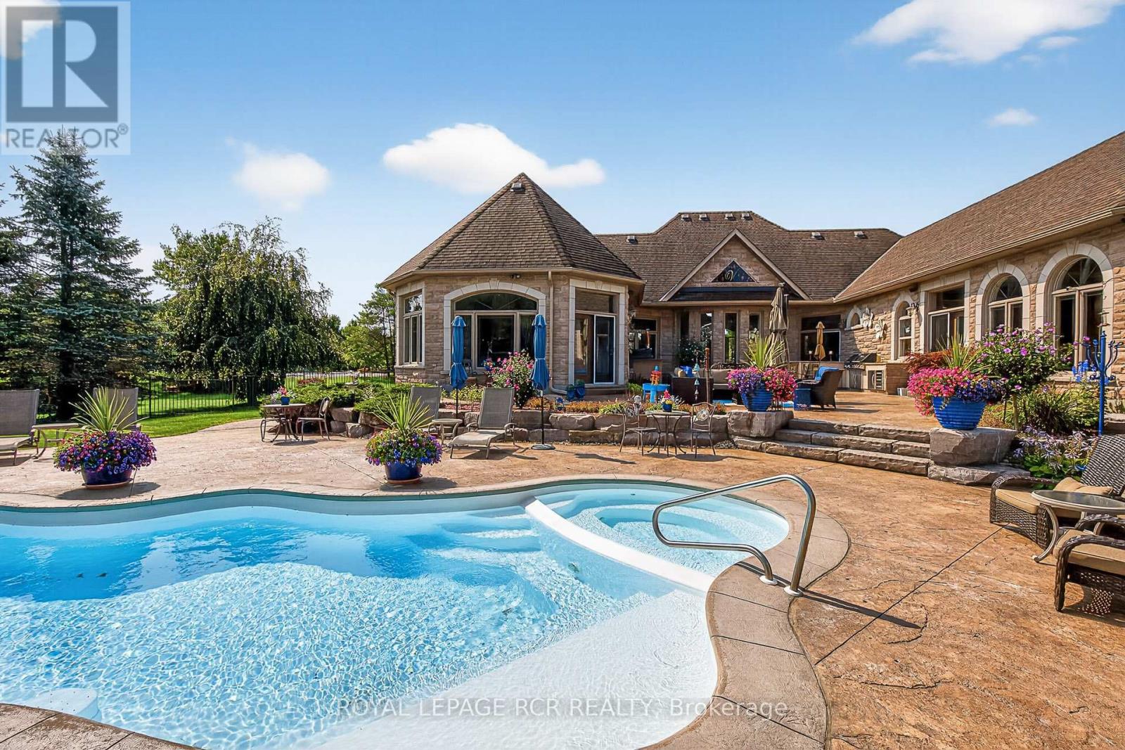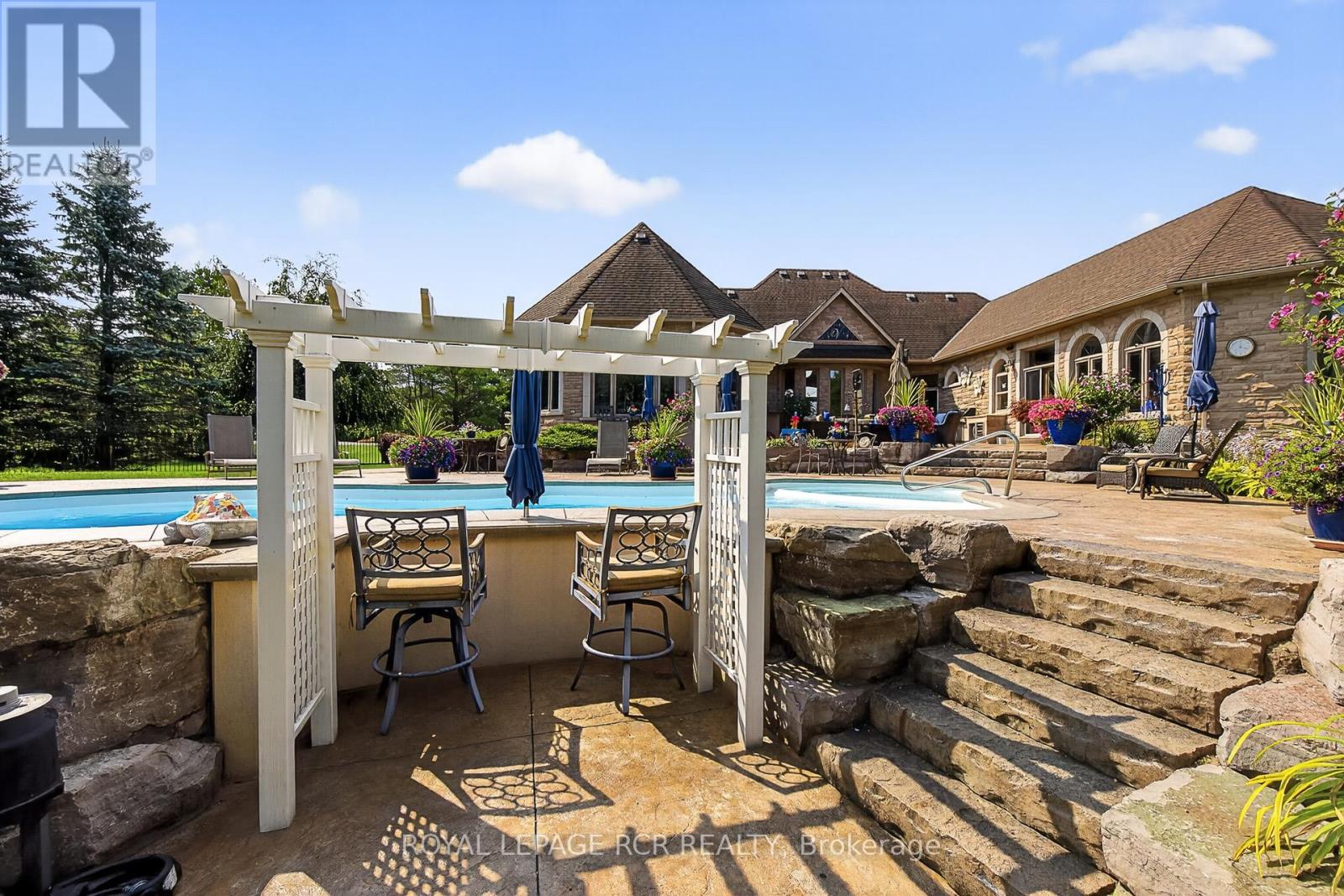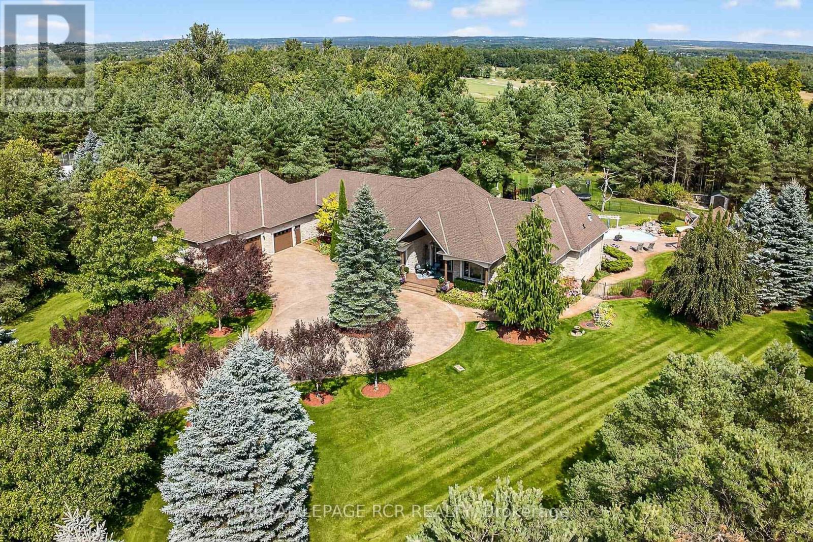 Rare 3923sf Elegant Tuscan Styled Bungalow Estate on a 2.71 acre mature forest lot fabulously located at the end of a quiet court. It is nestled into the prestigious Heritage Hills II enclave, just a couple of minutes south of downtown Uxbridge with direct access to the famous Uxbridge Trails (Country Side Preserve.)This unique architectural beauty surrounds a central back courtyard and is complimented with soaring ceilings, numerous windows, finished basement and 4 car garage. It is nestled into a breathtaking 2.71 acre property backing to forest and the Wooden Sticks Golf Course. This exceptional floor plan is designed for entertaining. The heart of the home is the oversized Tuscan-inspired kitchen, presenting a breakfast bar, a centre island and an entertaining-size huge family room. The sunlit main floor, with numerous walk-outs features, formal dining and living room, library, two wings with primary bedroom suites (which can easily be converted to 3 bedrooms), laundry room and an additional staircase to the basement. The professionally finished basement includes a service kitchen, two bedrooms, two bathrooms, a hobby room, an exceptional wine cellar, custom bar, recreation and games room, and ample storage space. The magnificent resort style backyard paradise with mature trees, formal landscaping, several walk-ways, symmetrical flower beds and manicured hedges has been exceptionally planned and maintained. Enjoy all the vacation features of a free-form inground pool with built-in bar, waterfall, gazebo, pool house with bar, outdoor kitchen, central court yard, lazy river stream, volleyball court, horseshoe pit, vegetable garden, firepit and forest trail. The Heritage Hills Residents often walk or ride into Town through the scenic trails. Welcome to Paradise! **EXTRAS** Fibre Optic Internet. Generator, inground sprinklers, heated floors in 2 basement bedrooms and 4 pc bath, jacuzzi tubs in Primary bath & basement bath. Gazebo, garden shed, pool house. (id:4555)